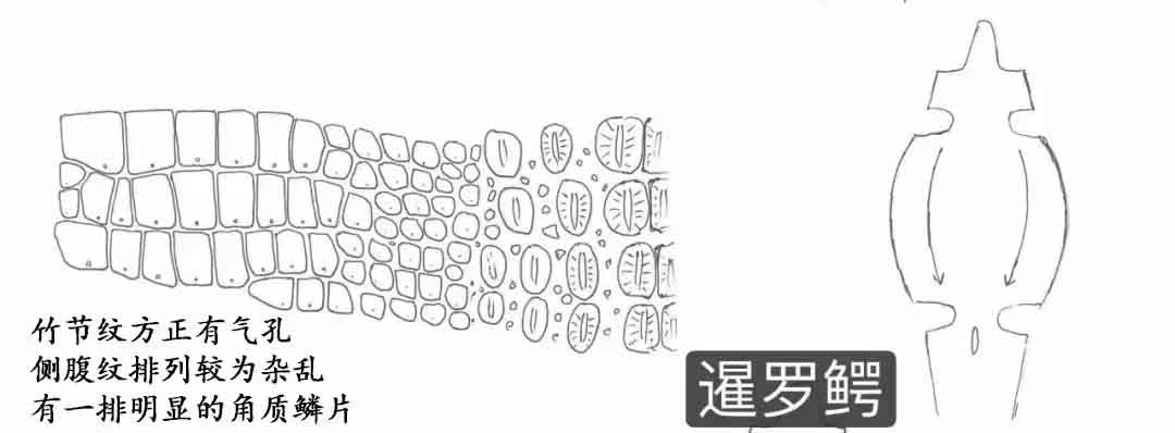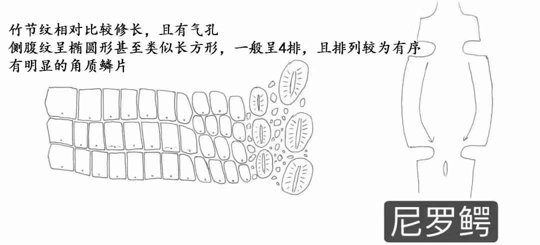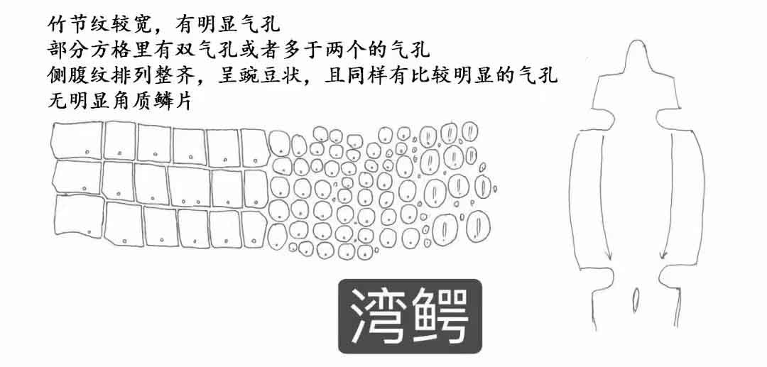 湾鳄:最大的鳄鱼种类,纹路均一整齐,竹节纹部分排列最为整齐密集,有细小气孔,躯干部分较为狭长。较为罕见,H家的湾鳄制品极为昂贵