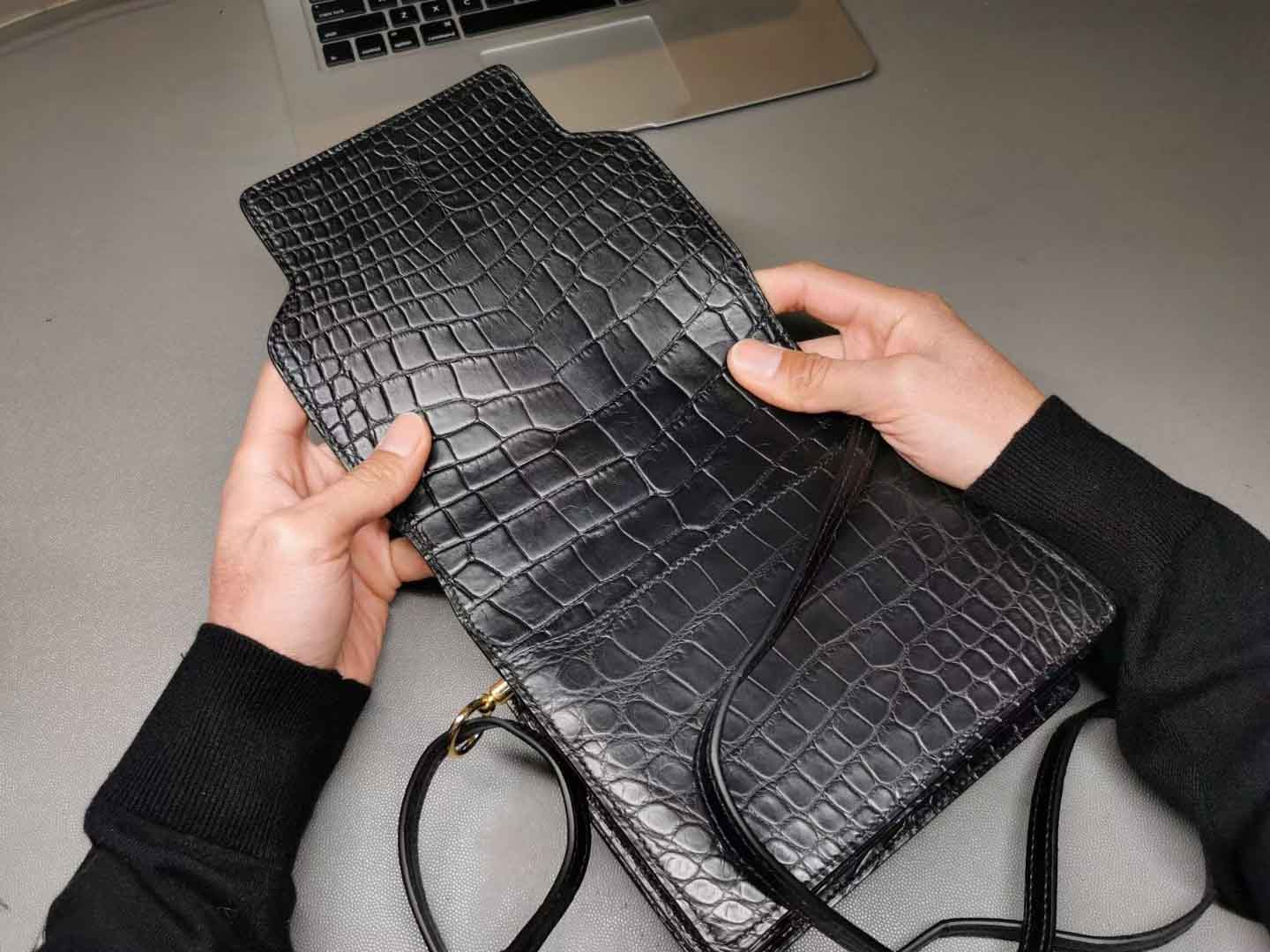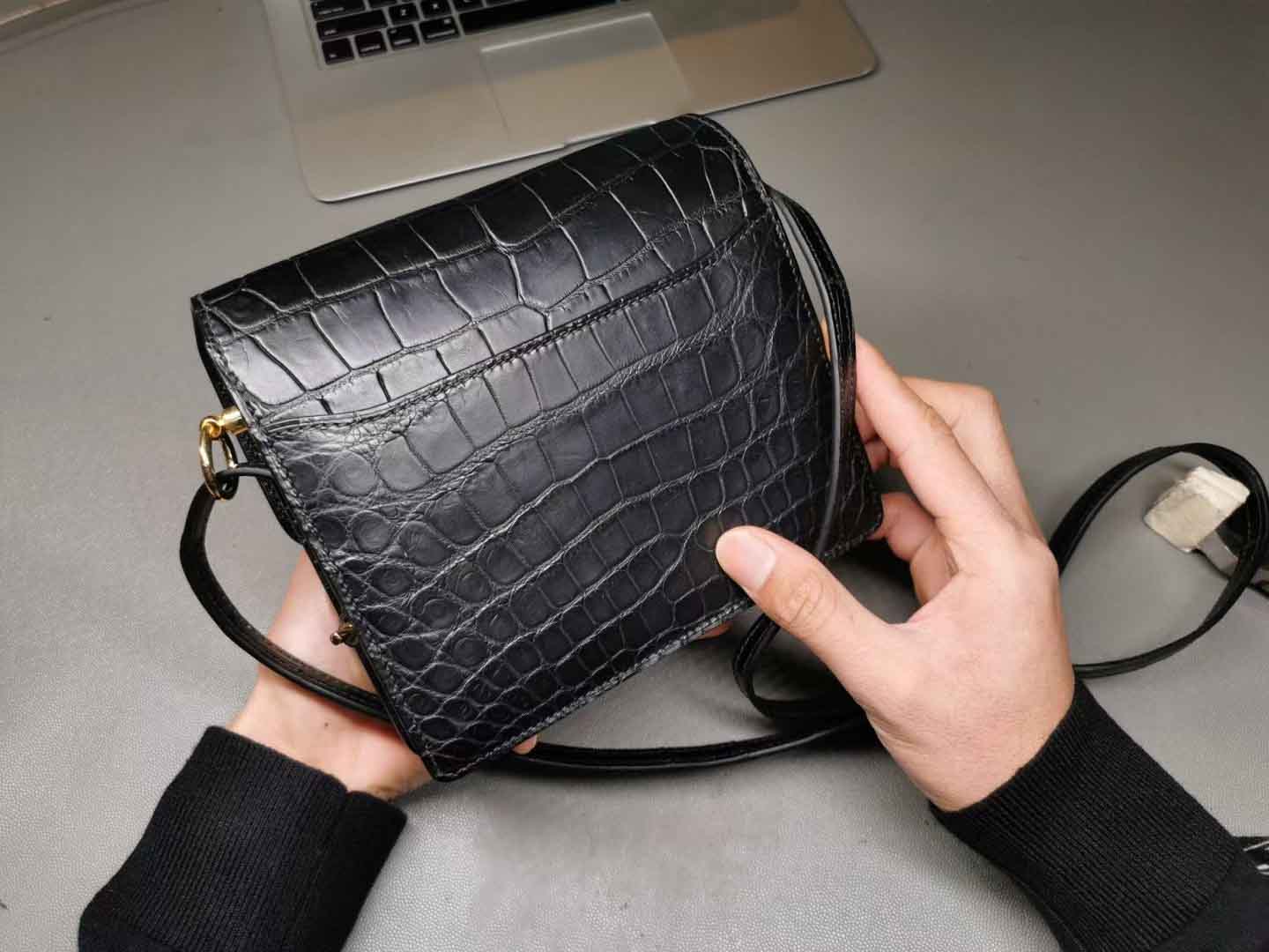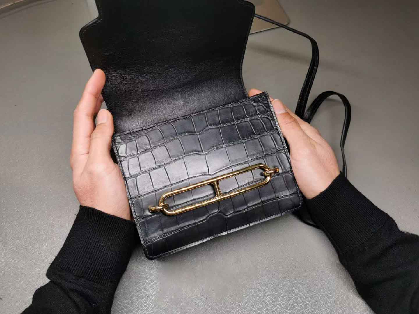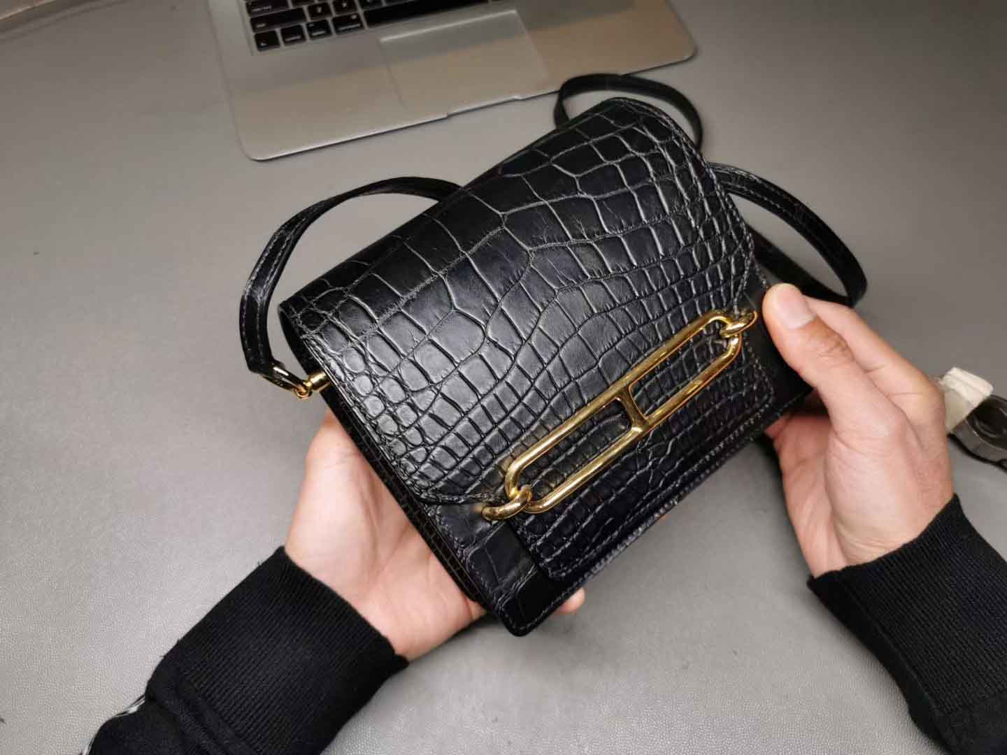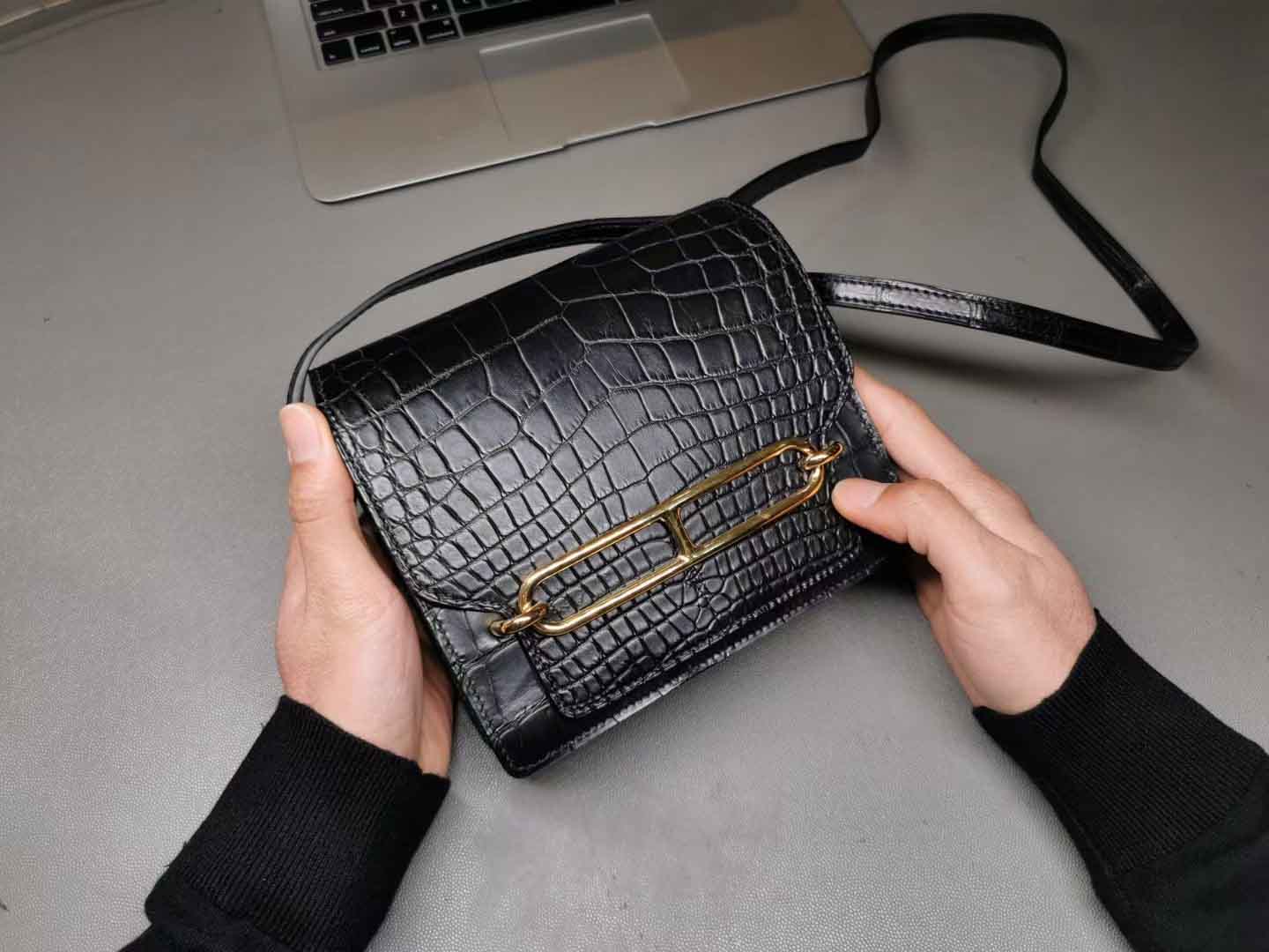 Roulis18,黑色美洲鳄+金扣,通尺寸的小保重,猪鼻的容量仅次于lindy20,多重背法可以解锁,皮面效果还可以,当然和正价的就没办法比了,价格便宜一定是有道理的。