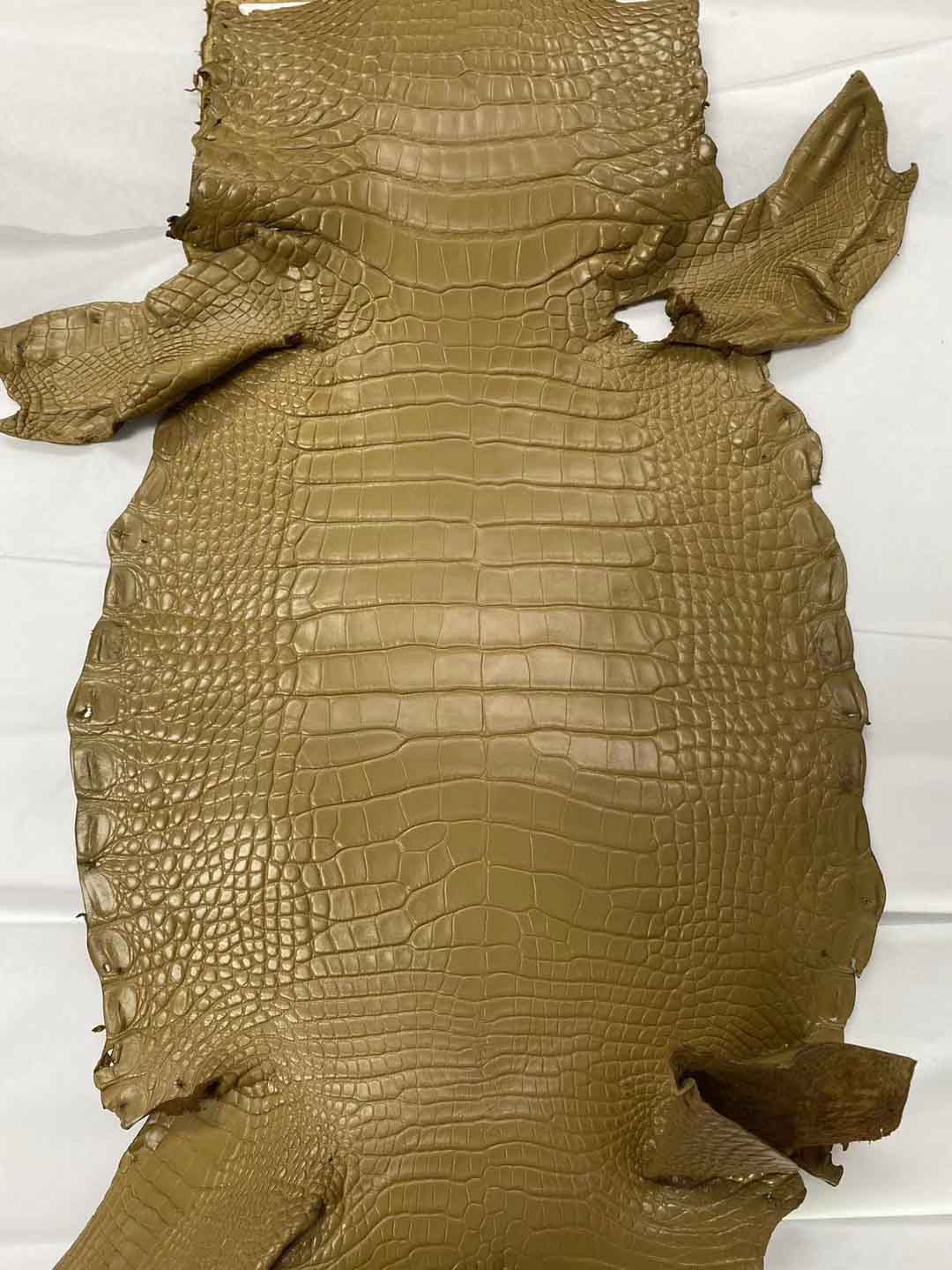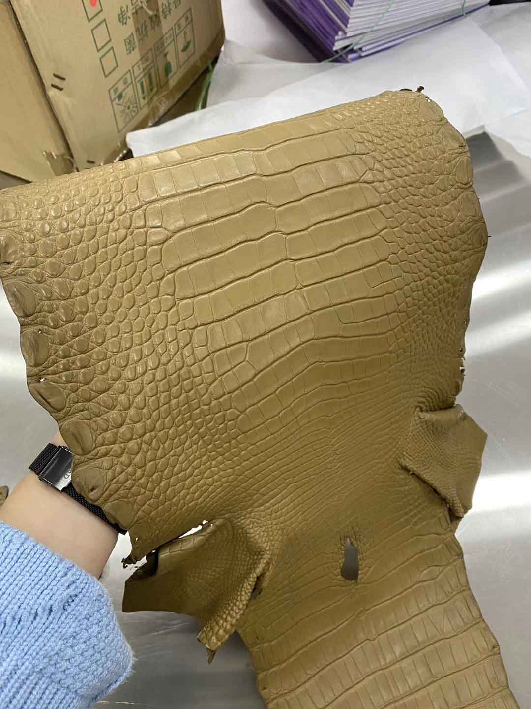 美洲鳄芝麻色鳄鱼皮料,一般是由I,II,III,IV的等级划分,I级皮是最高级,意味着腹部伤疤最少,纹理排列最均匀,但价格最高。II级皮有细微瑕疵,有时候不仔细看也看不出来,III,IV就有明显伤疤或者纹理不匀。腹部中心很多方格的地方我们大多时候称它叫竹节纹,竹节纹两边稍微细碎一点的纹理被称作侧腹纹。