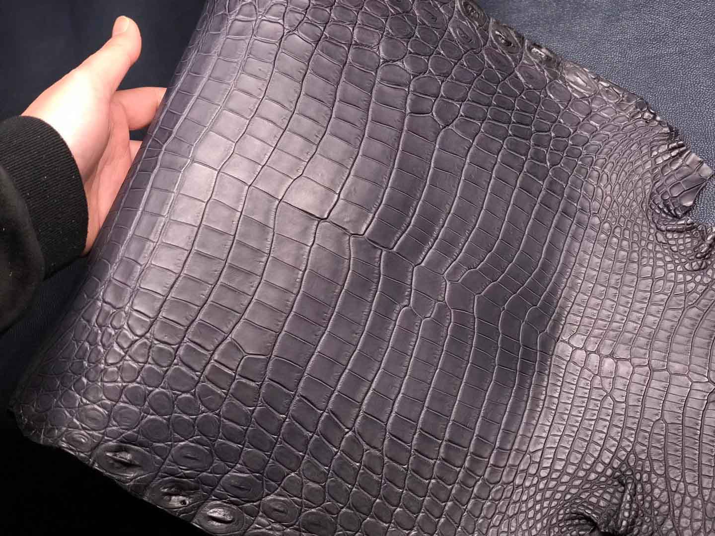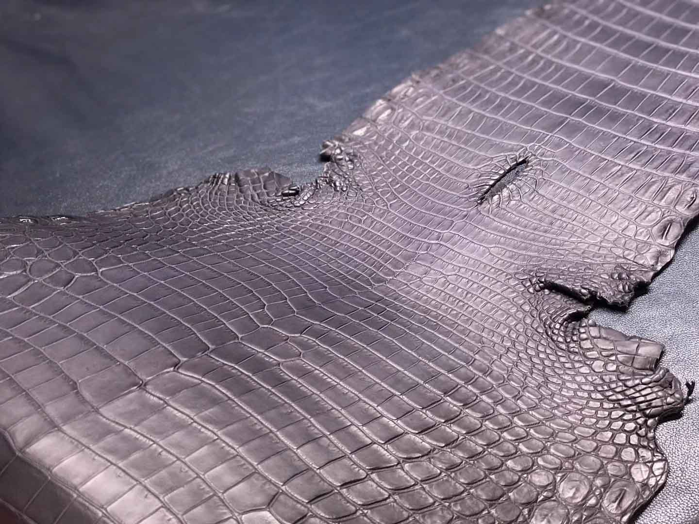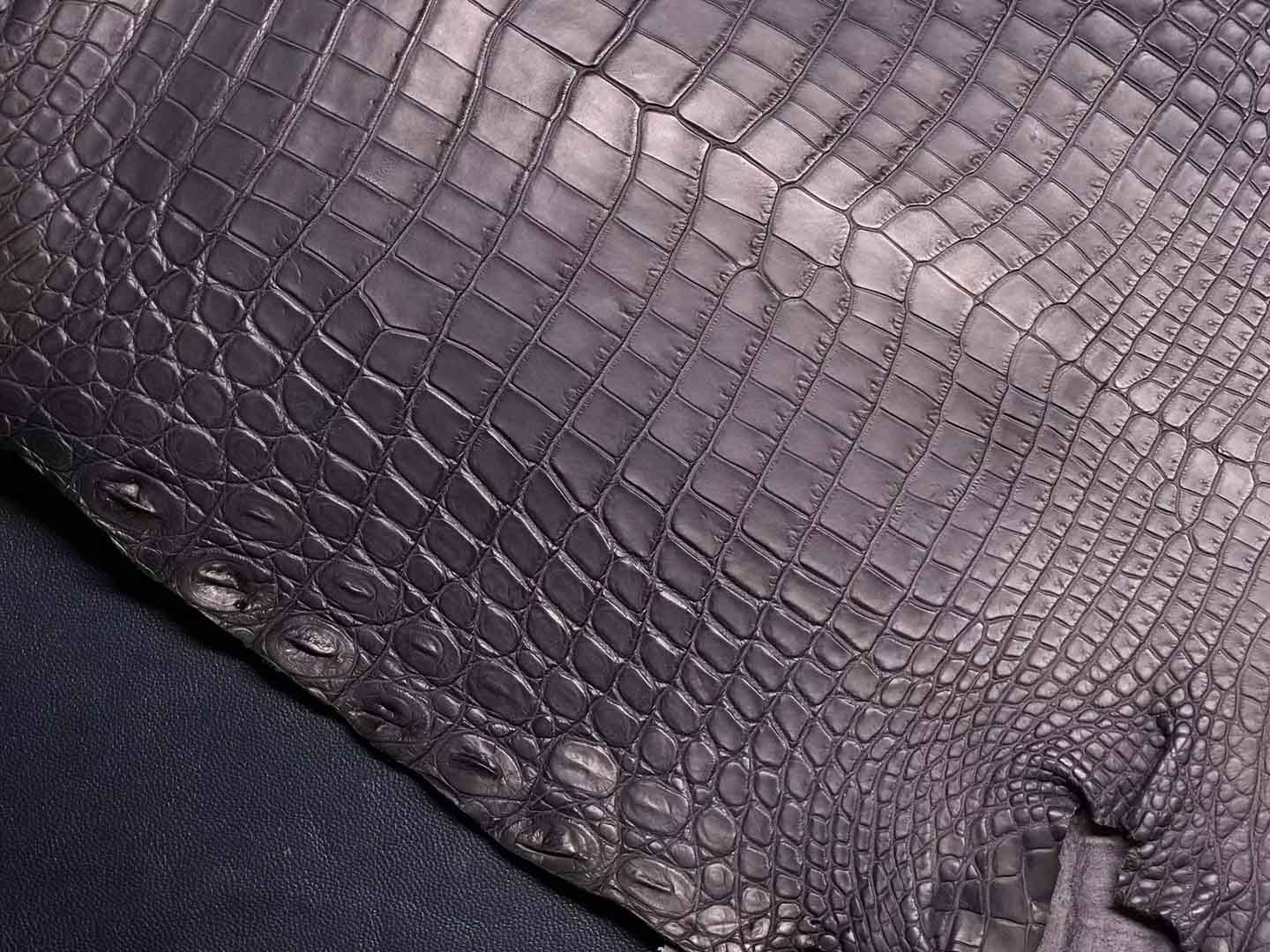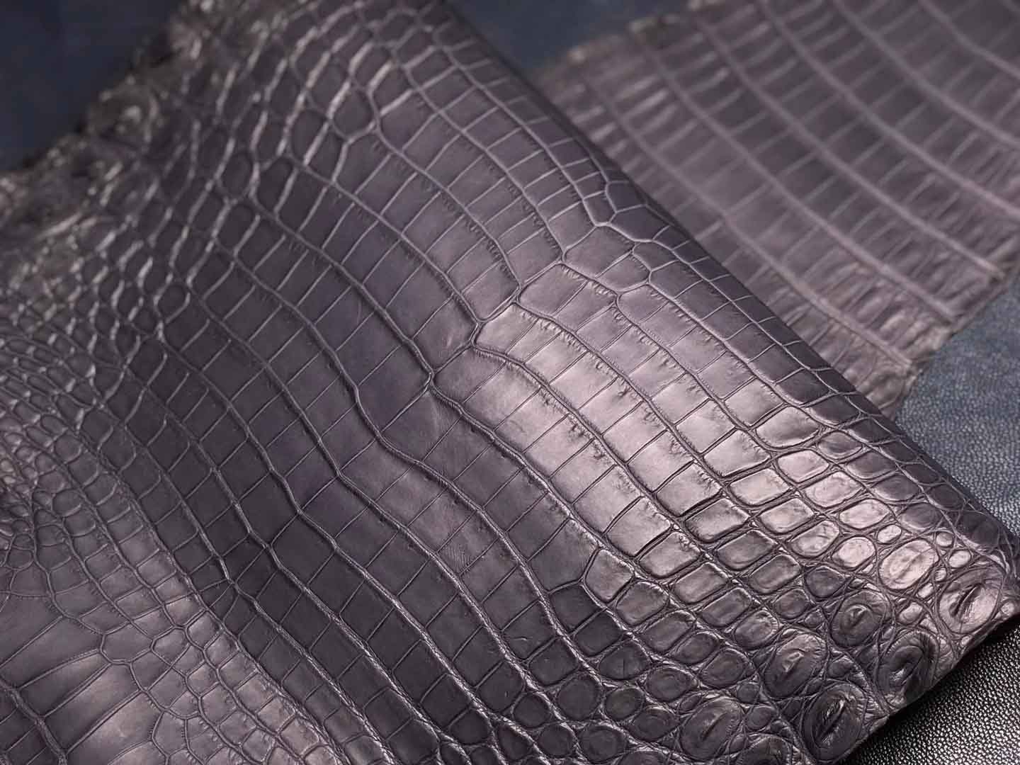 植物侵染出来的颜色,无修补抛光无涂料覆盖,鳄鱼皮的纹理细腻清晰鉴赏,雾面蓝色兴隆款鳄鱼皮定做