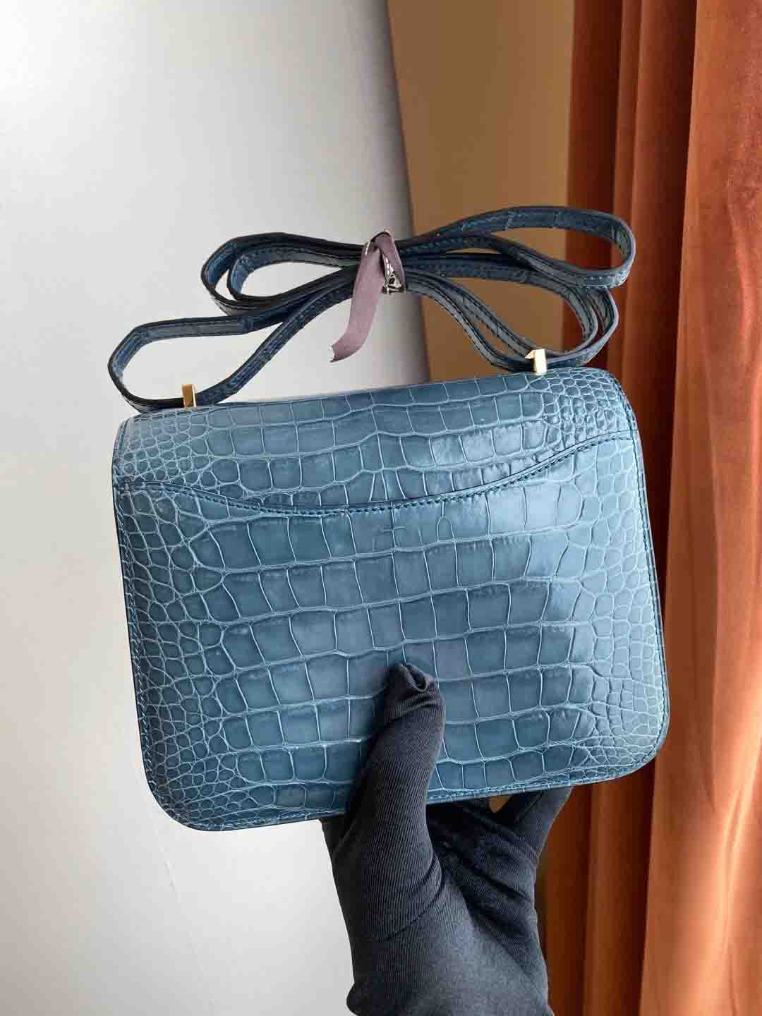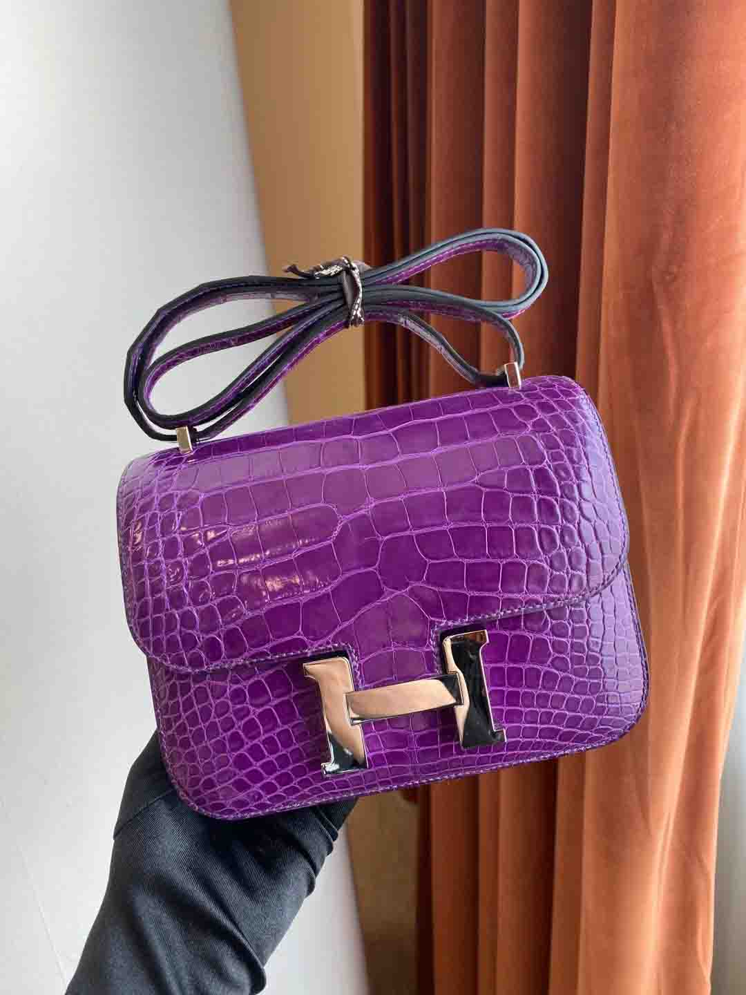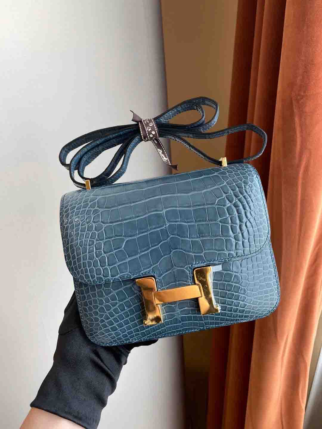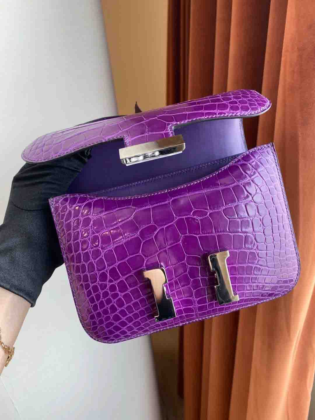 款式:Constance康斯坦包空姐包;材质:原厂御用亮光美洲鳄鱼皮,顶级蜡线,纯手工缝制;尺寸:19cm;五金:金扣;配件:防尘袋;用途:单肩包,斜挎包