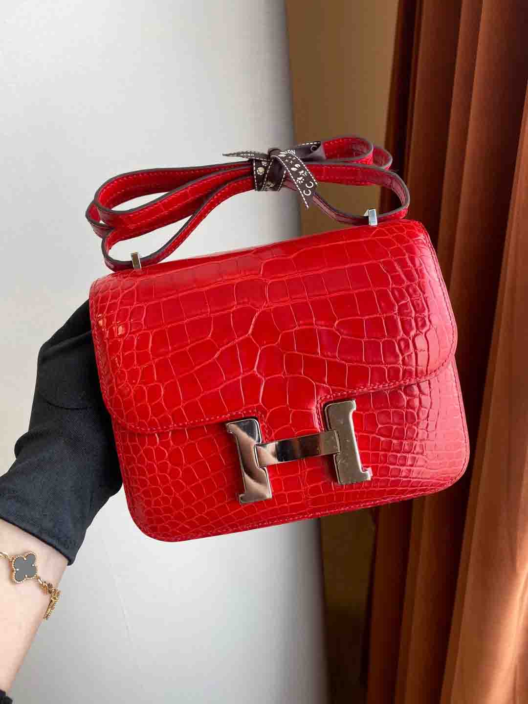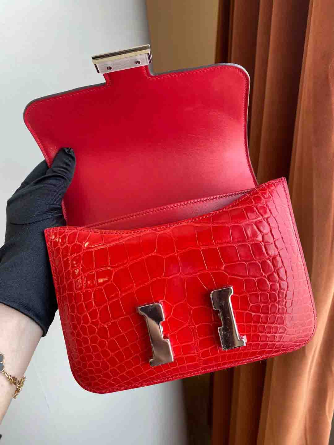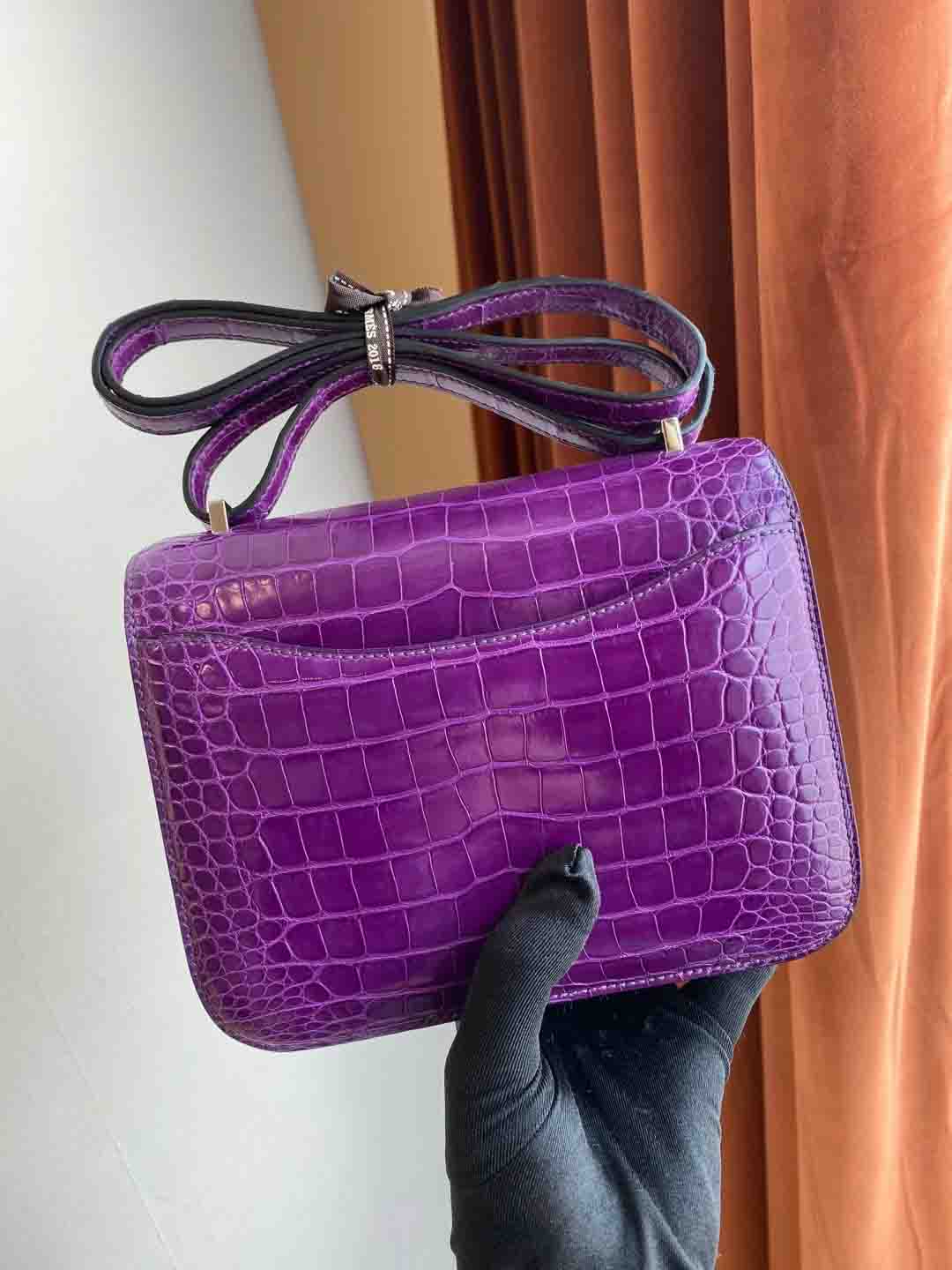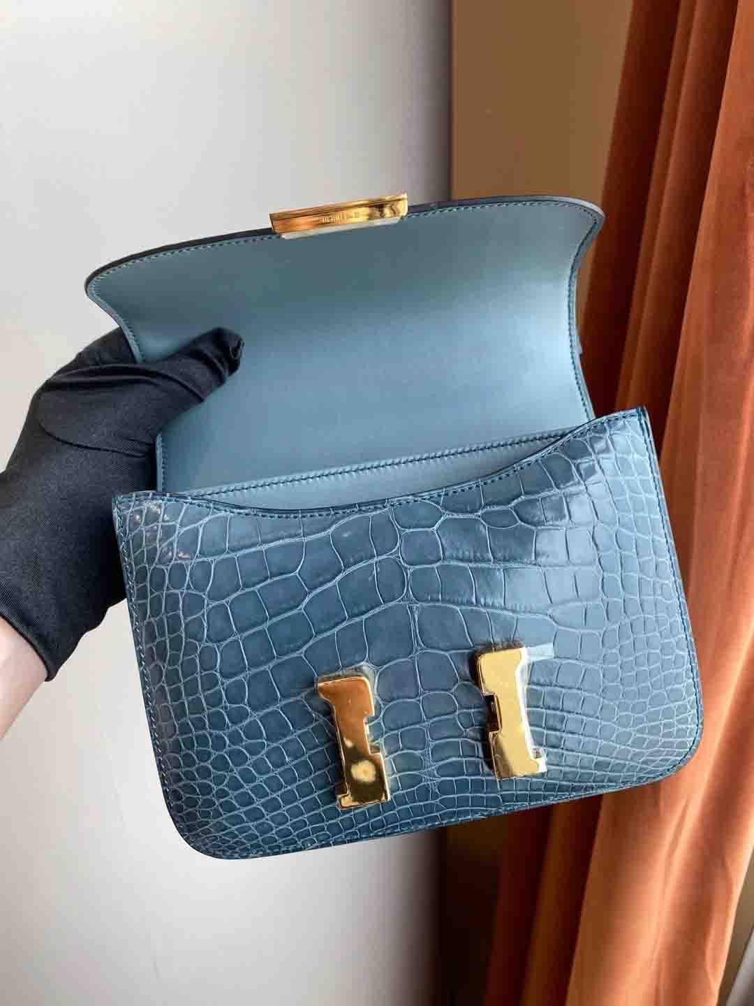 款式:Constance康斯坦包空姐包;材质:原厂御用亮光美洲鳄鱼皮,顶级蜡线,纯手工缝制;尺寸:19cm;五金:金扣;配件:防尘袋;用途:单肩包,斜挎包