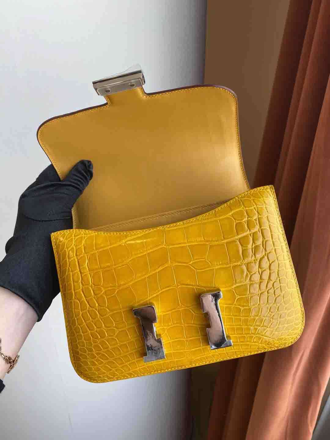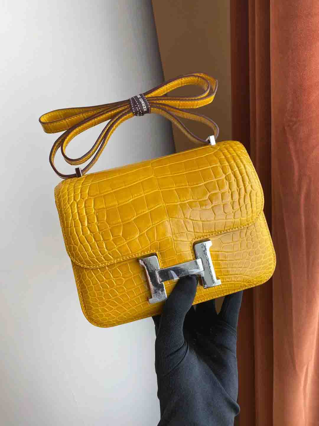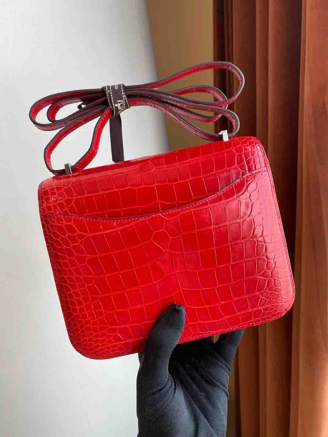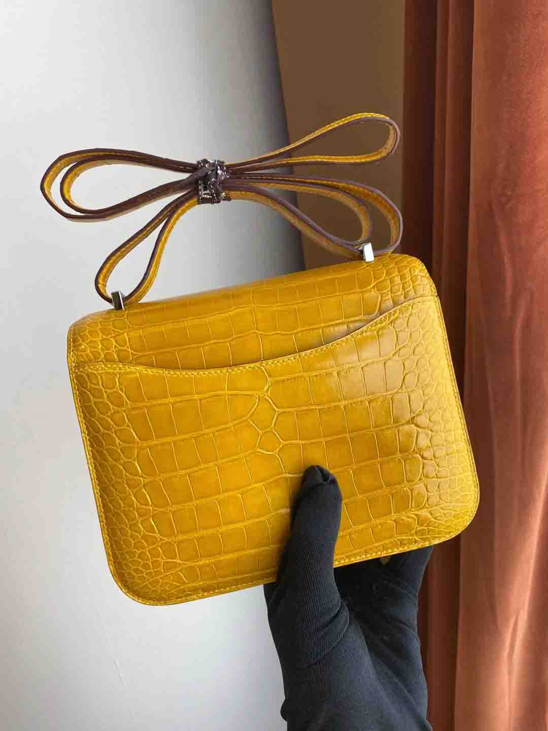 款式:Constance康斯坦包空姐包;材质:原厂御用亮光美洲鳄鱼皮,顶级蜡线,纯手工缝制;尺寸:19cm;五金:金扣;配件:防尘袋;用途:单肩包,斜挎包