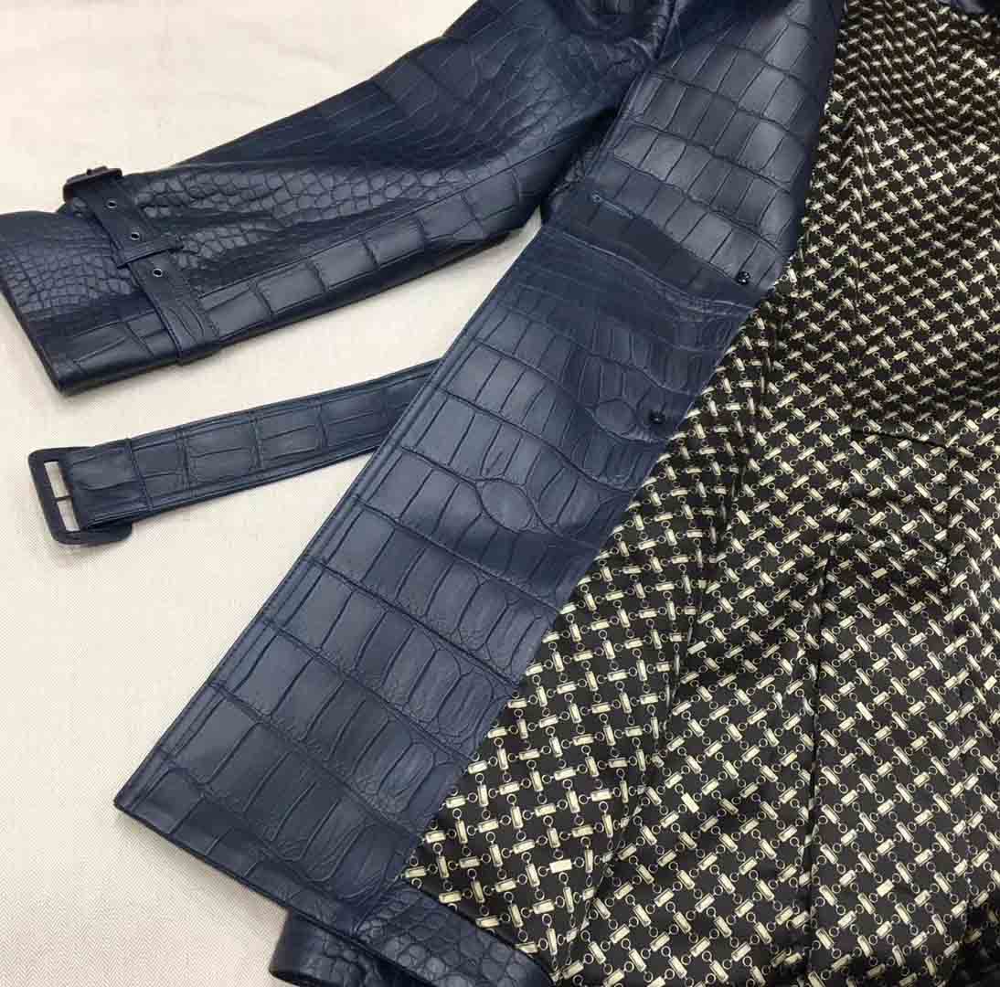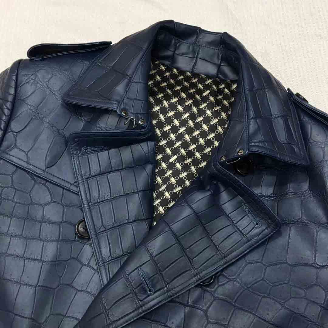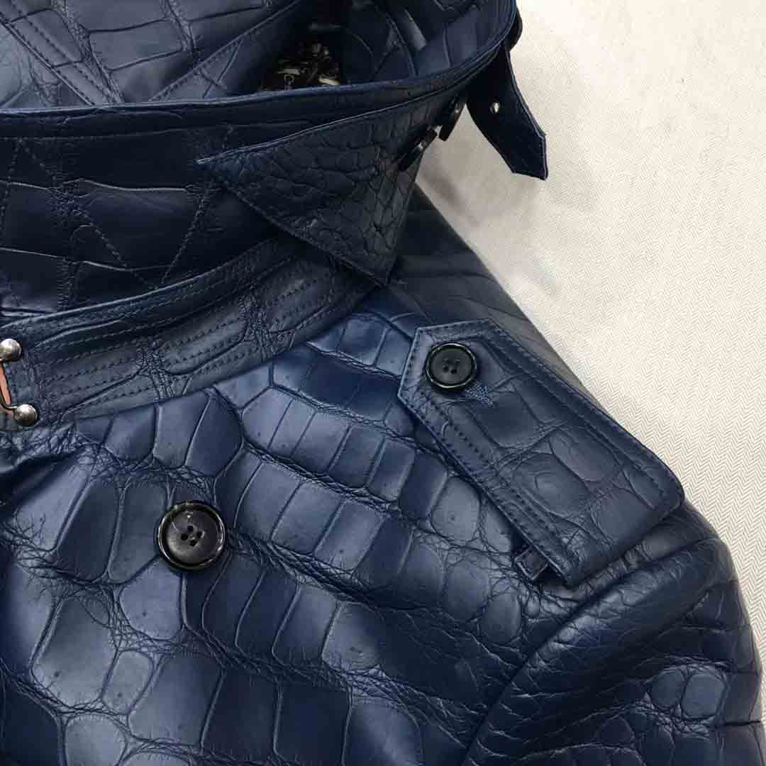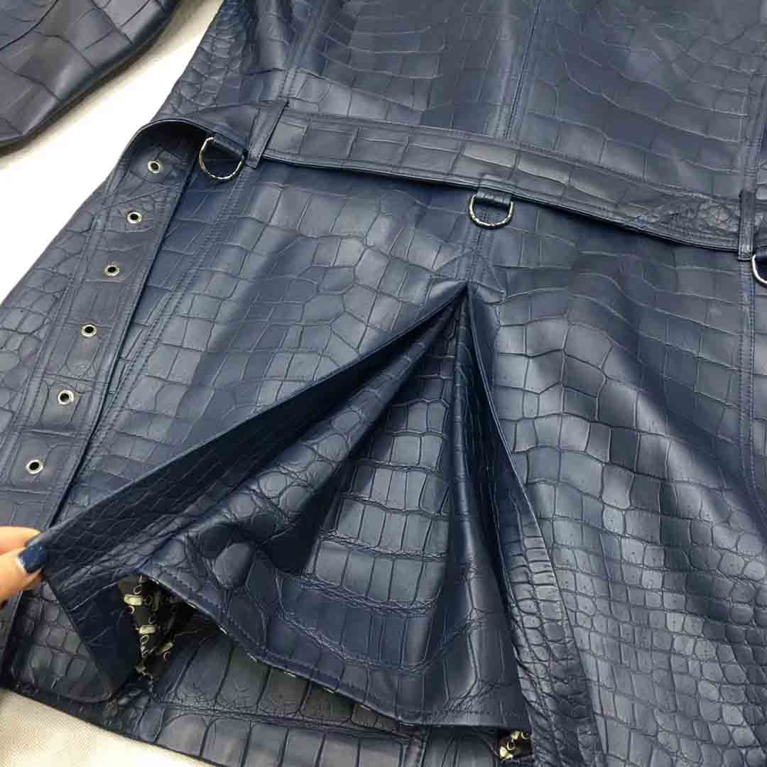 深蓝色鳄鱼皮衣长款风衣