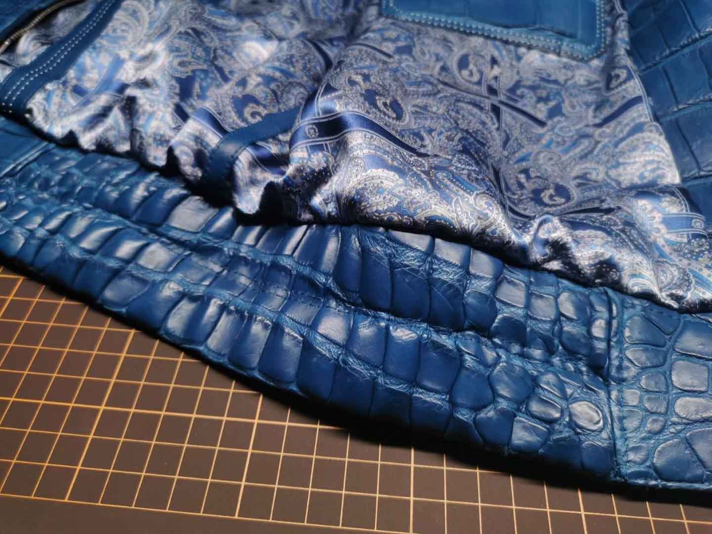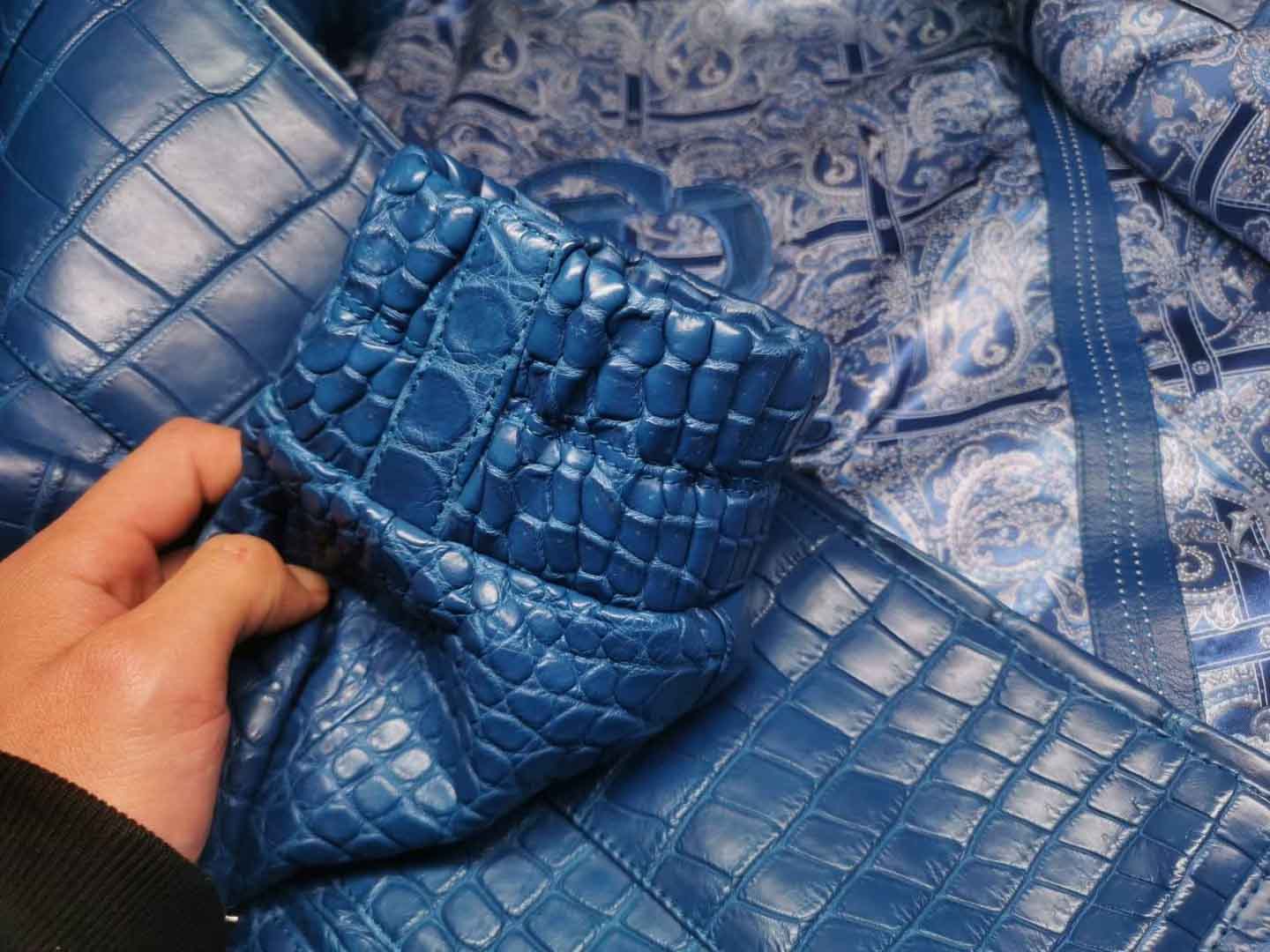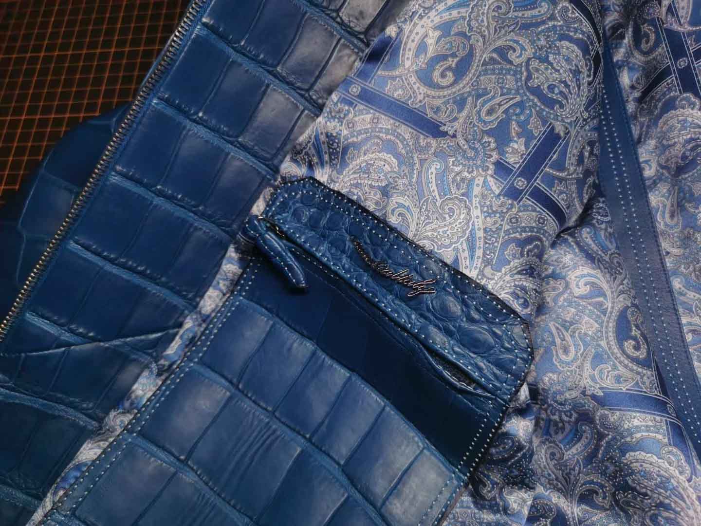 特殊的珠边车线方案,细节做的很完美,特别是袖口和下摆的收口设计很到位,还有就是搭位部分的纹理选择,超级到位。新款蓝色鳄鱼皮皮衣