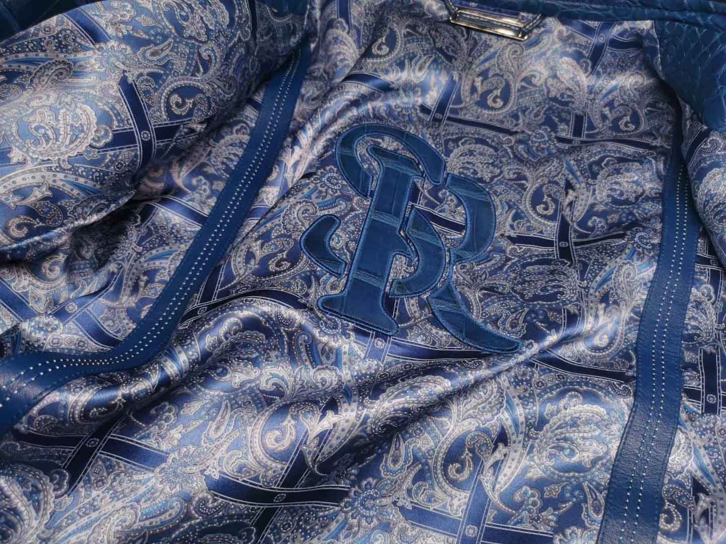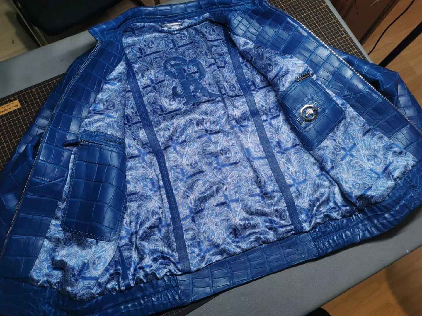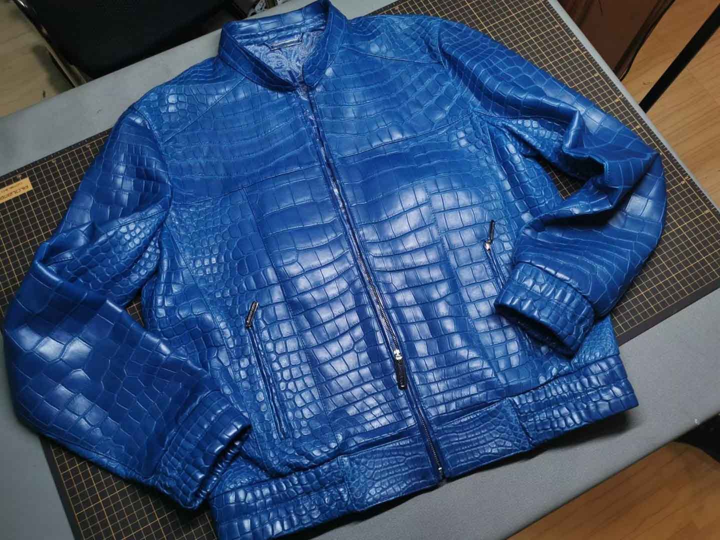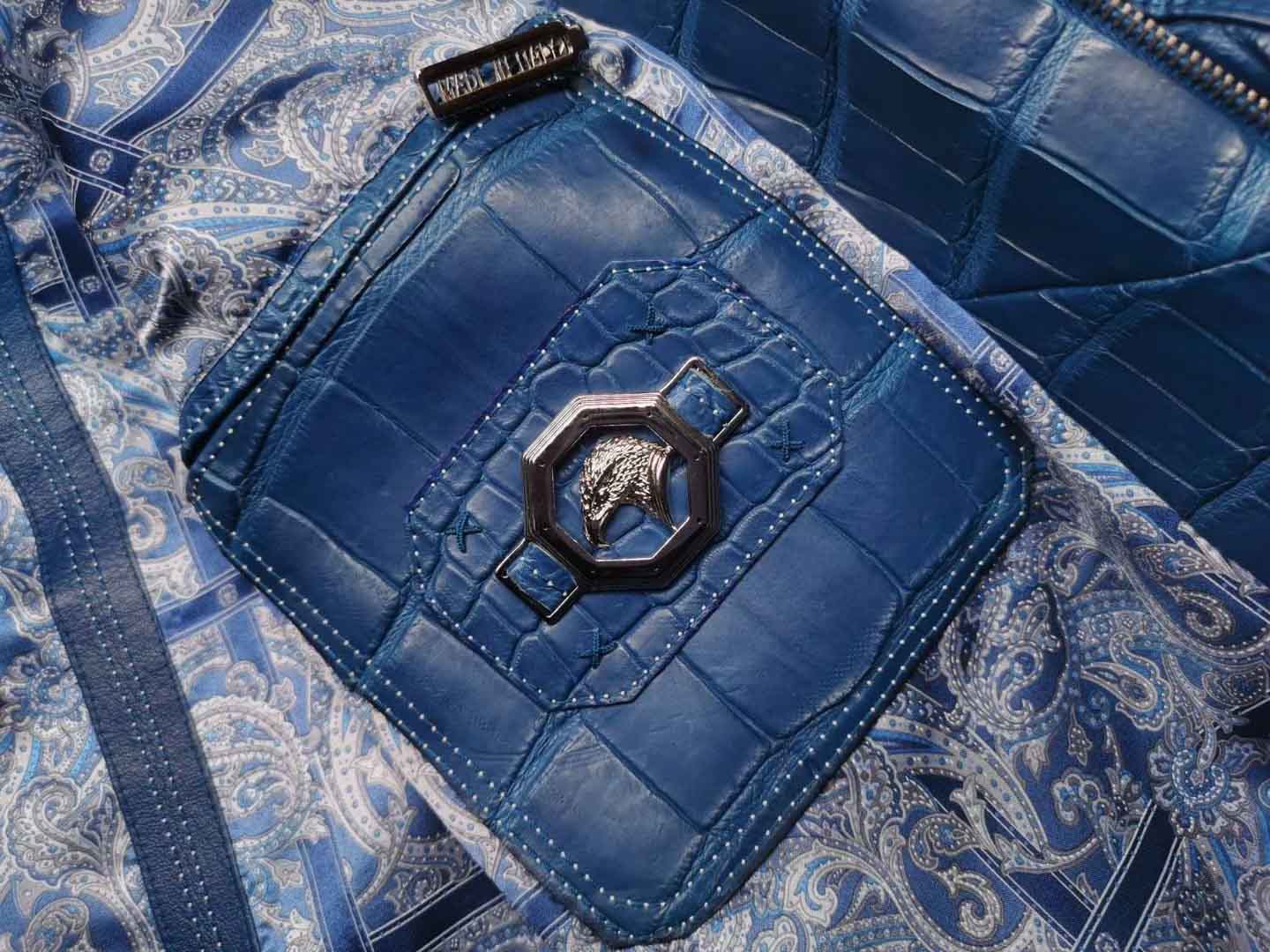 特殊的珠边车线方案,细节做的很完美,特别是袖口和下摆的收口设计很到位,还有就是搭位部分的纹理选择,超级到位。新款蓝色鳄鱼皮皮衣