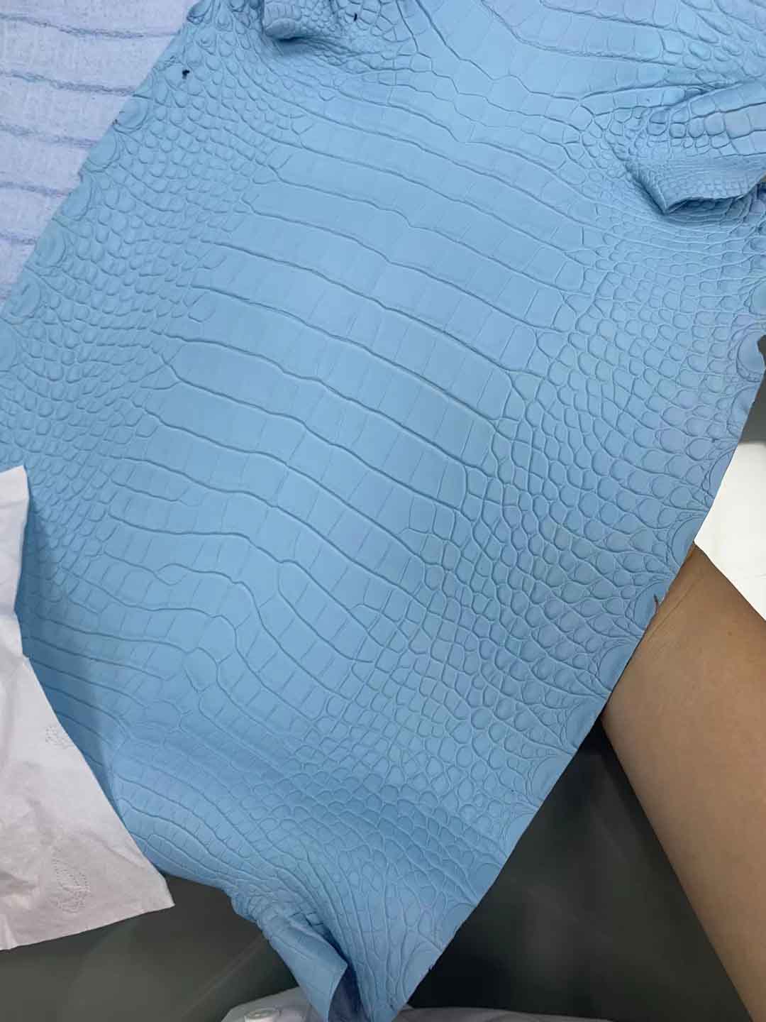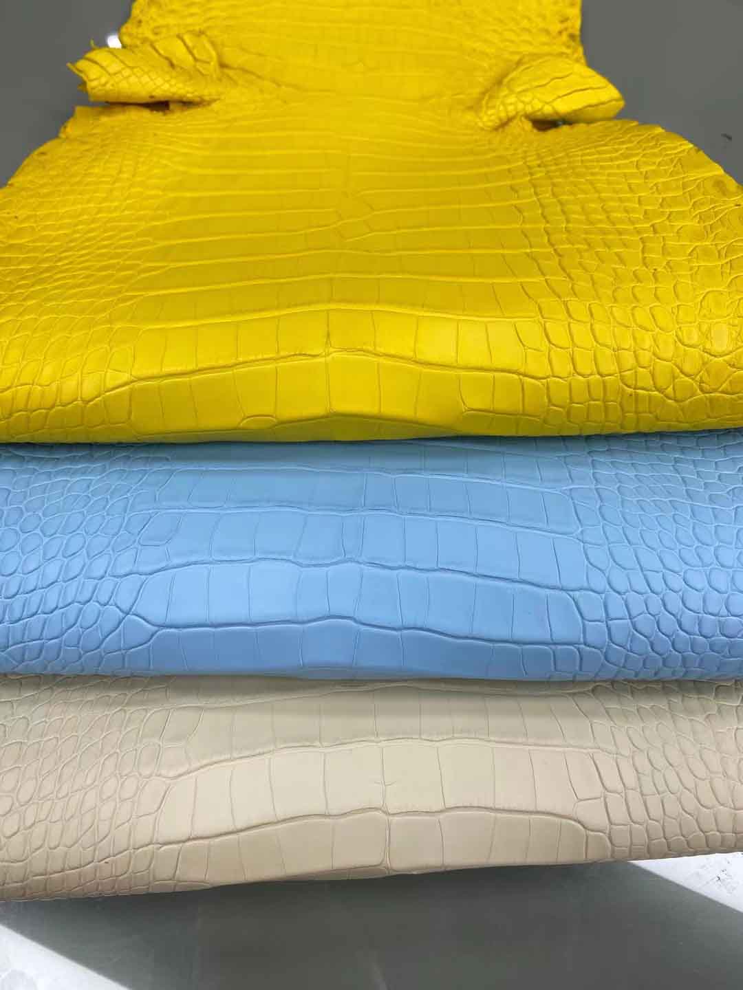 美洲天空蓝、香草色、金盏花黄新料到货。可以定做自己喜欢的美洲鳄皮料颜色,10张起订做。美洲鳄皮具定制厂家专业定做高端私人皮具等皮件。