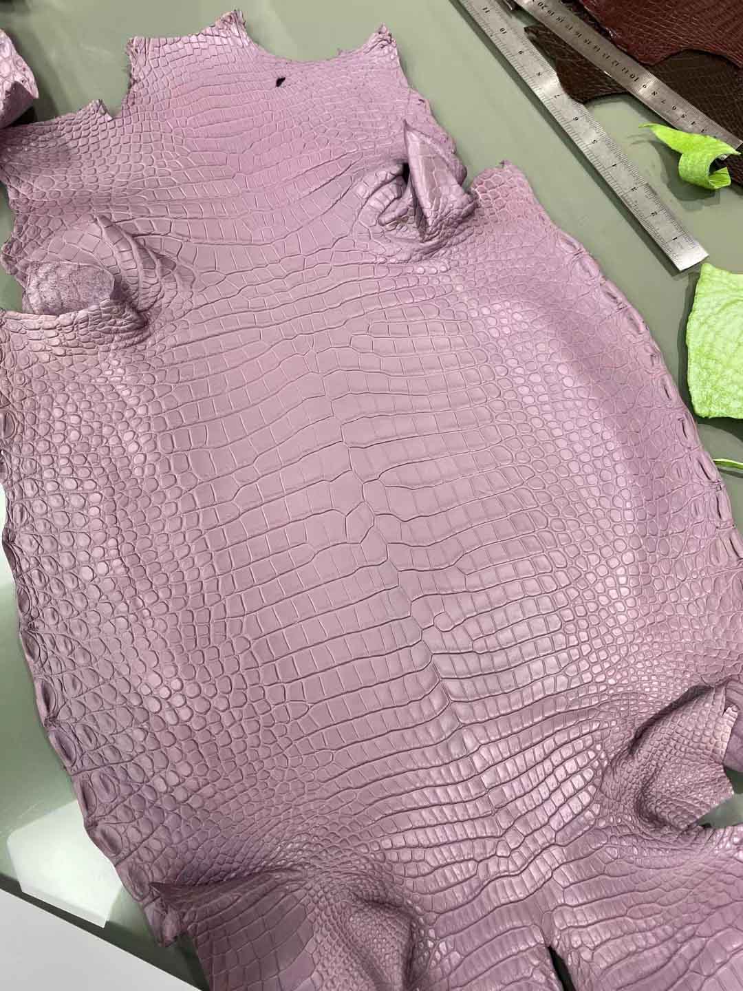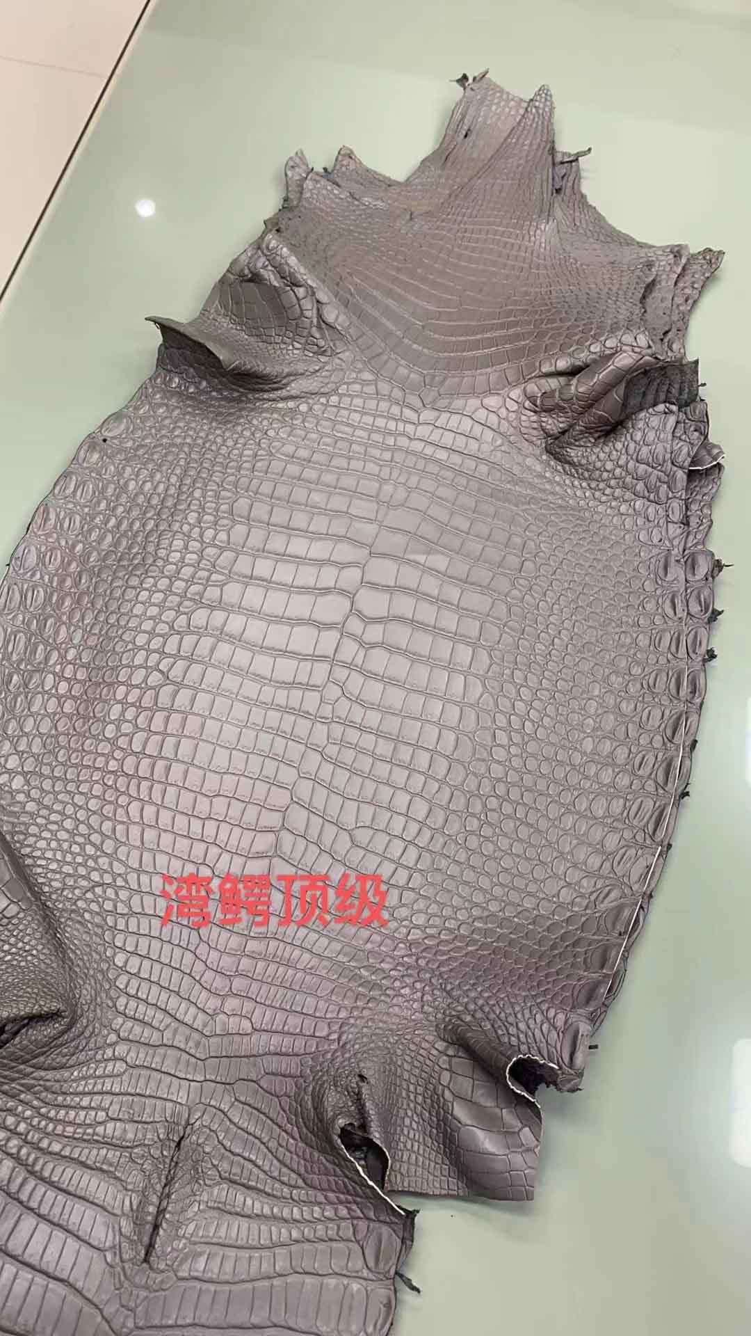 湾鳄新皮料到货定做高端包包,订做私人皮具等奢侈品。雾面湾鳄皮哑光和雾面区别就在于蜡和油脂的比例或反光小颗粒添加量的多少。哑光是相对于雾面来说,雾面是指皮料中有微细的粒子感,很有光泽。而哑光是看上去光泽感不强,但也不是完全没有光泽感,质地较滑腻,主要区别就在这里。
