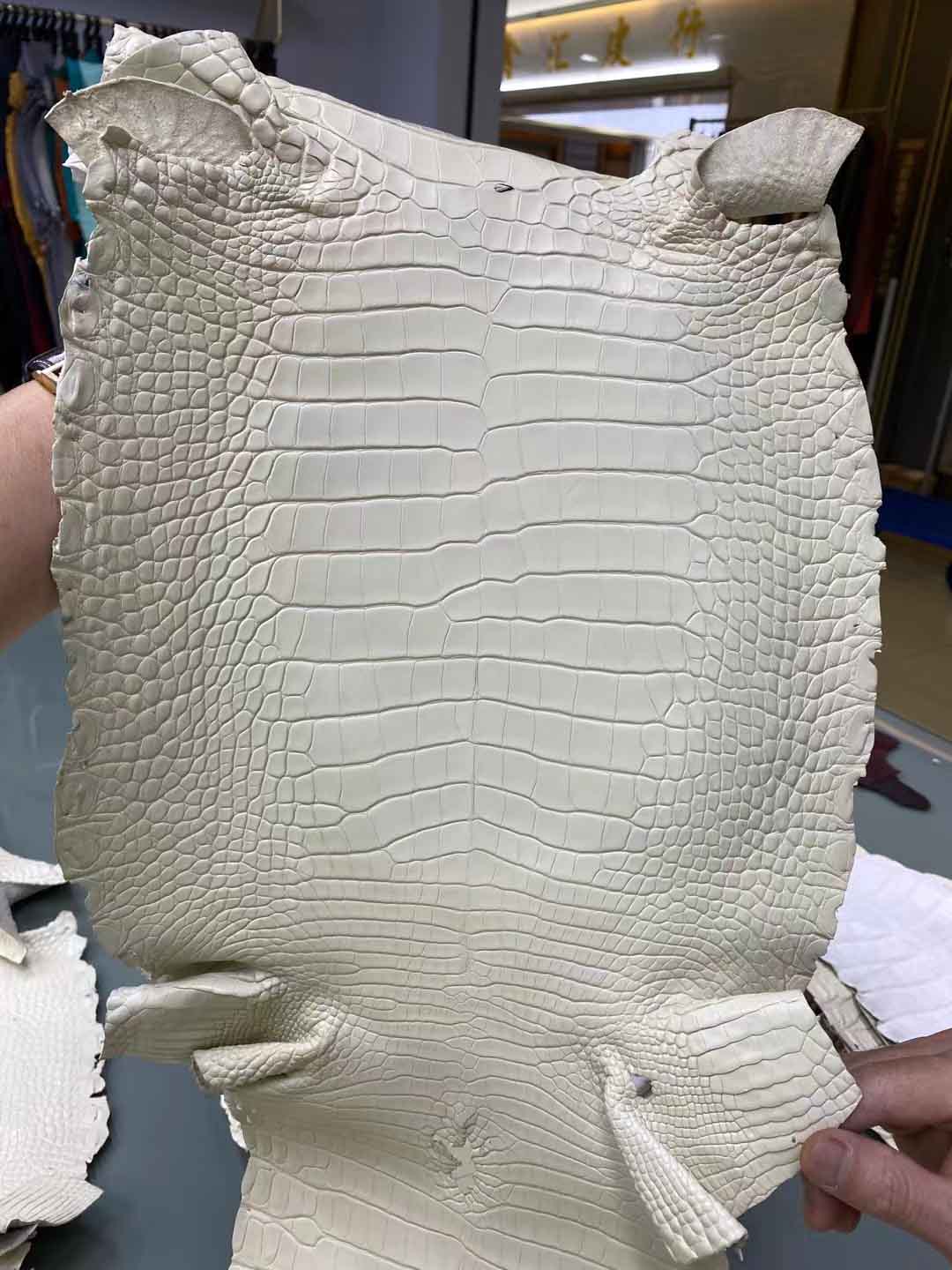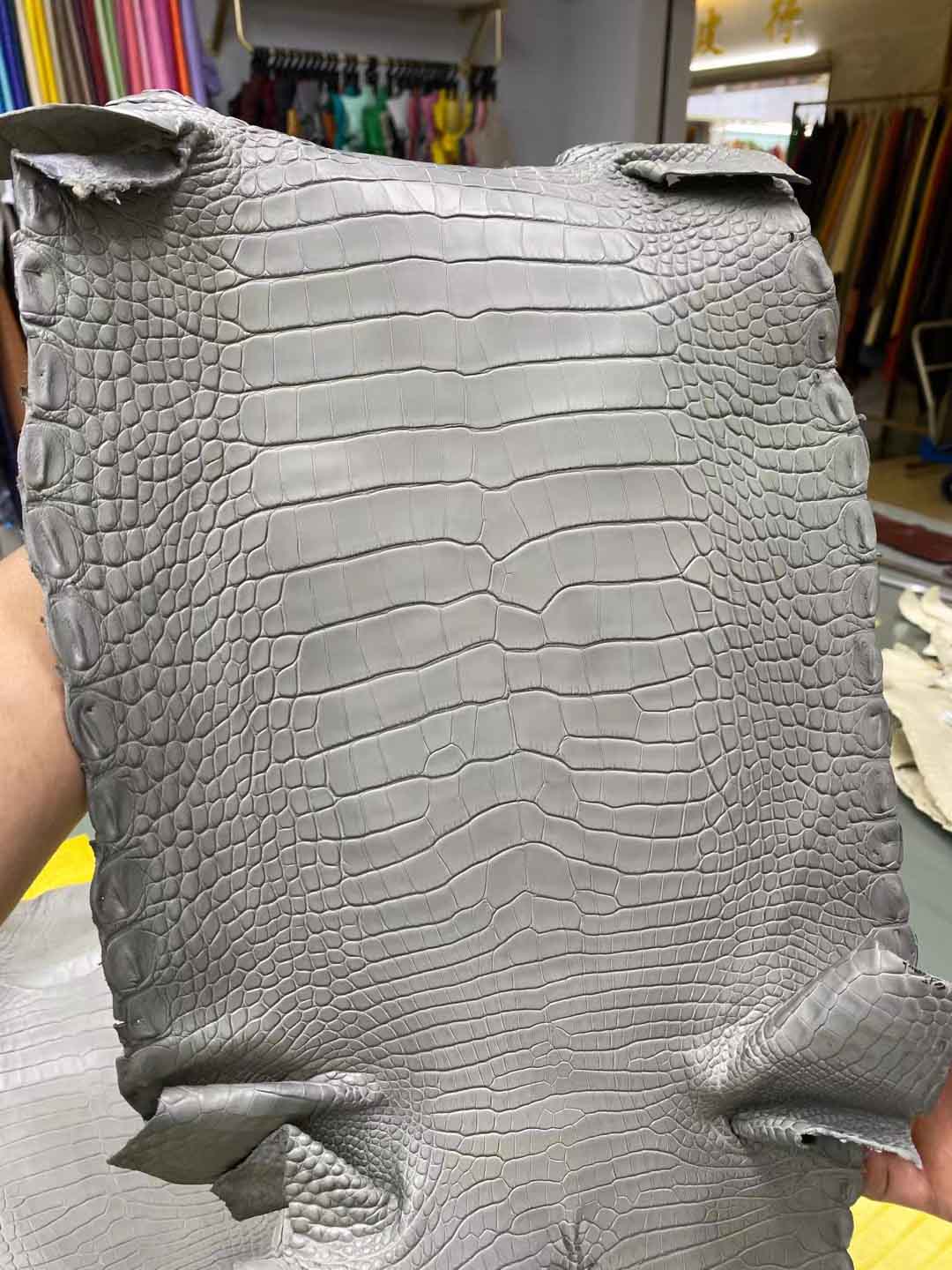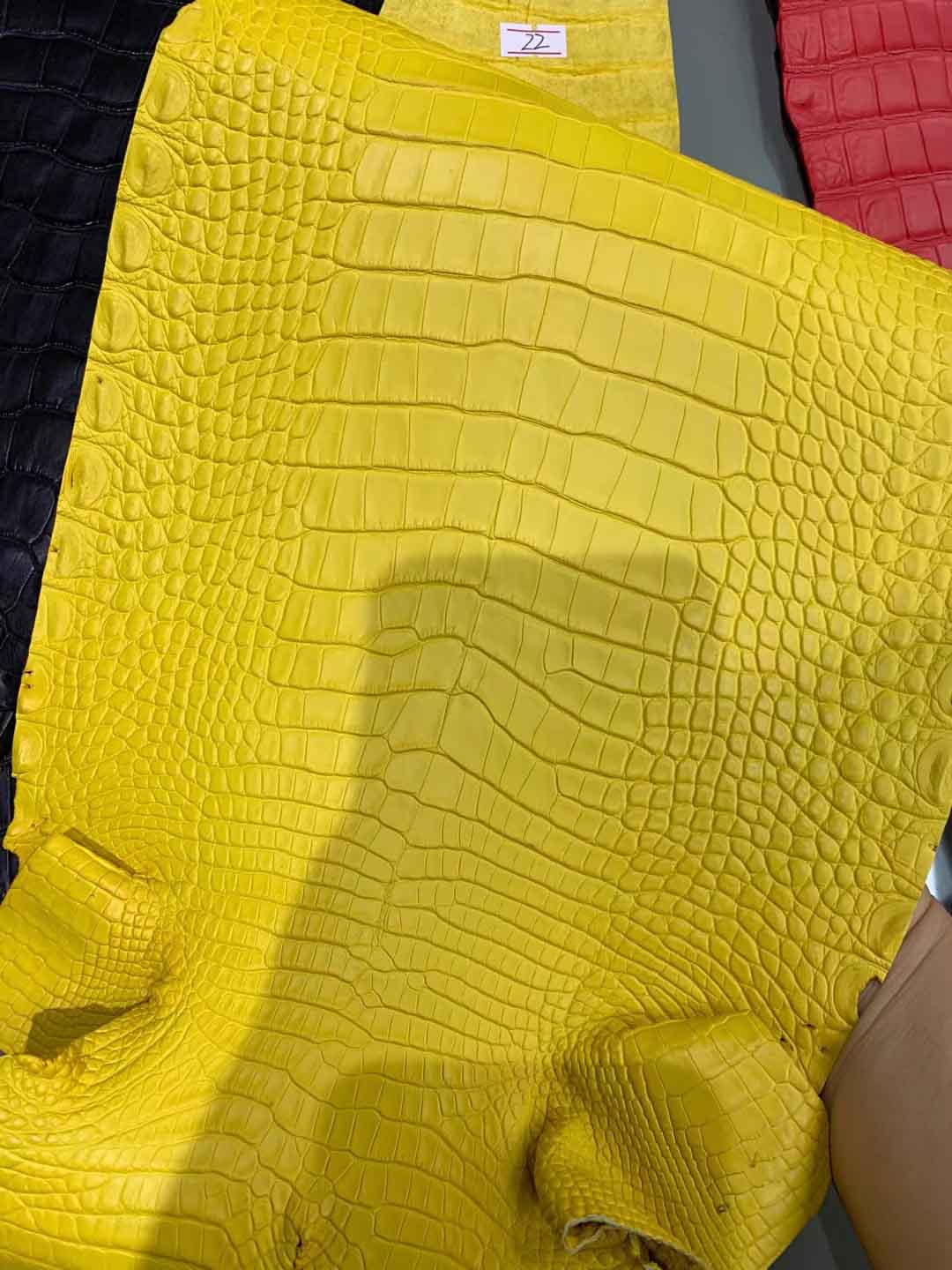 美洲鳄鱼哑光皮料:灯盏花黄、斑鸠灰、香草色、各样色彩到货了。可以定做自己的样色样板。有需要雾面皮料联系微信号 95506803