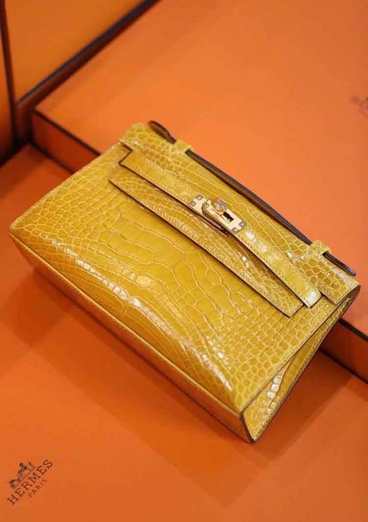 mini kelly pochette 1代 J5天琥珀黄 野生美洲鳄亮面