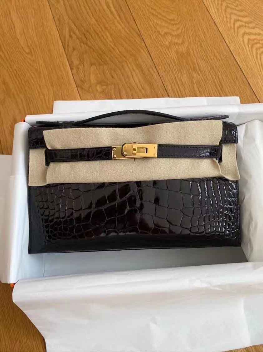 mini kelly pochette 1代 J5天黑色 野生美洲鳄高光
