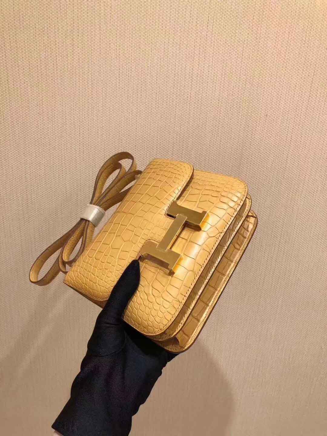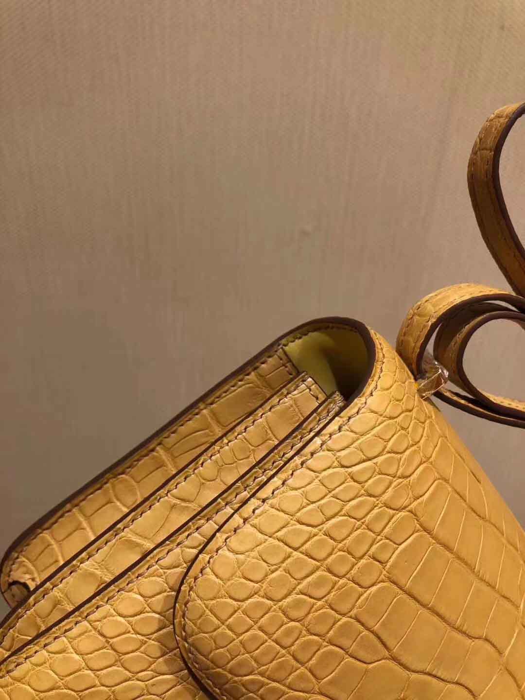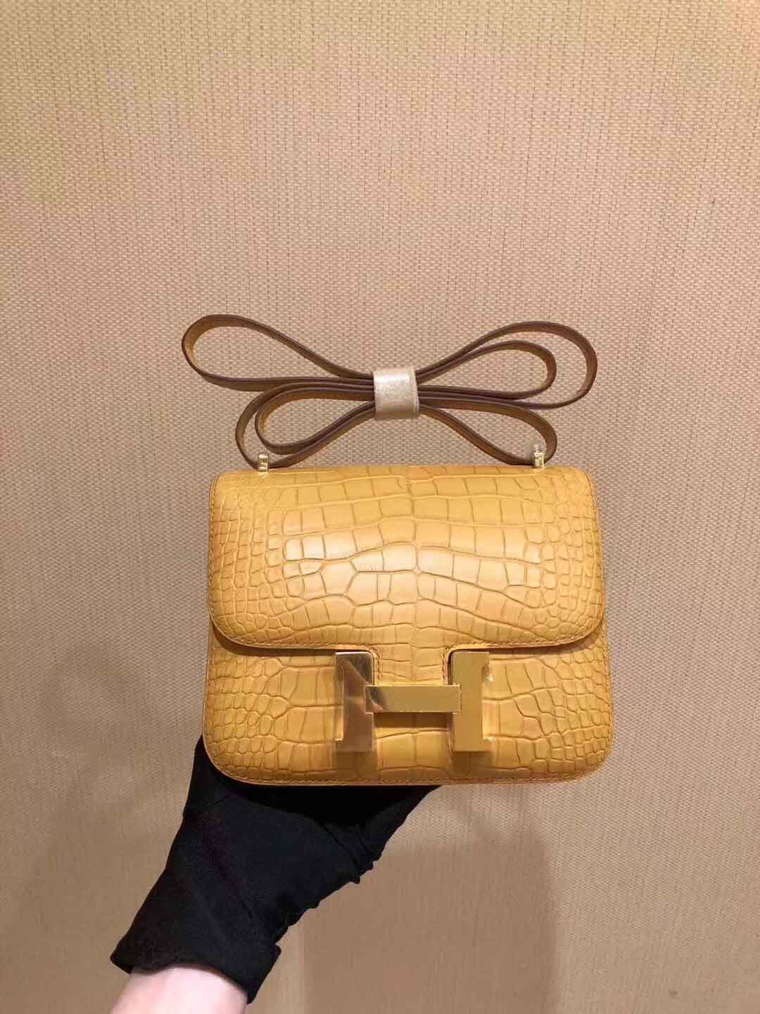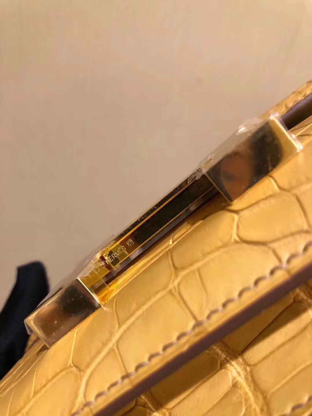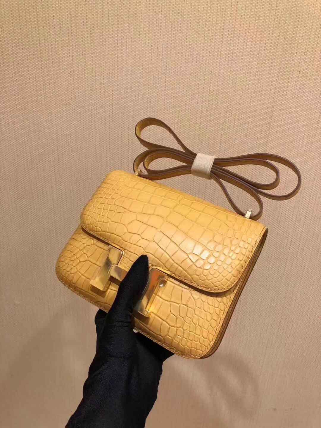 定制款. Constance 18cm 雾面美洲鳄 shiny alligator 2S芝麻色/琥珀黄内里 金扣,蜡线手工缝制私人定制空姐包厂家