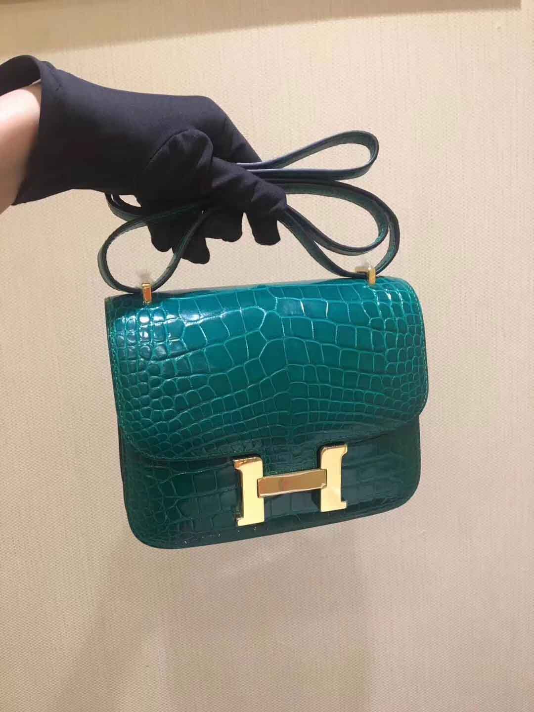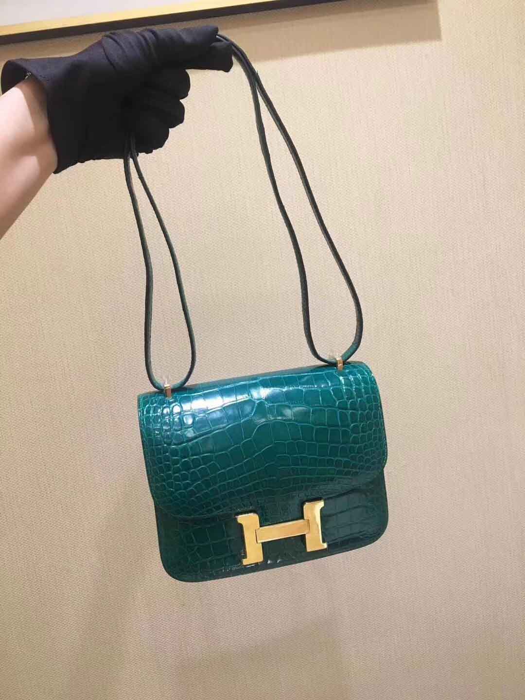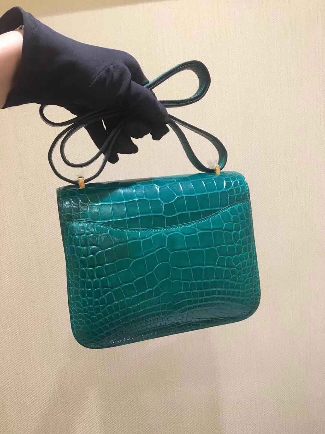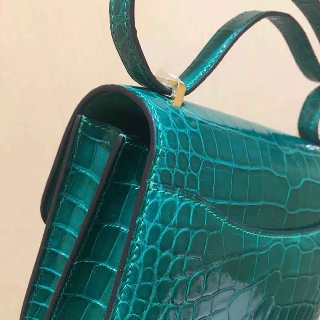 私人订做款: Constance 18cm 亮面美洲鳄 shiny alligator翡翠绿/金扣,蜡线手工缝制定制空姐包