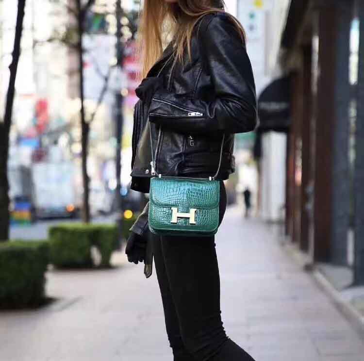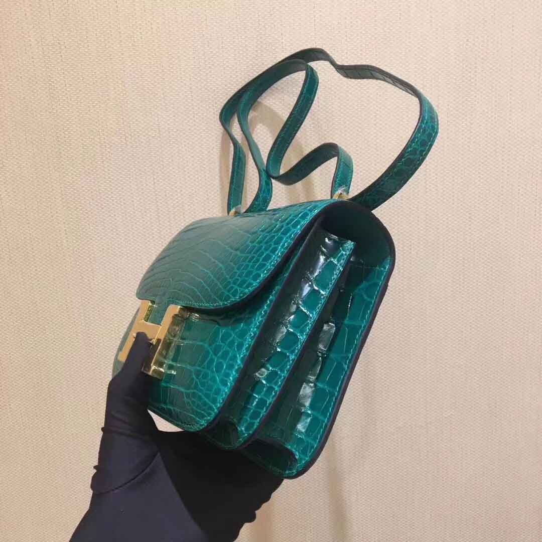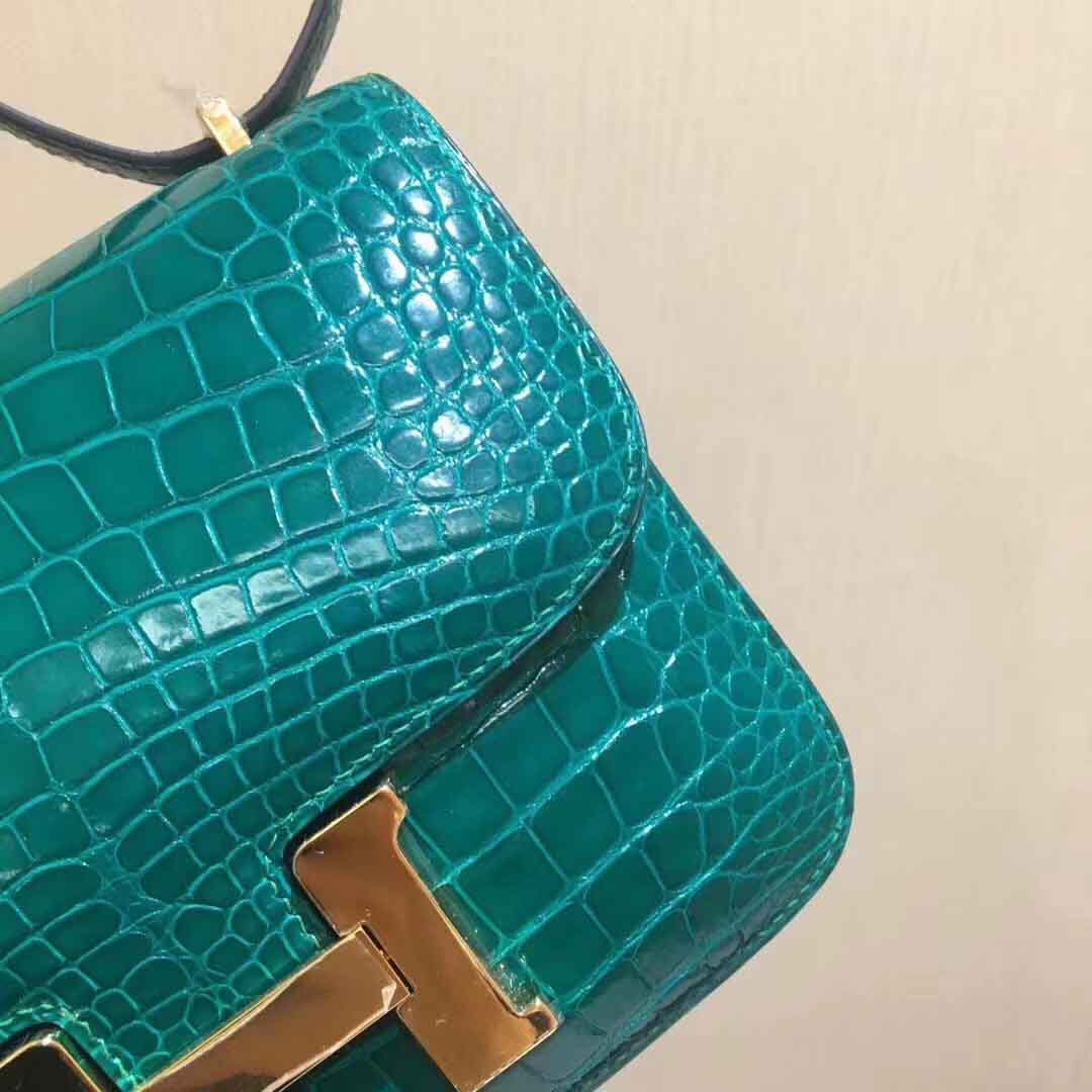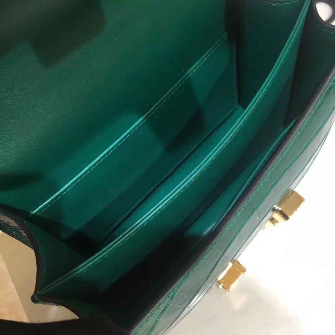 私人订做款: Constance 18cm 亮面美洲鳄 shiny alligator翡翠绿/金扣,蜡线手工缝制定制空姐包