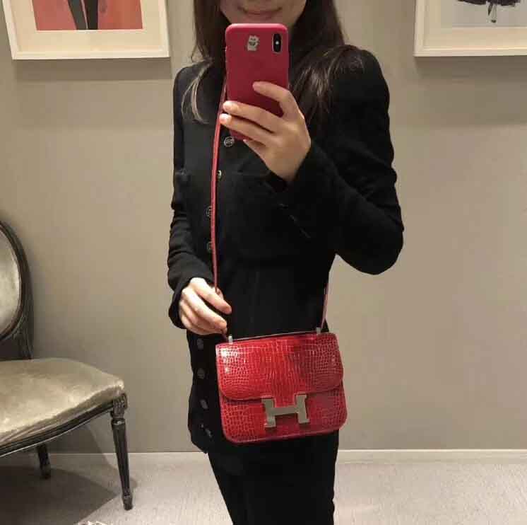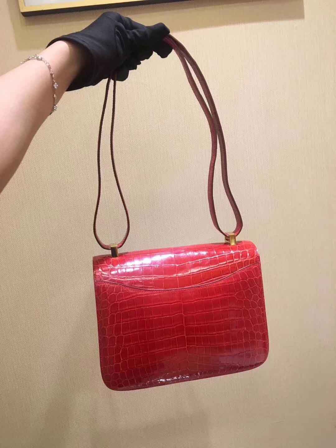 奢侈品定制款: Constance 23cm 亮面尼罗鳄 shiny crocodylus 法拉利红/金扣,蜡线手工缝制私人订做鳄鱼皮女包厂家