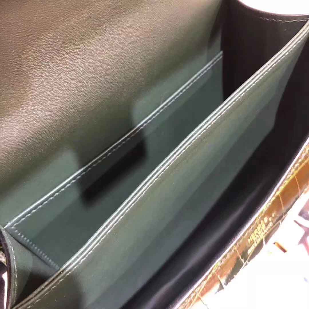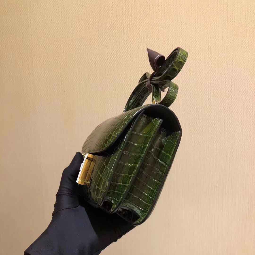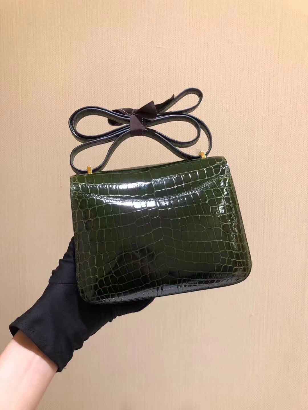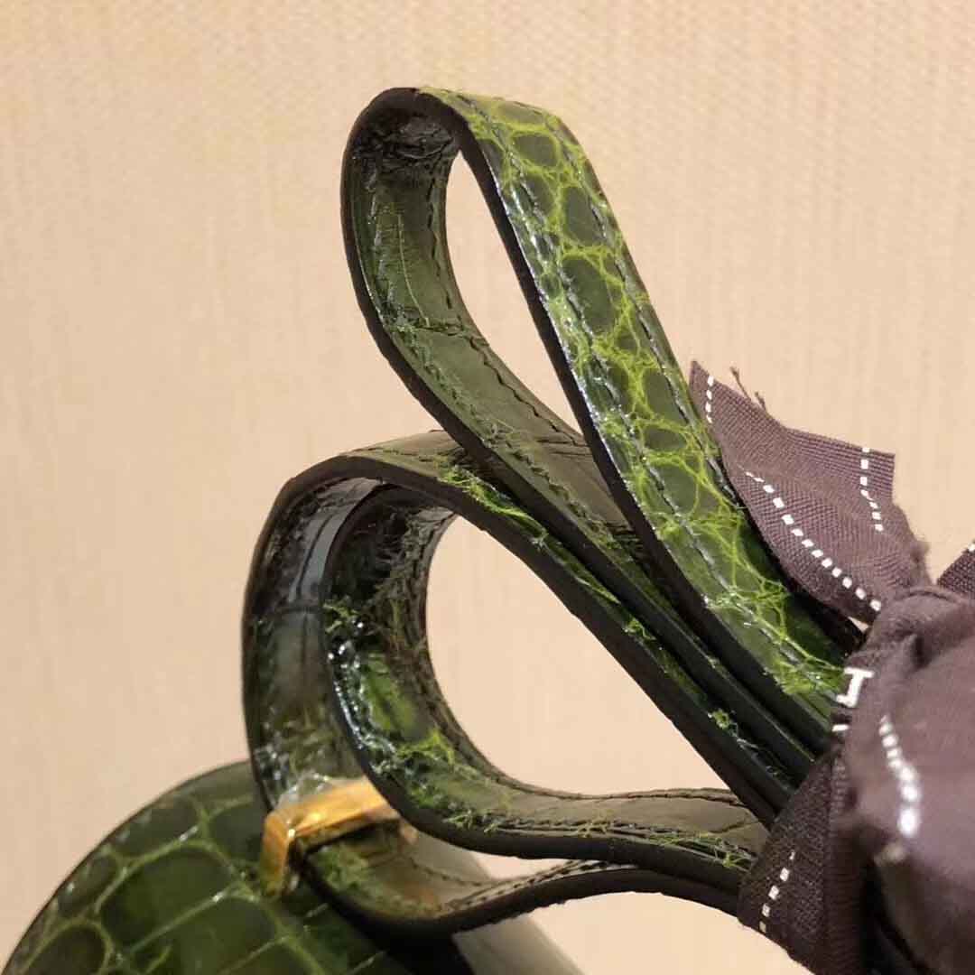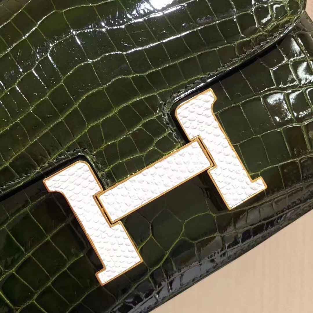 奢侈品定制款. Constance 18cm 亮面尼罗鳄 shiny crocodylus 6H橄榄绿/ 白色蜥蜴皮金扣,蜡线手工缝制美洲鳄鱼皮女包定制工厂
