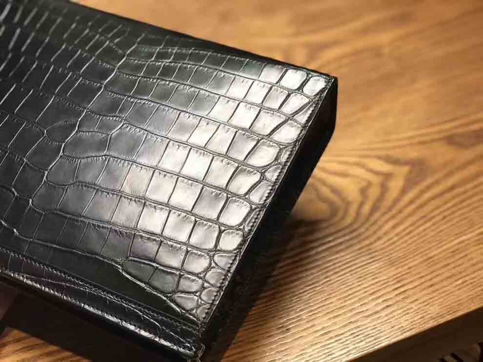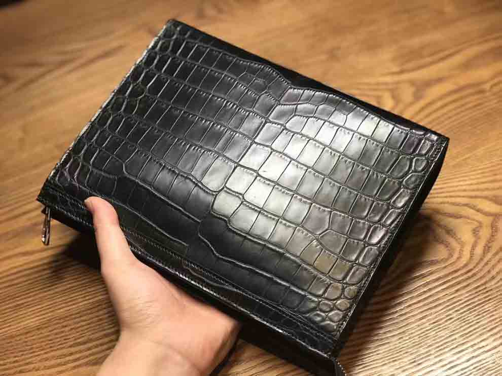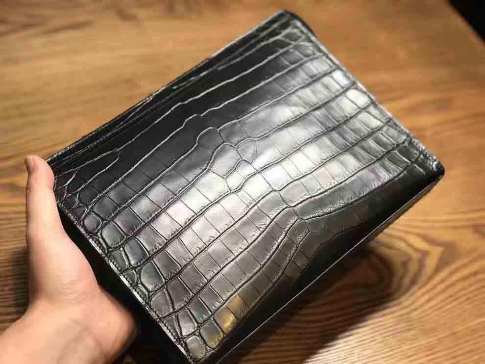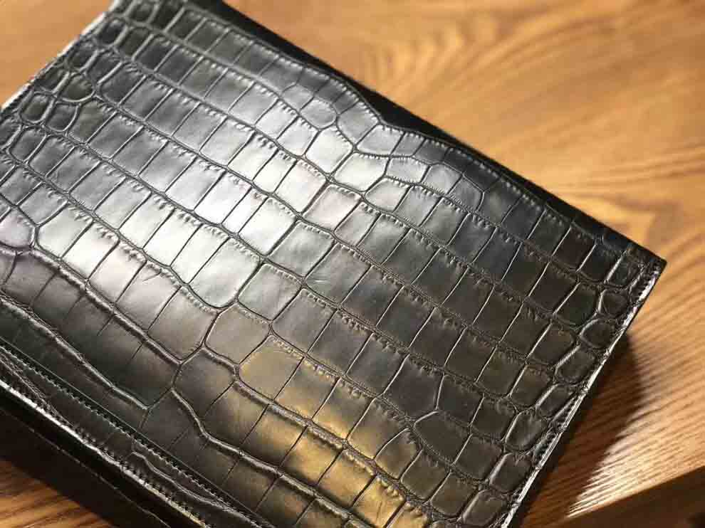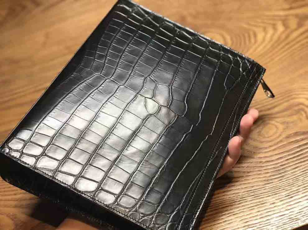 客定尼罗鳄夹包,原版1:1开模定制,客人喜欢大纹路的,选了两条做公文包的料来做手拿包,虽然费了一点,但是效果非常棒。联系微信 95506803