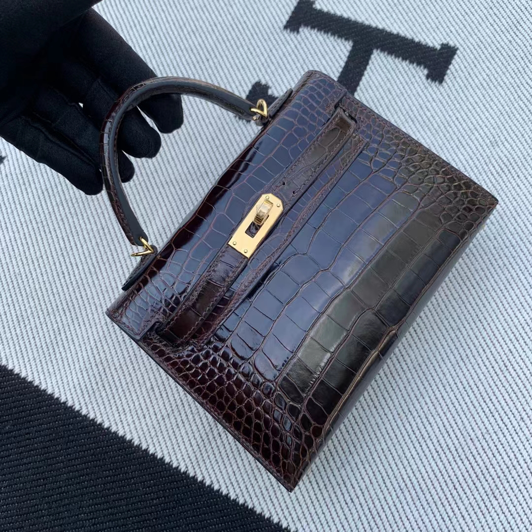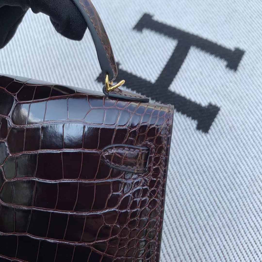 Kelly二代19cm进口美洲鳄高光 乌木色 金扣 全手工缝制 实物拍摄 现货