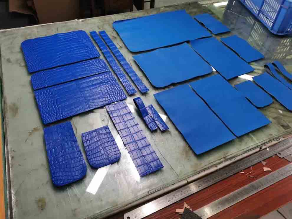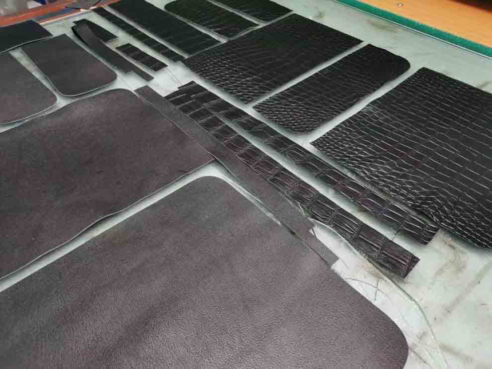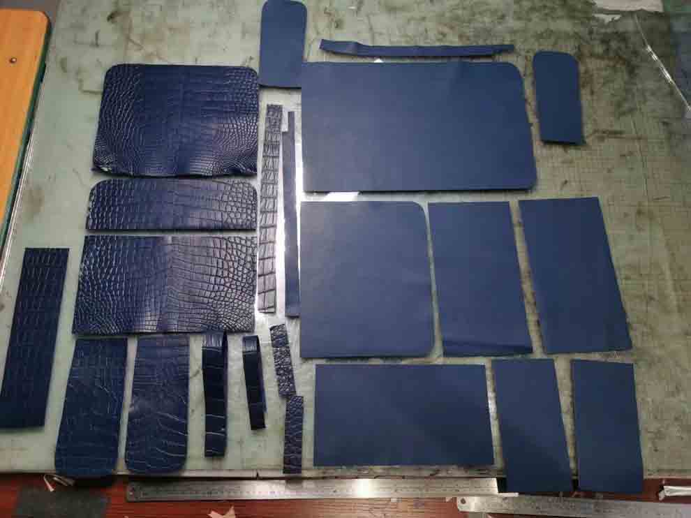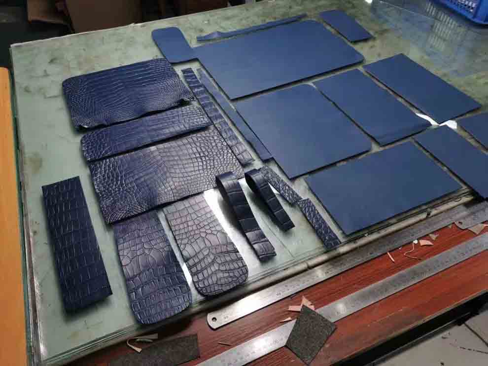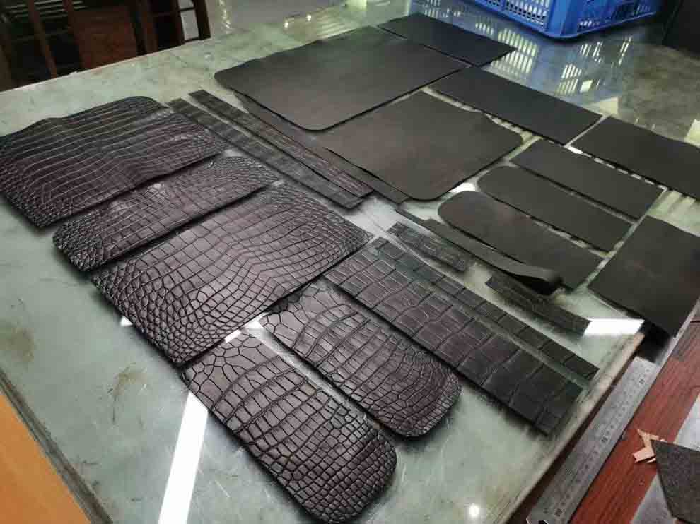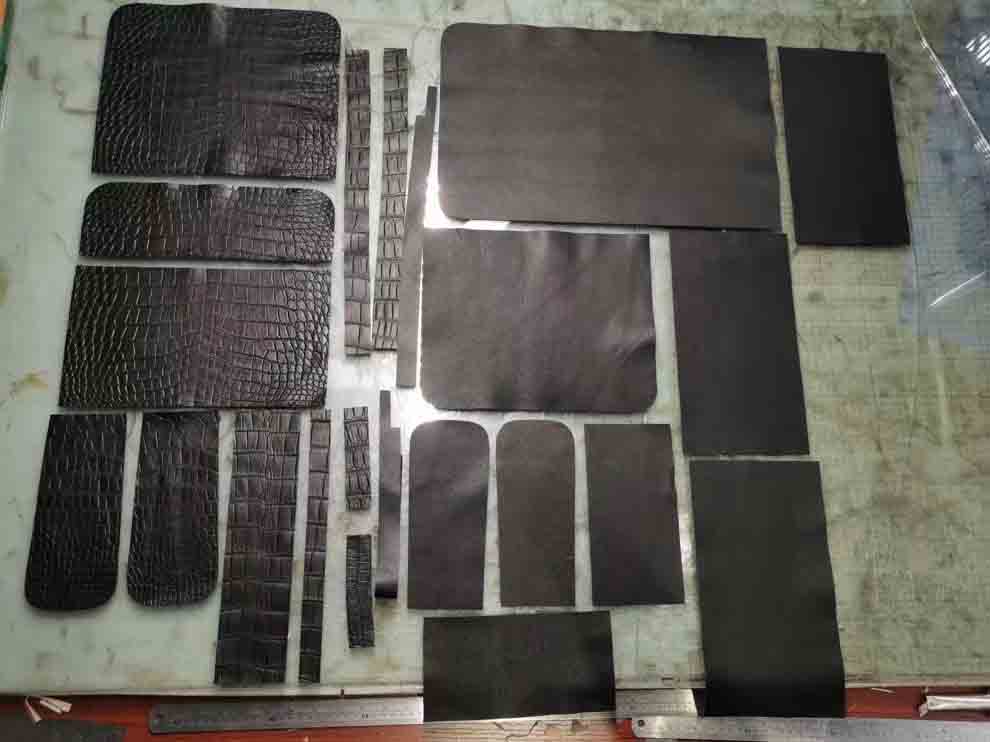 一个手拿包的用料,2条鳄鱼+2条山羊,请忽略脏脏的工作台,扎扎实实的用料方案。用料实在,才能做出满意的包包来,包包裁剪碎片摆放图-包包零件摆放图。