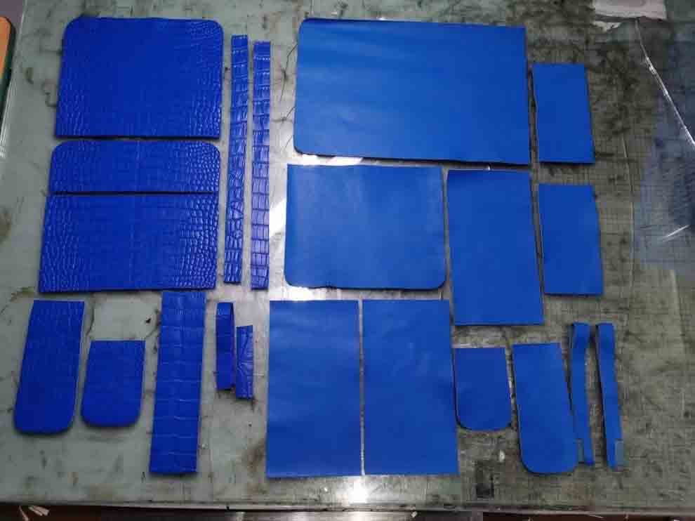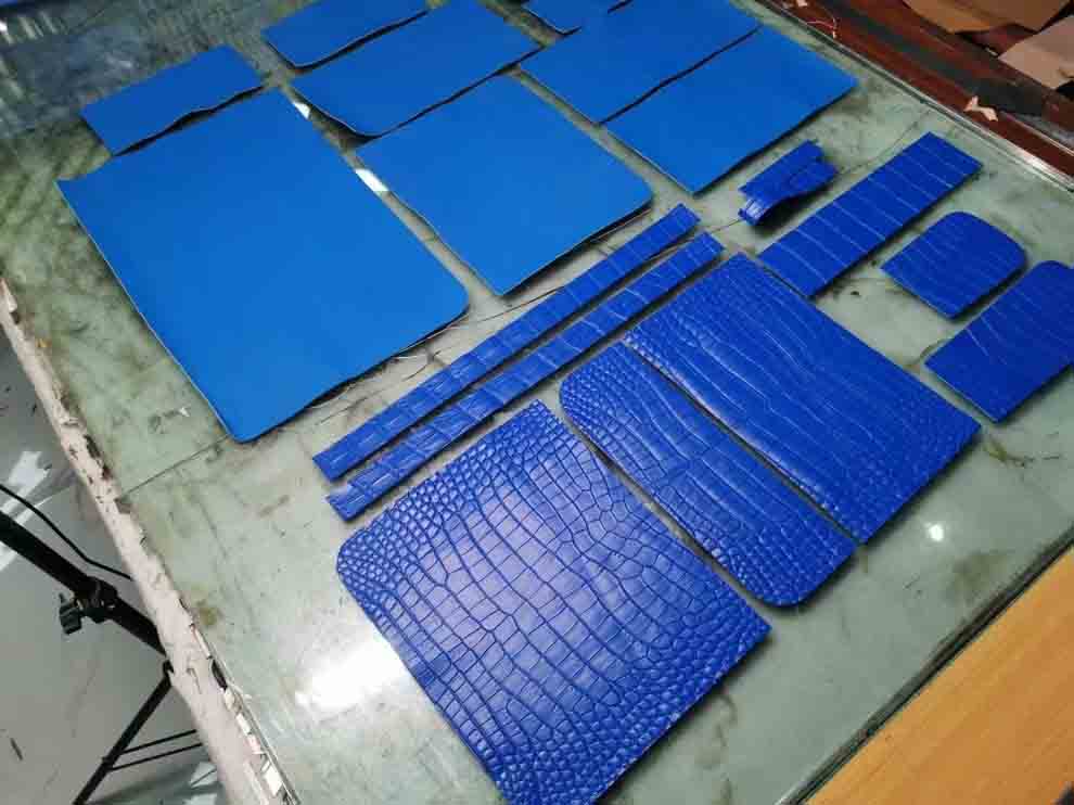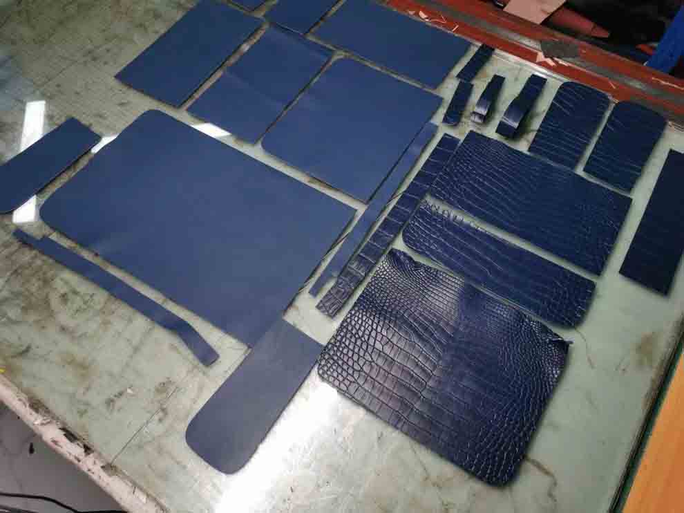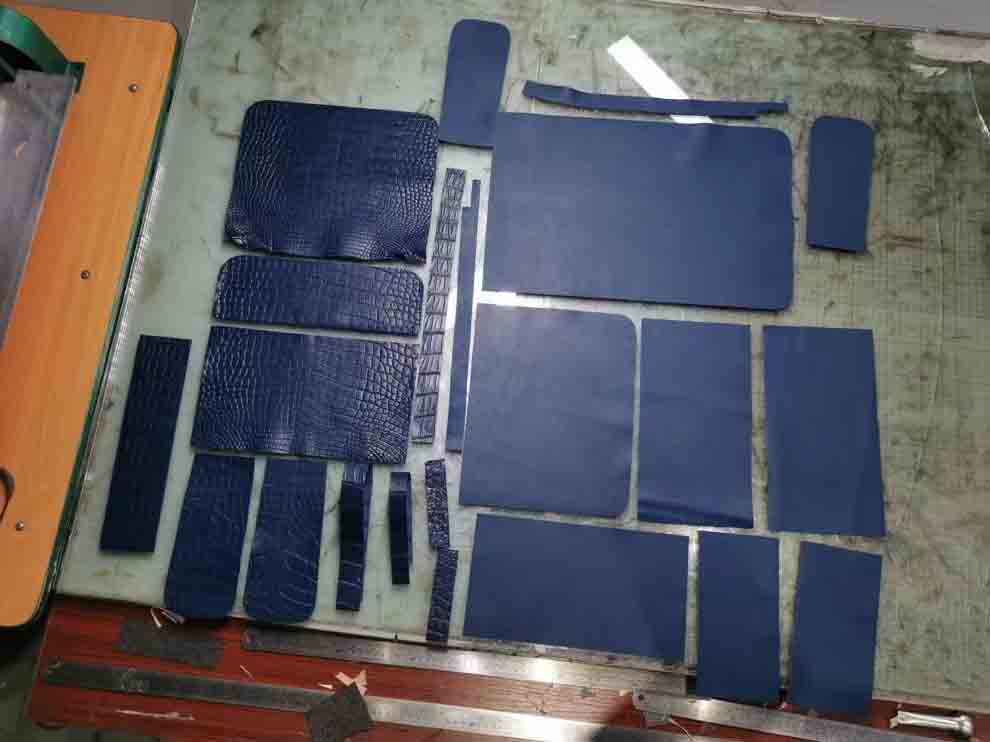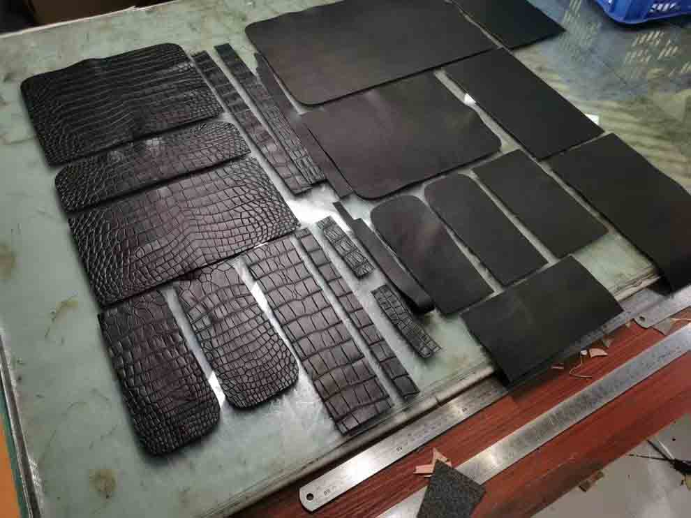 一个手拿包的用料,2条鳄鱼+2条山羊,请忽略脏脏的工作台,扎扎实实的用料方案。用料实在,才能做出满意的包包来,包包裁剪碎片摆放图-包包零件摆放图。