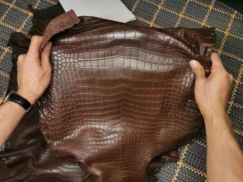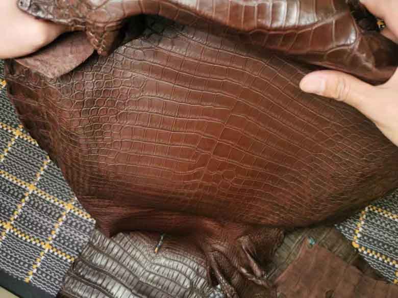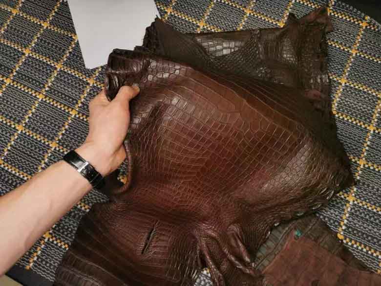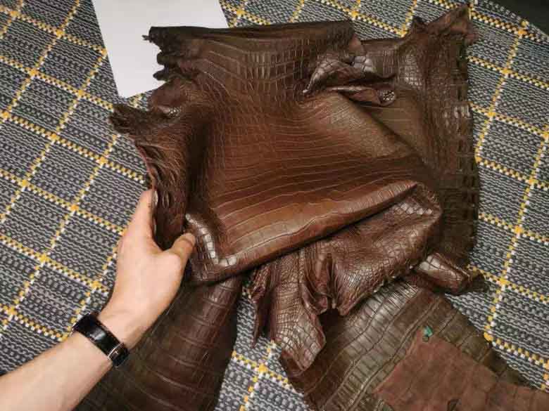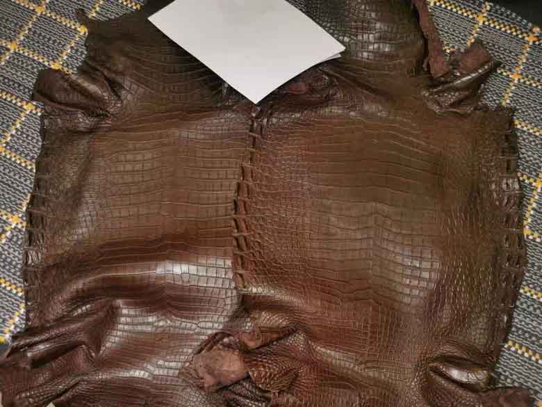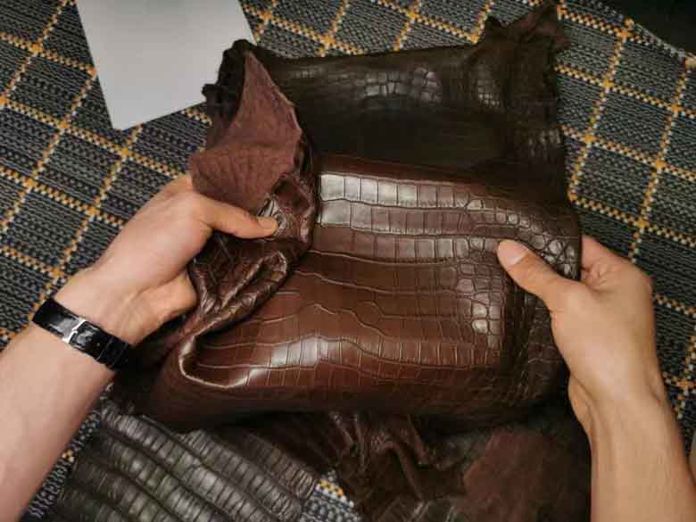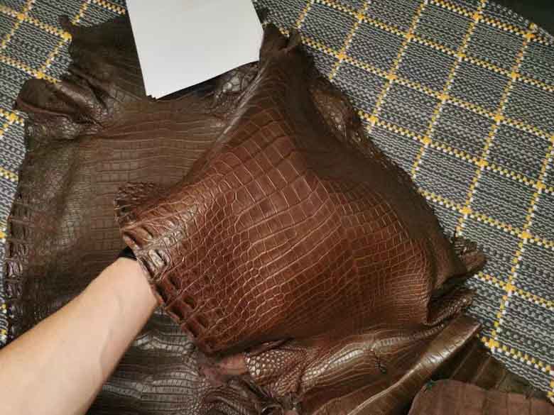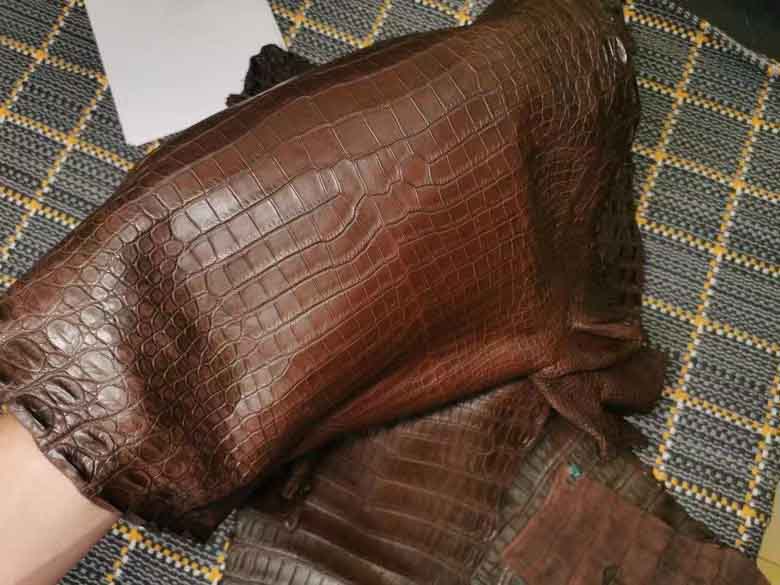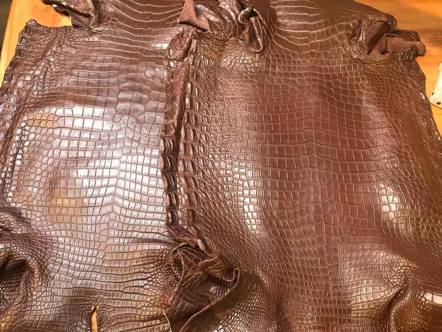 深咖色湾鳄,纯水染风格,面油亮蜡感较强 用过之后会更亮。