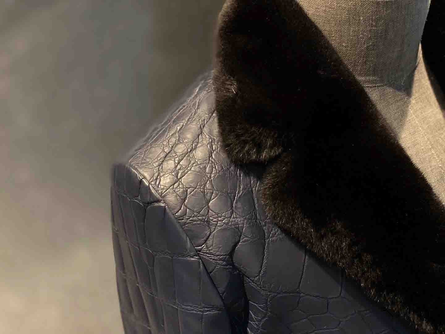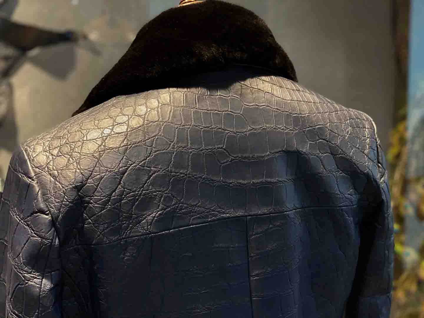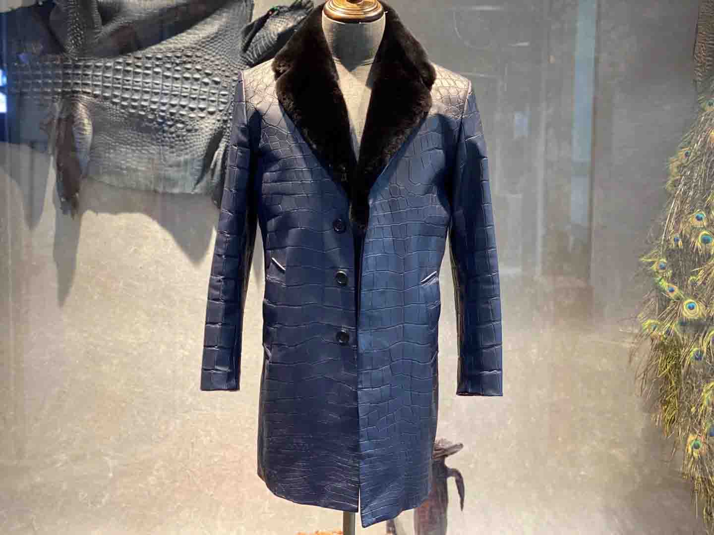 鳄鱼皮男款#风衣蓝色/黑色现货50码,鳄鱼皮长款衣服定制工厂微信联系 95506803