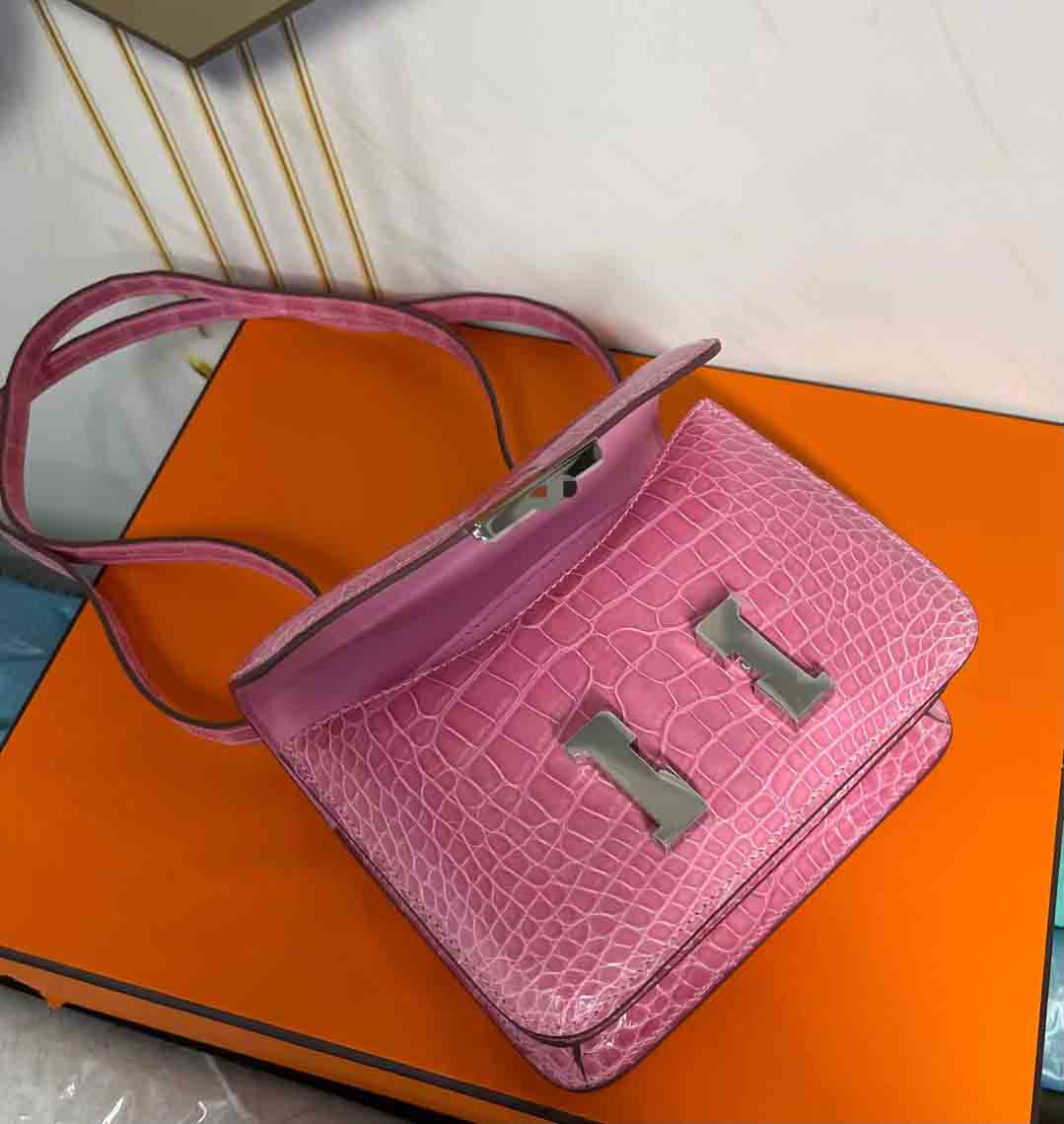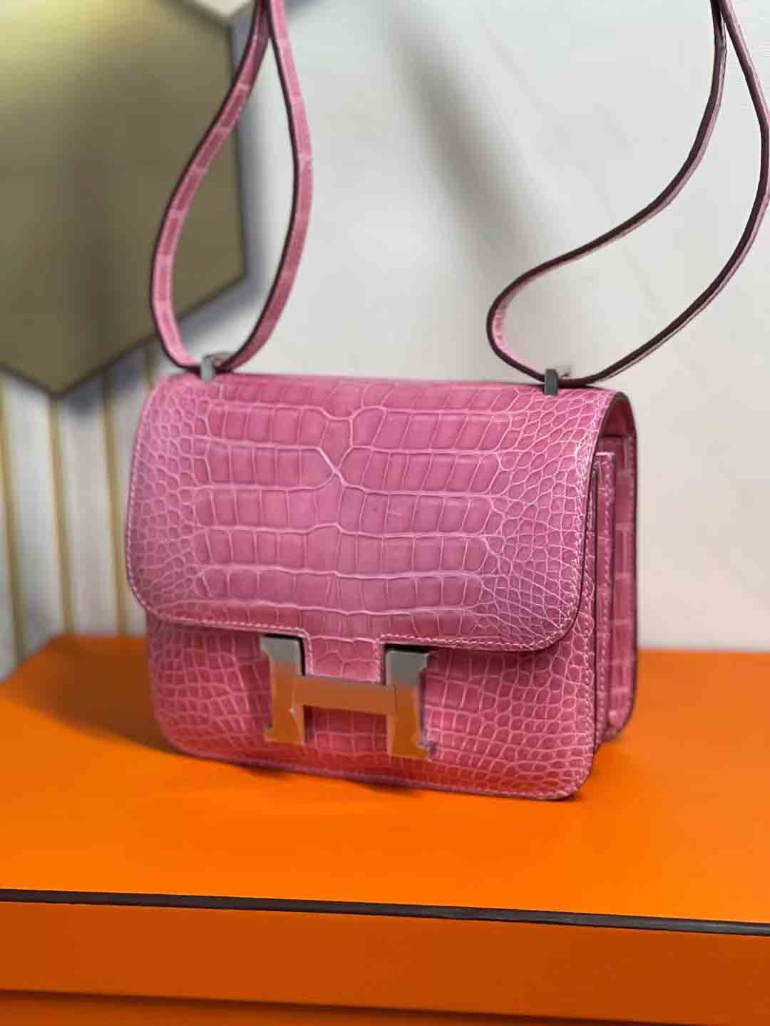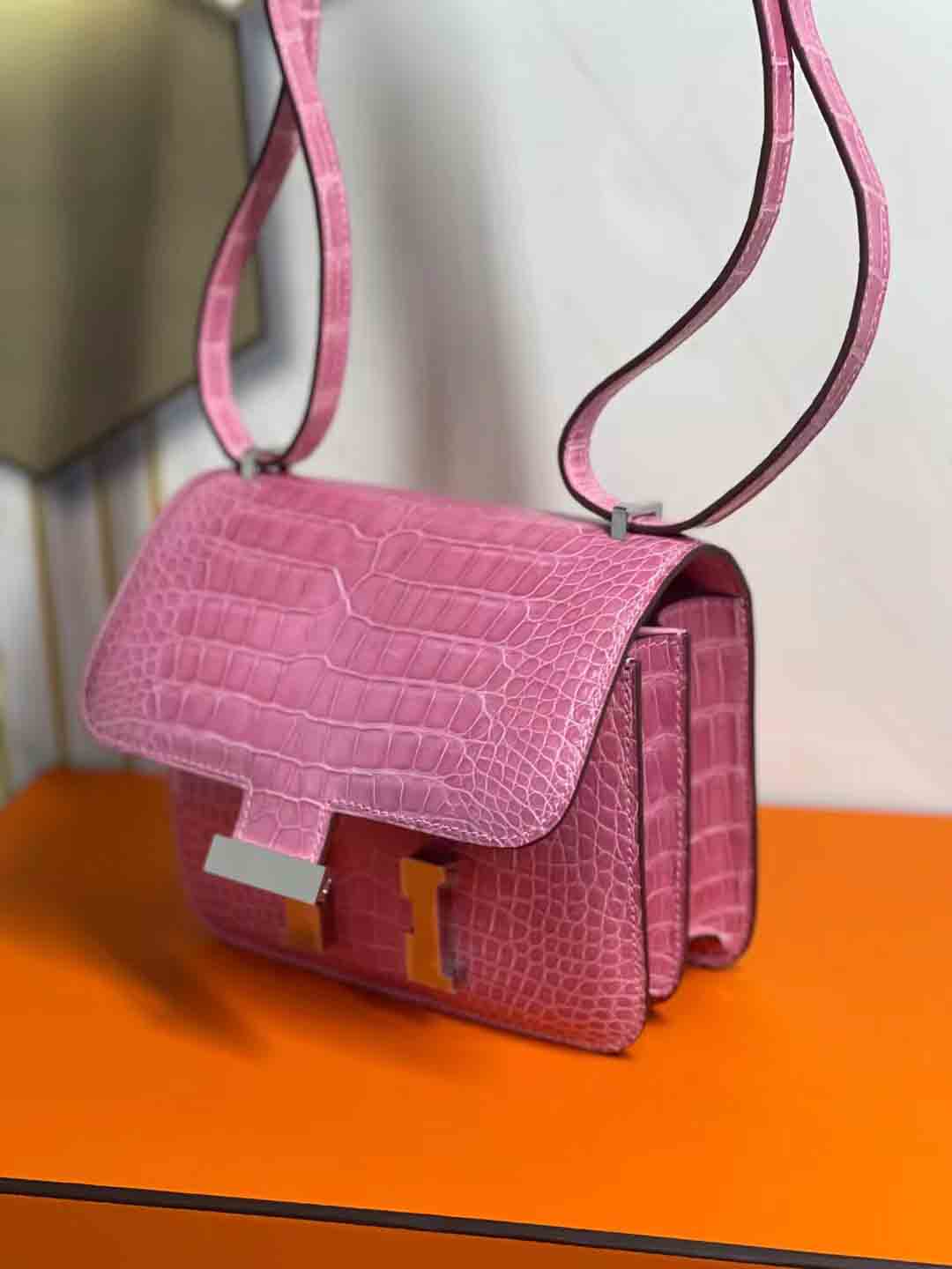 高光美洲鳄皮单肩包预约订做,constance 18cm 亮面兴隆美洲鳄鱼 樱花粉 下单可发