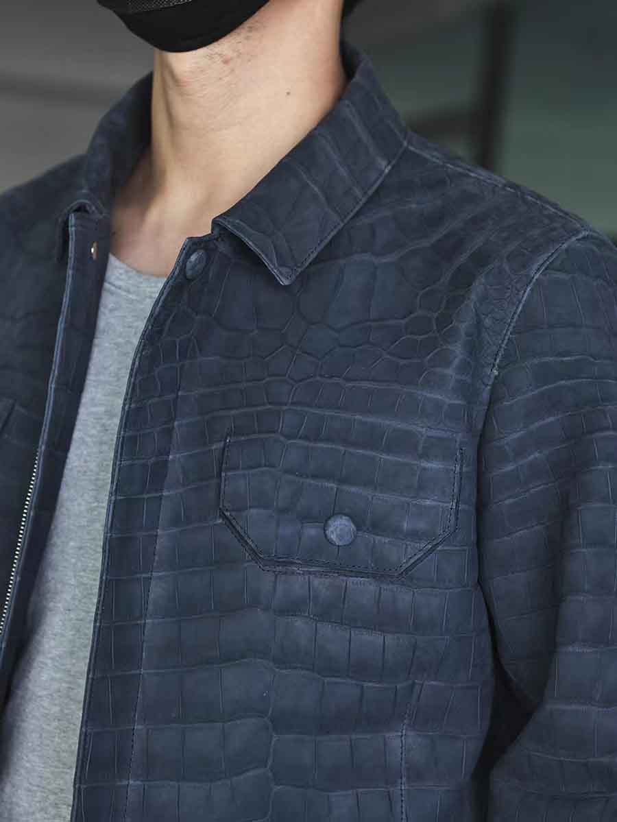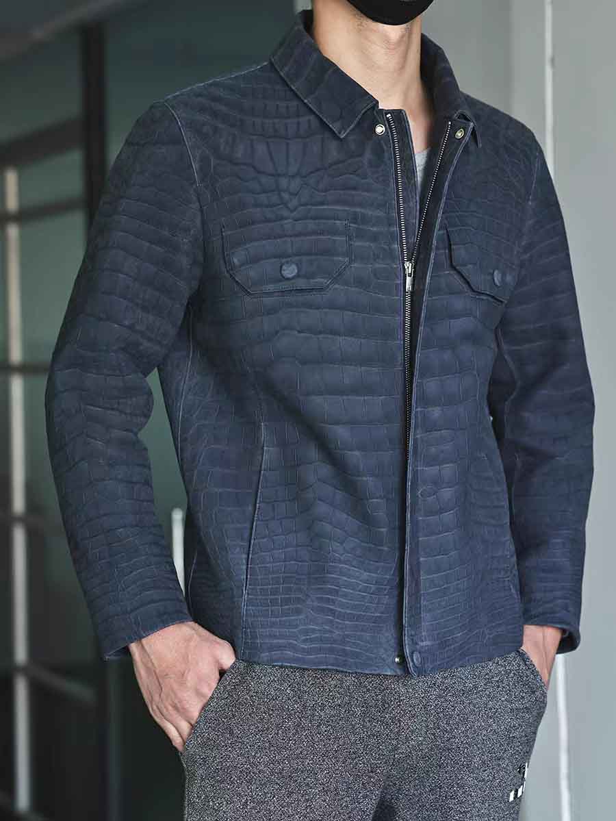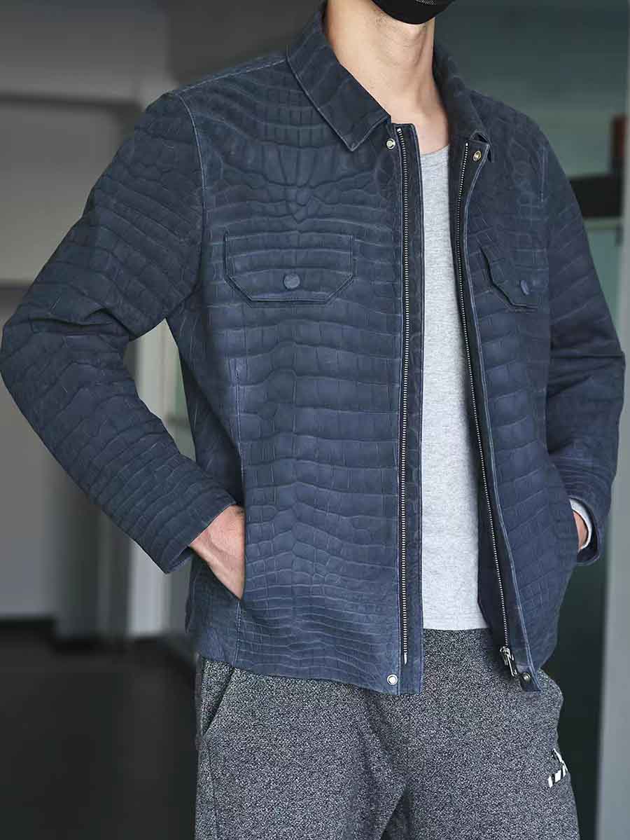 客订 磨砂牛仔蓝鳄鱼皮男士夹克️,湾鳄牛仔风衣订做厂家。