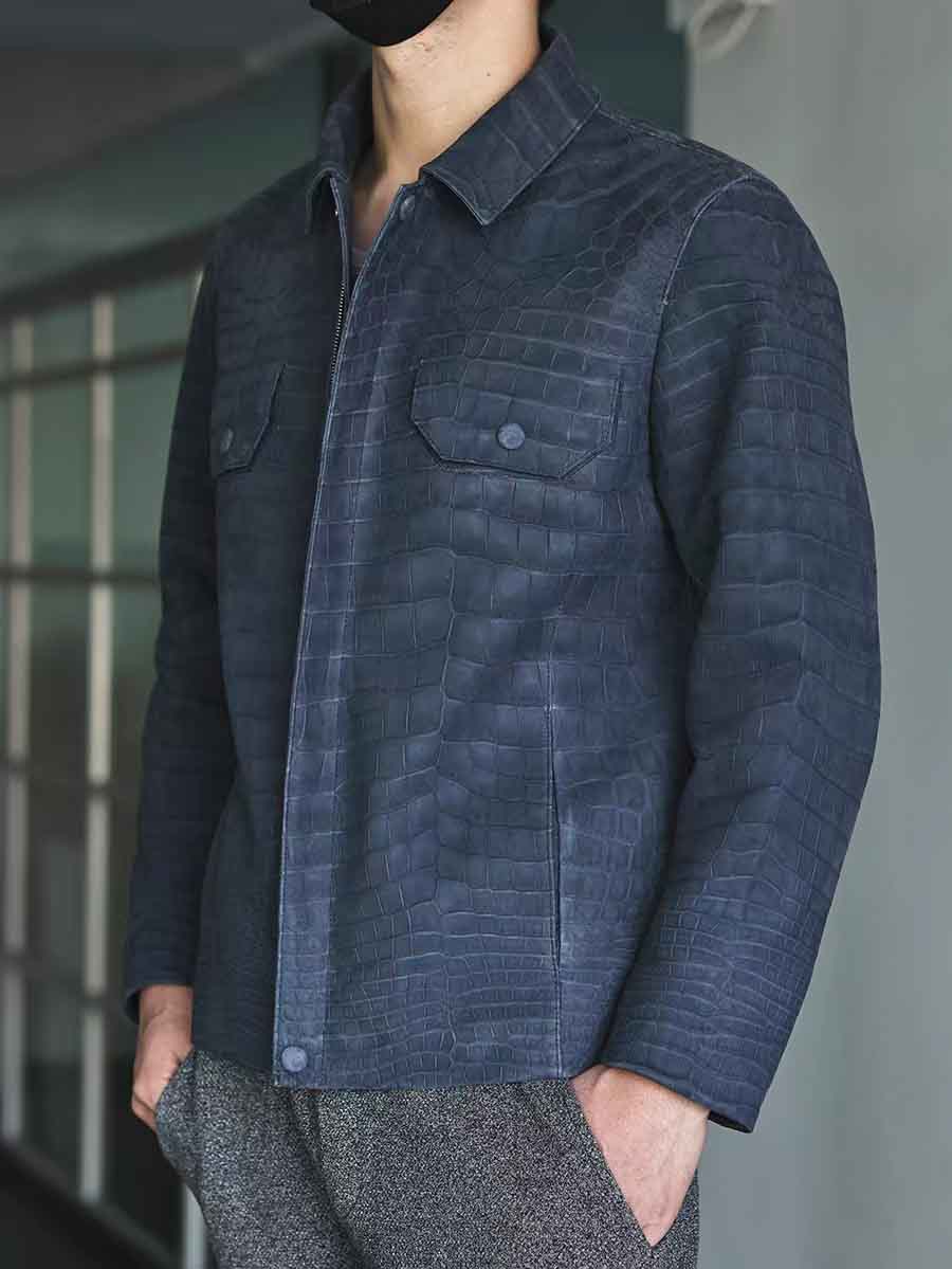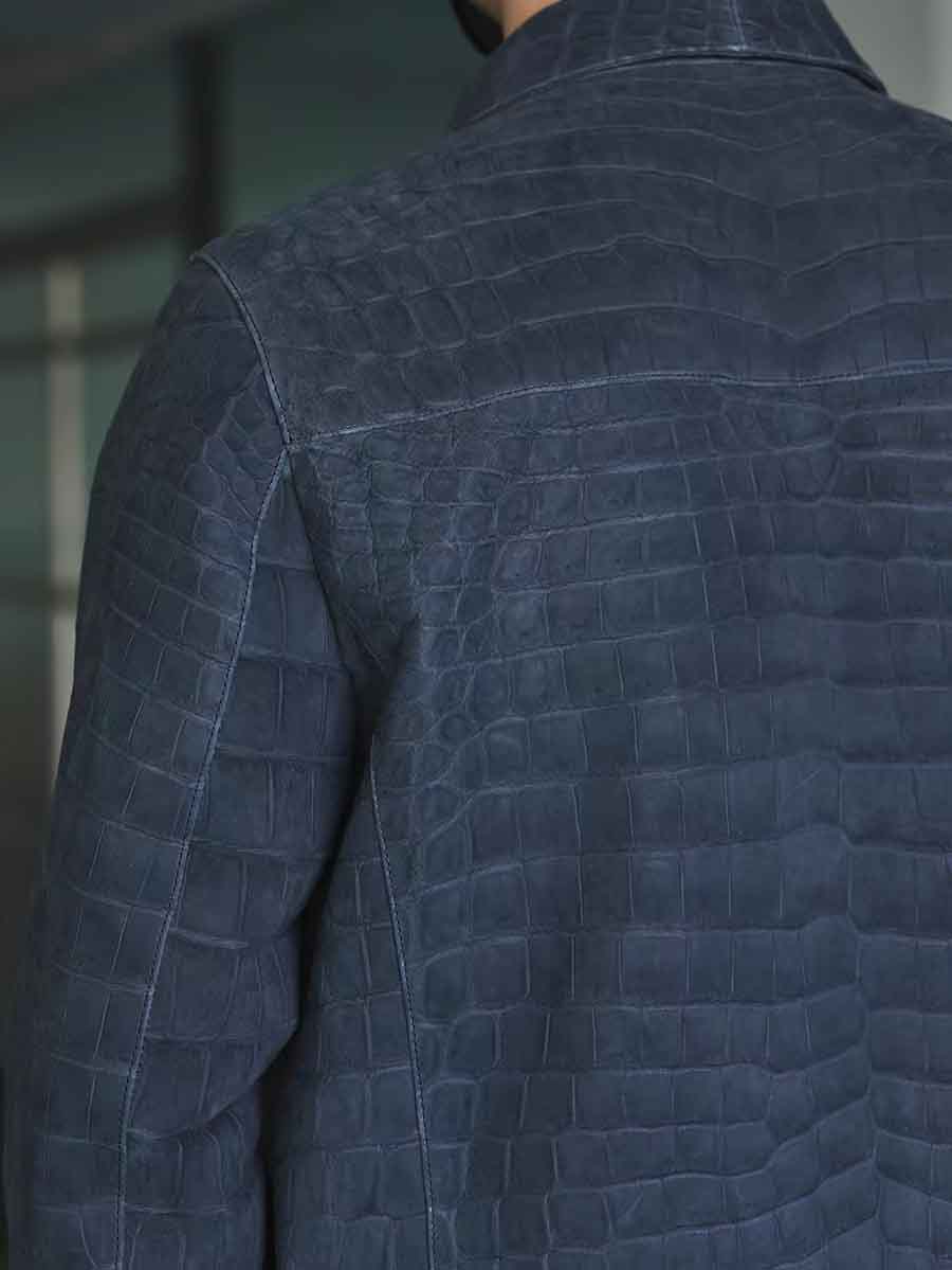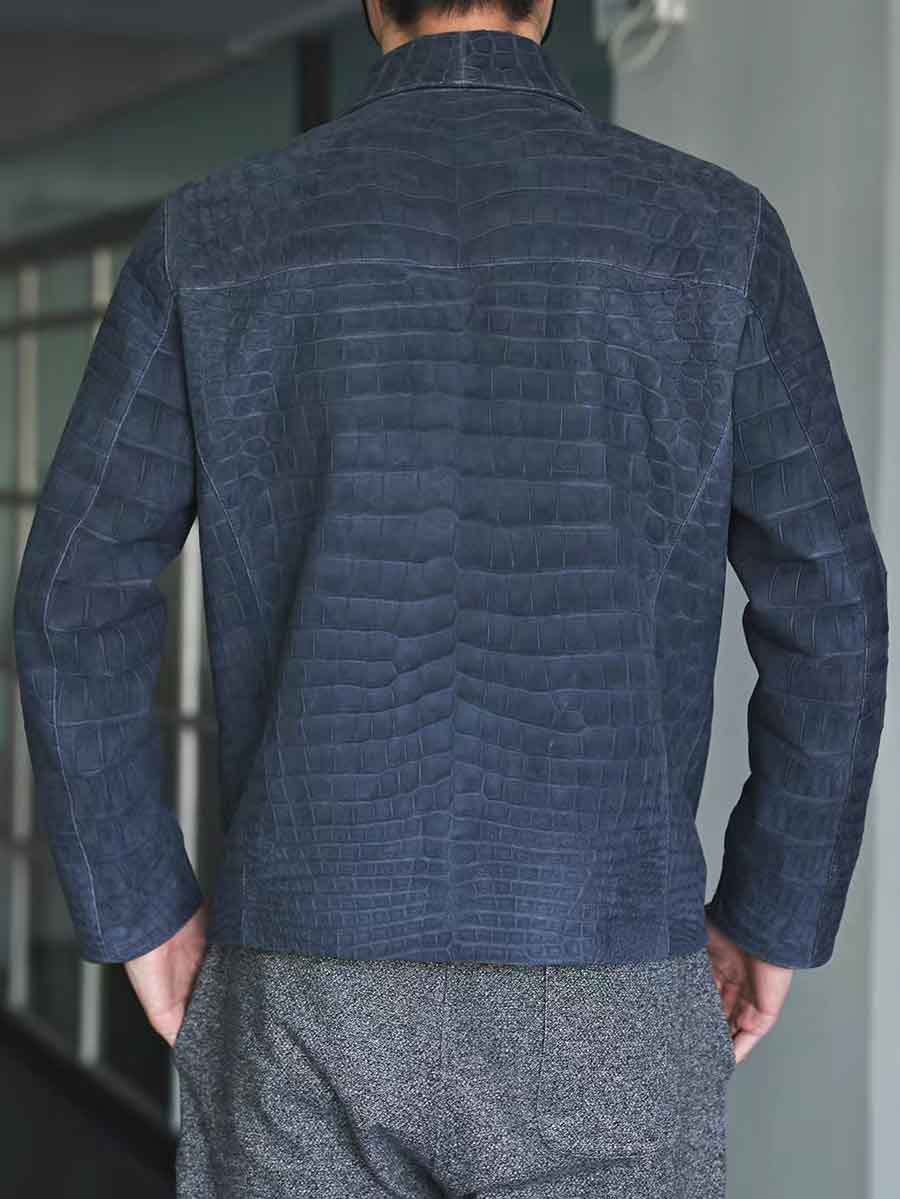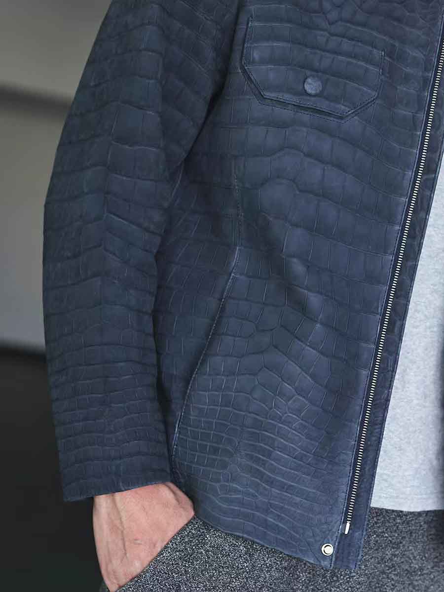 客订 磨砂牛仔蓝鳄鱼皮男士夹克️,湾鳄牛仔风衣订做厂家。