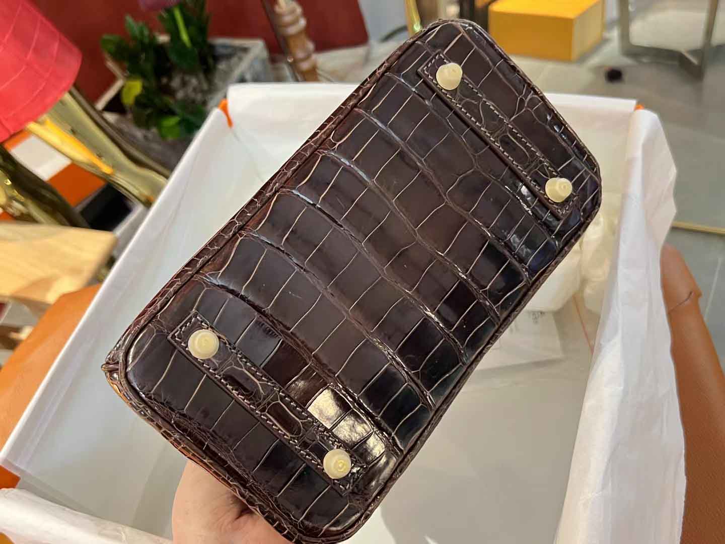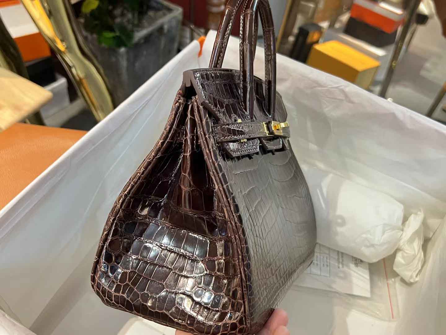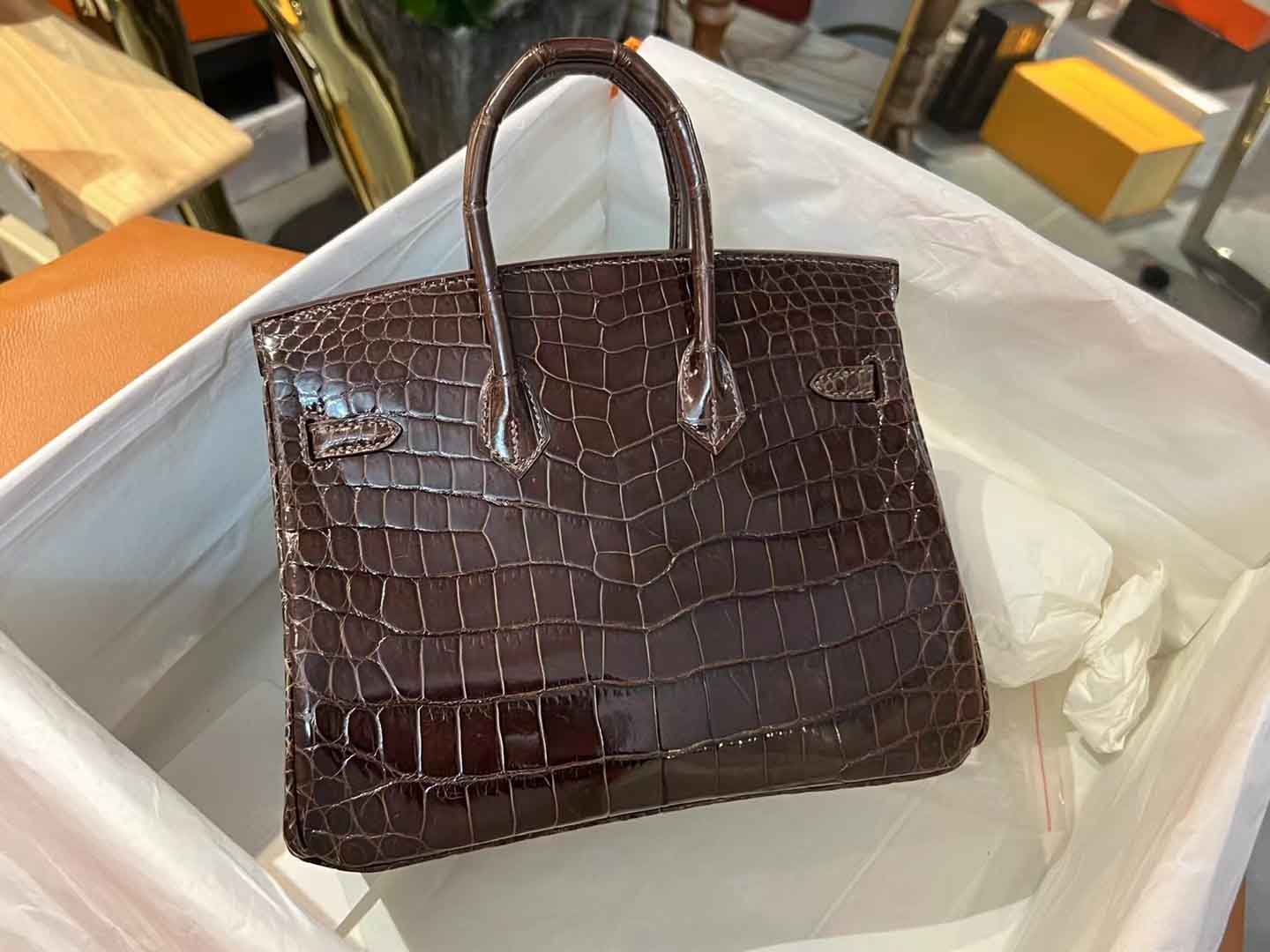 鳄鱼皮亮面乌木色 birkin25 金扣,#2023年度流行色#之乌木色 姑娘们,当你们觉得手上黑色包袋有点多的时候,应该尝试乌木这种暹罗鳄深邃的咖啡色。