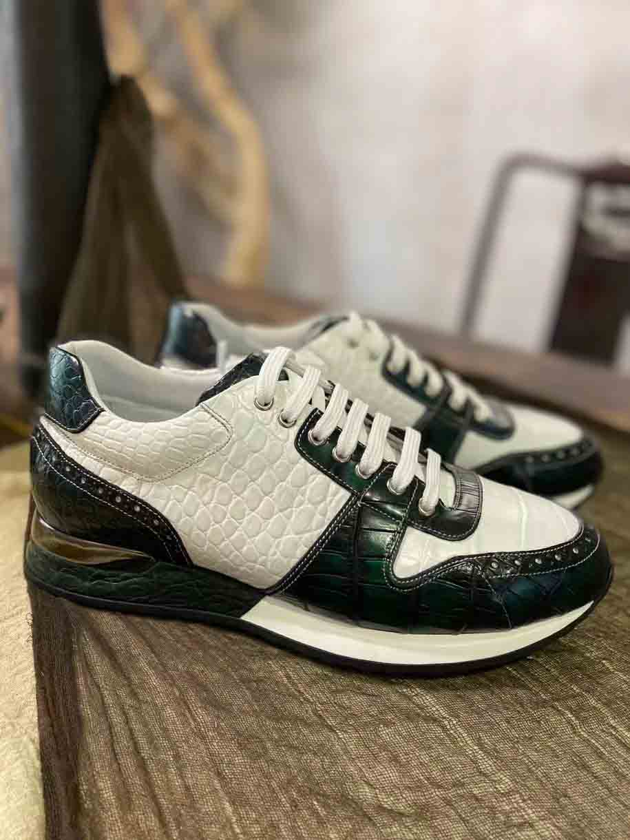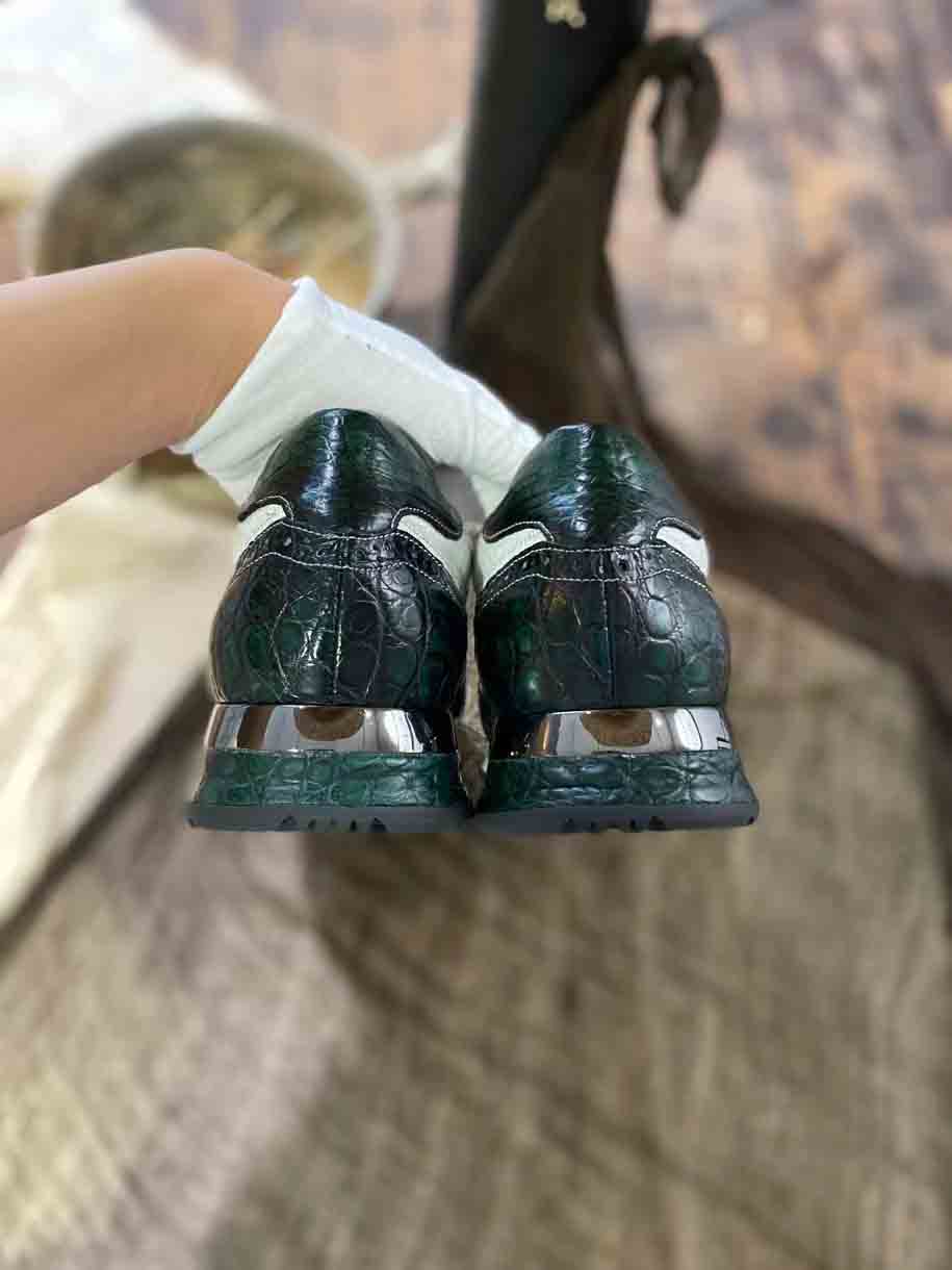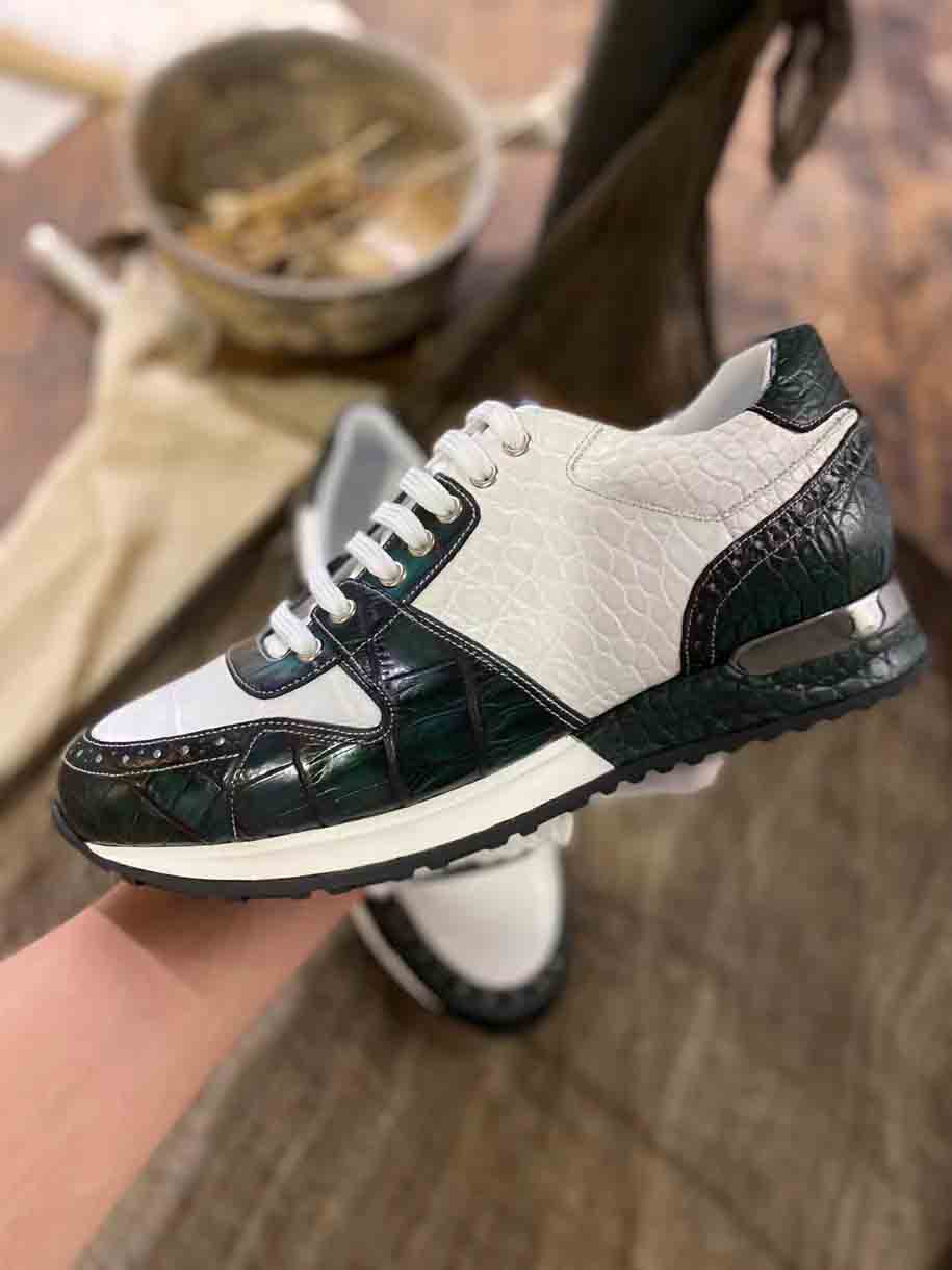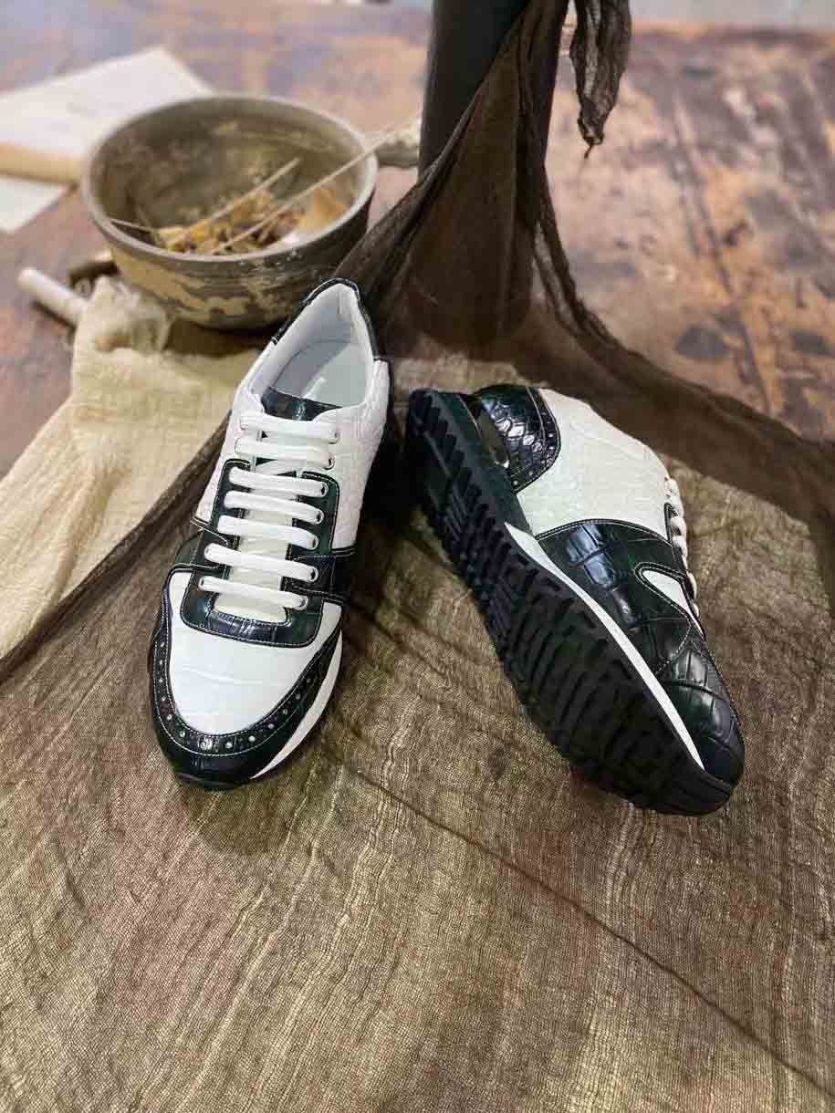 皮料选用鳄鱼皮,擦色工艺质感,凸显整双鞋子高端,品质肉眼可见,整双鞋子简约大气,细节和品质感都非常在线,男士运动鞋穿搭出运动风满满。