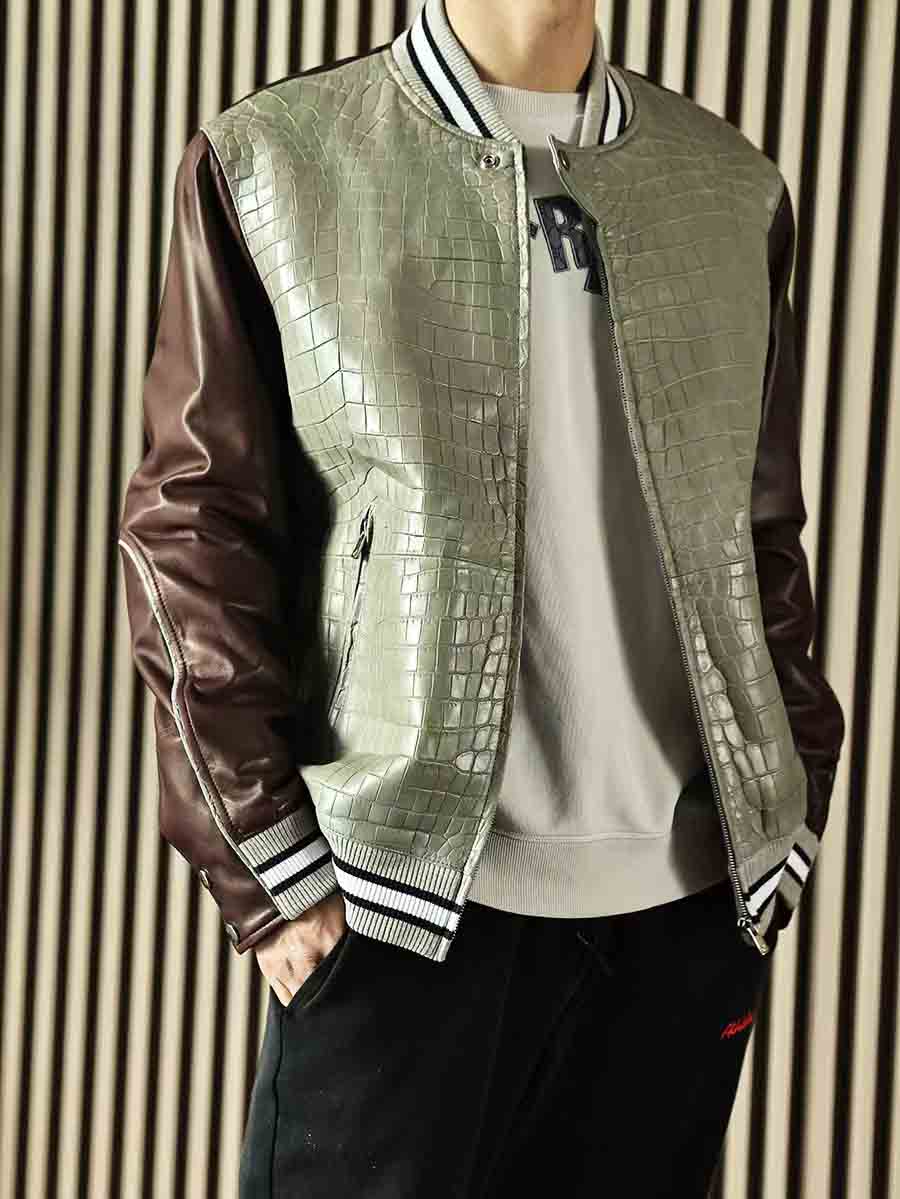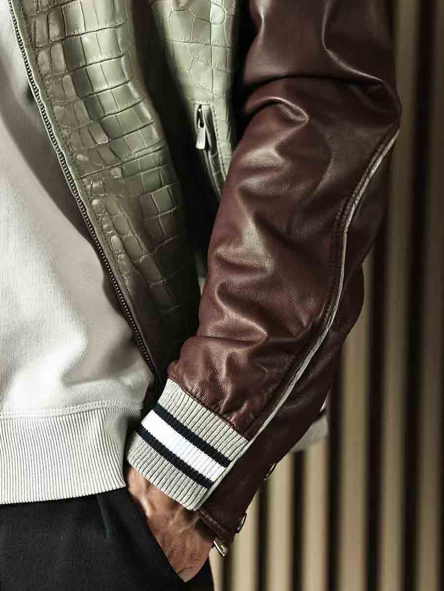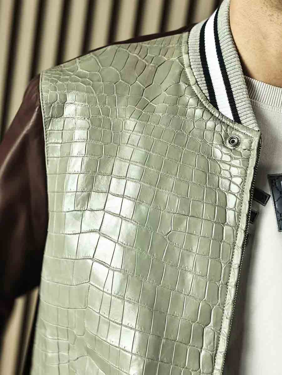 拼皮夹克,灰色鳄鱼➕酒红色羊皮,柔软舒适的同时不失调。