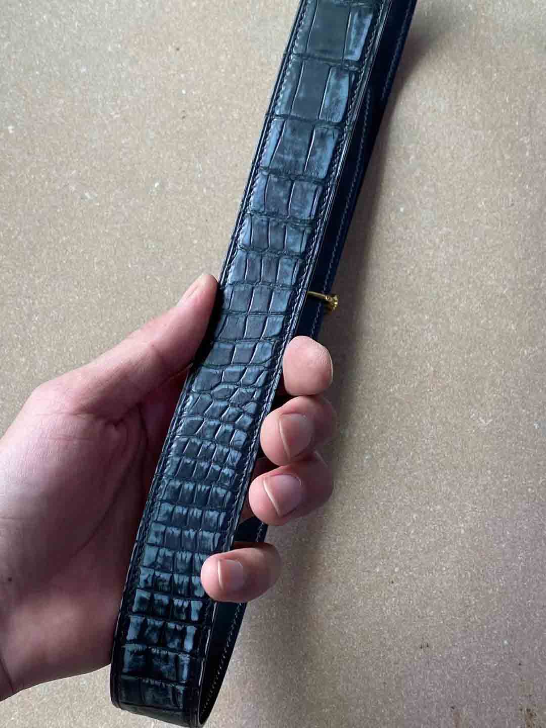 32cm小美洲鳄开料,从头到尾无拼接男士腰带。如果你问我做腰带要用多大的鳄鱼,我会告诉你40~46cm,因为可以开4条且每条纹路都不错,这是成本最低也是绝大部分工作室的做法。这条腰带是32cm小美洲鳄下料,一张鳄鱼皮只能做2条皮带,而且最长只能做110~115cm,使用者腰围不能太大。得到的效果是竹节格子不会很大,从头到尾都有漂亮整齐的密集的纹路,赏心悦目。