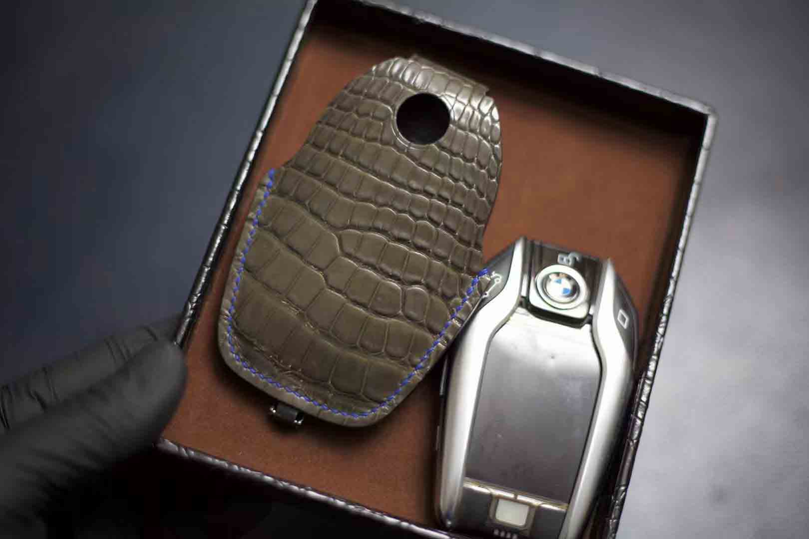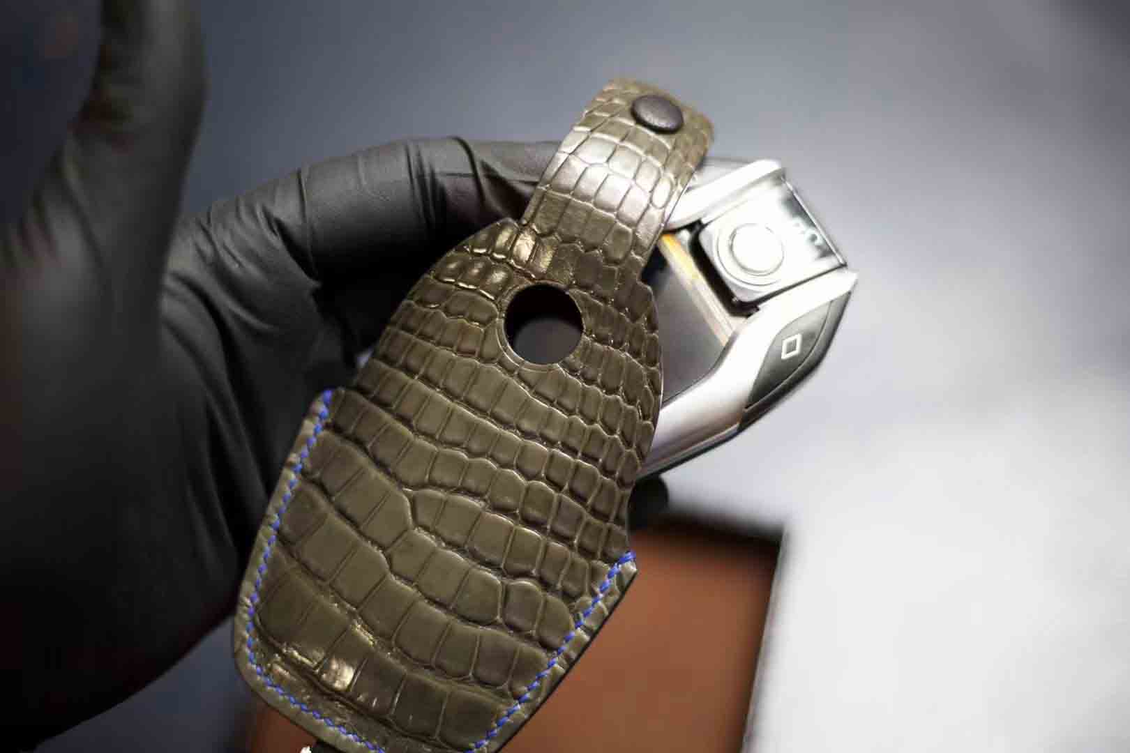 宝马战斗灰洲湾鳄皮钥匙包灰色鳄鱼+蓝线,湾鳄美洲鳄尼罗鳄钥匙套订制微信联系 95506803