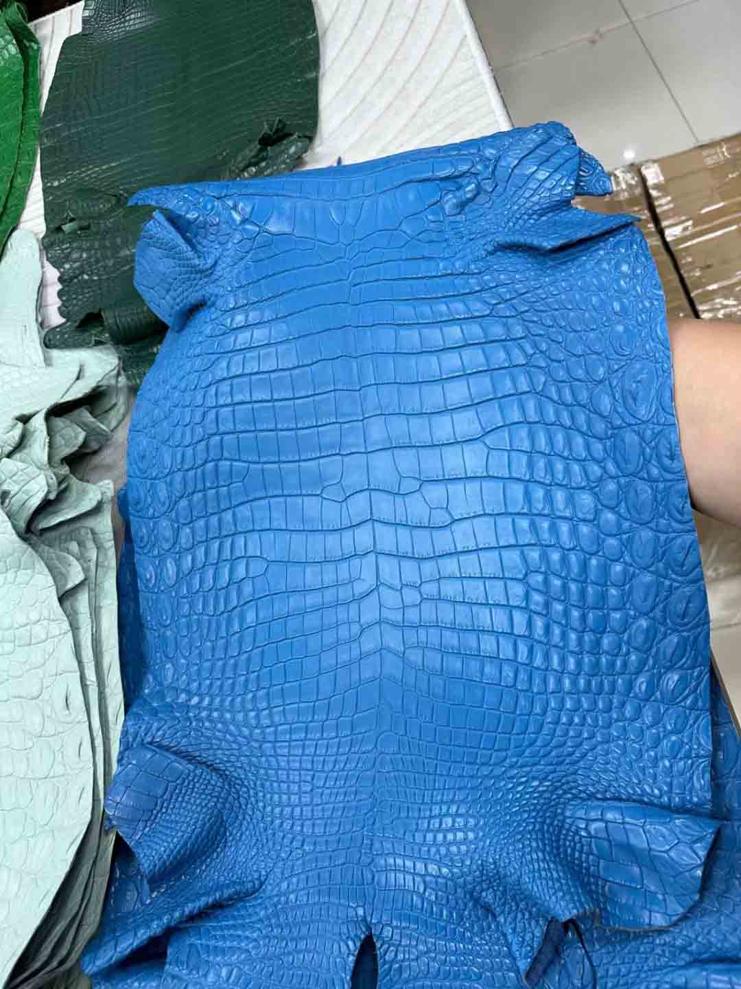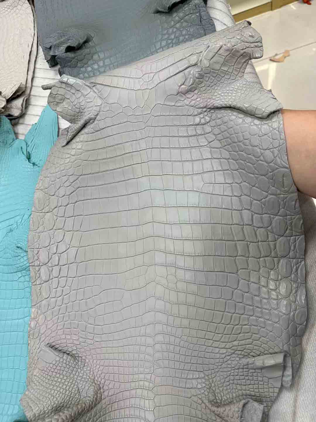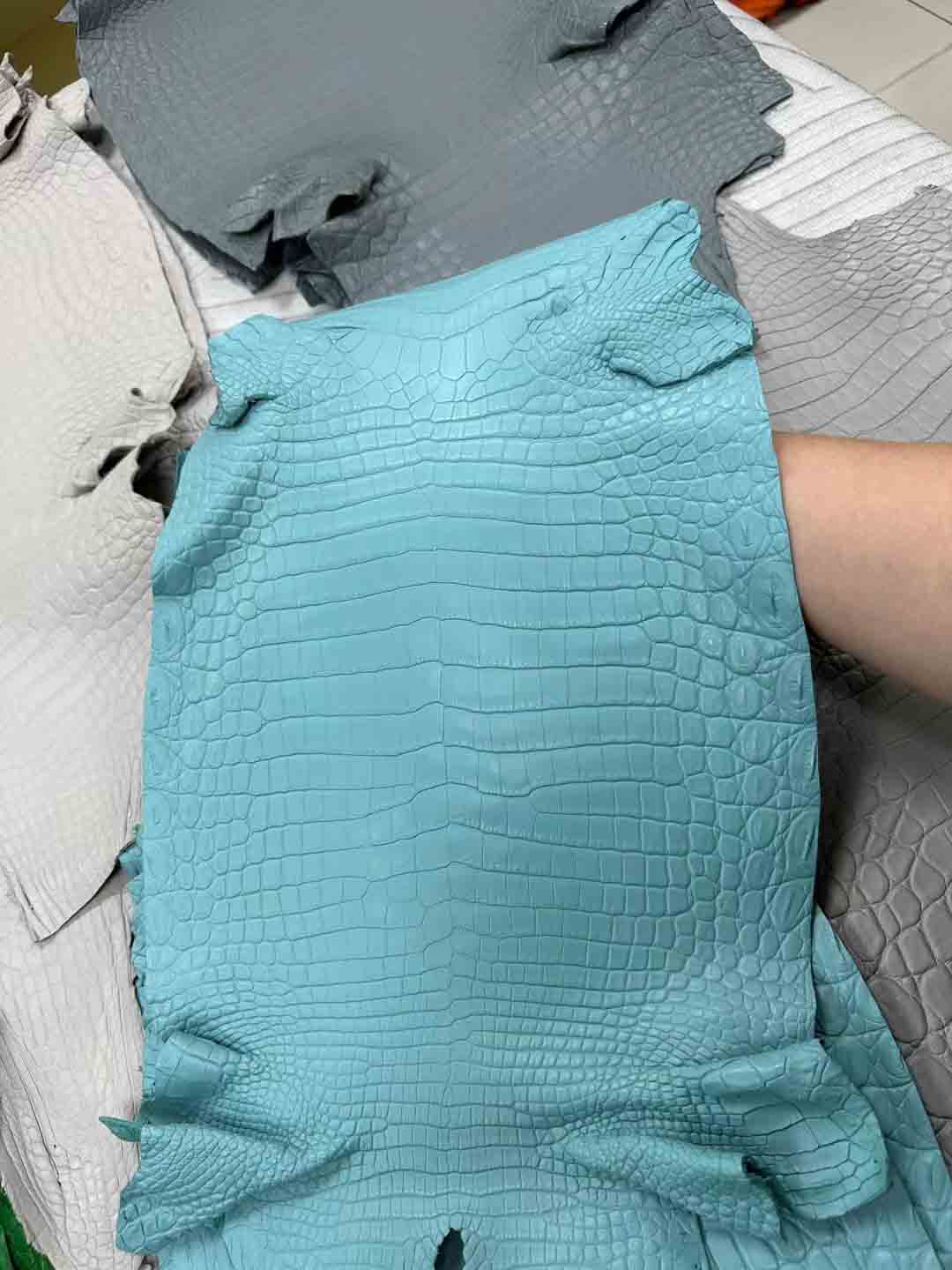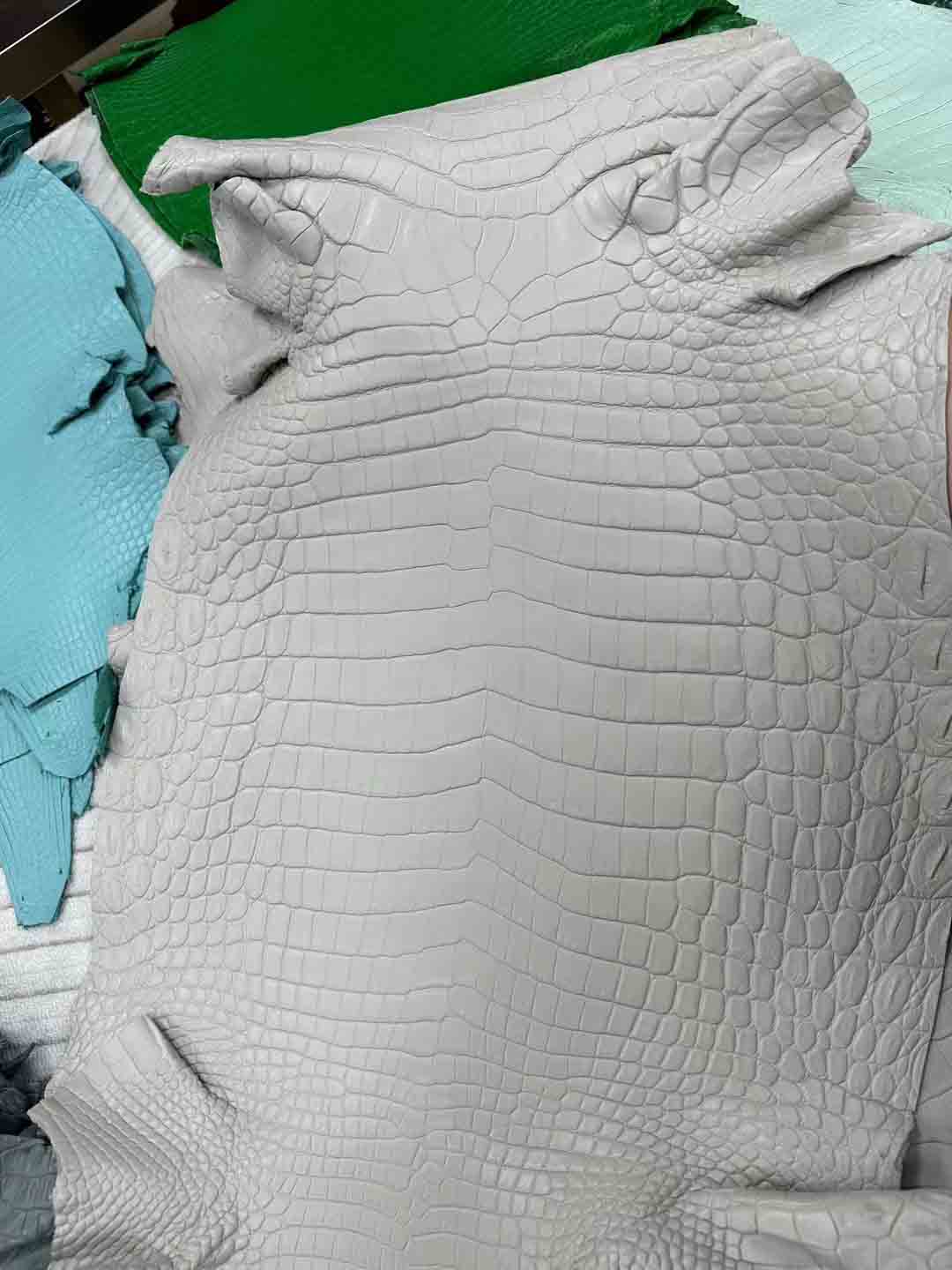 Hcp哑光水染鳄鱼皮料整张,高档的鳄鱼皮箱包和服装价值不菲,高端品牌的高端系列才会使用鳄鱼皮。通过视频对比整张皮的时候其实很容易区分,看肚子和尾巴另外还有尼罗鳄有气孔美洲没有气孔忘了说。哑光和亮光,哑光更体现质感细节,亮光呢就是通过工艺玛瑙抛亮的,特点就是亮,至于那个好那个差看自己的需求,按价值来讲,美洲比尼罗高哑光也比亮光高,但是也很接近 。