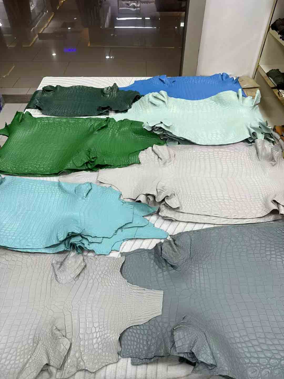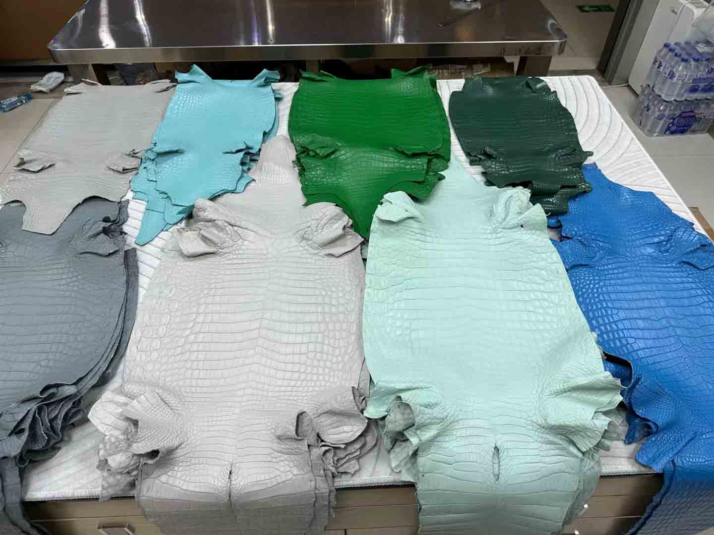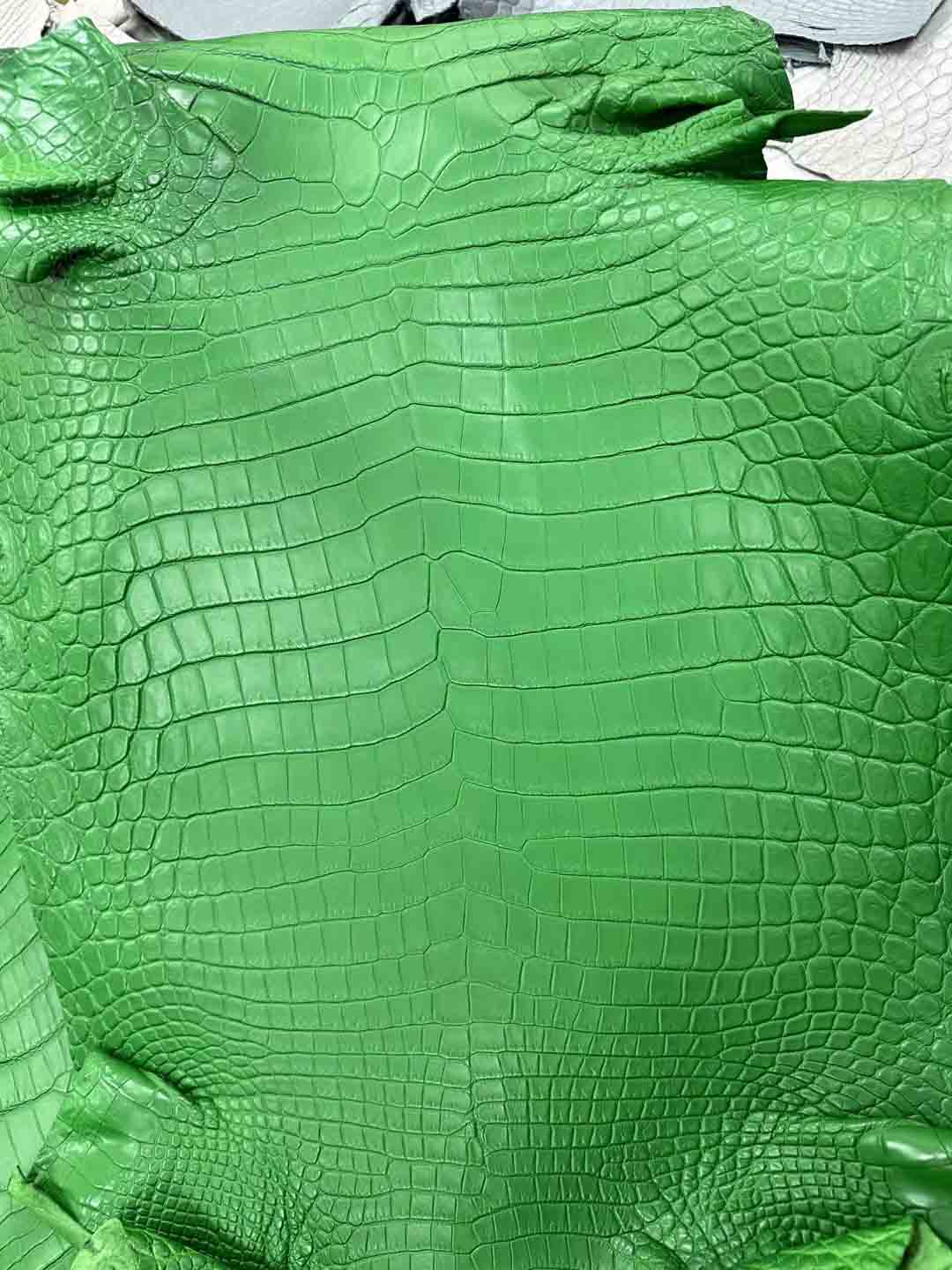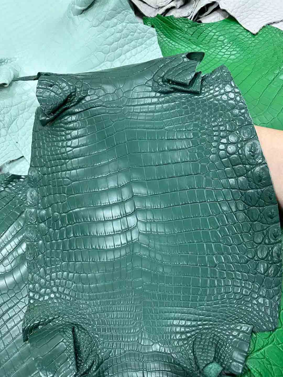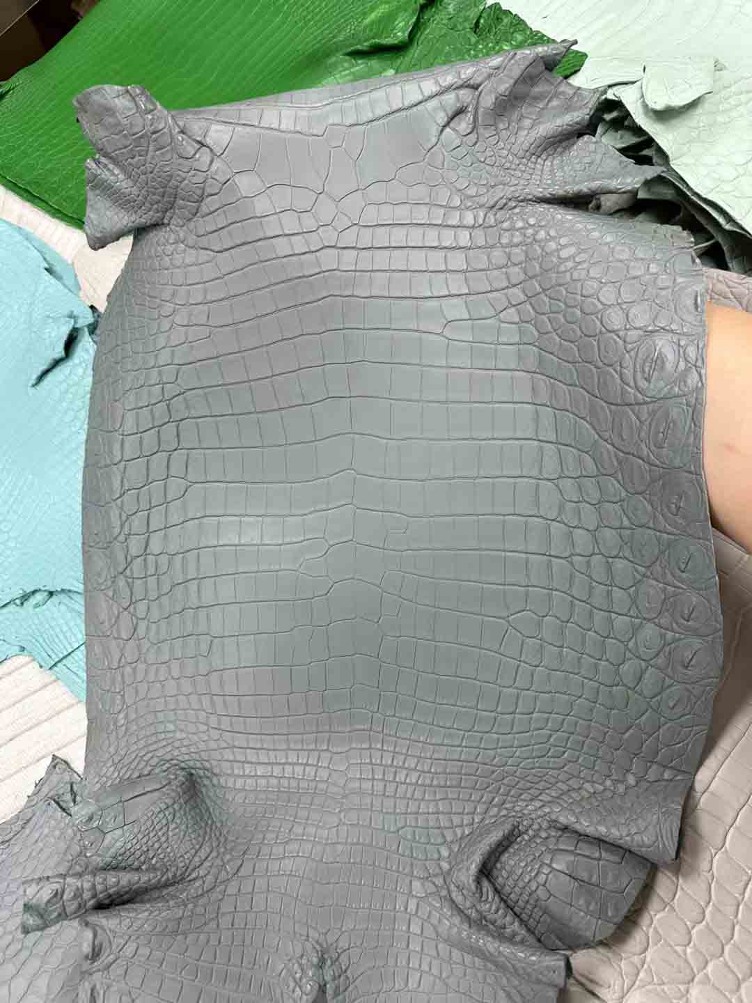 Hcp哑光水染鳄鱼皮料整张,高档的鳄鱼皮箱包和服装价值不菲,高端品牌的高端系列才会使用鳄鱼皮。通过视频对比整张皮的时候其实很容易区分,看肚子和尾巴另外还有尼罗鳄有气孔美洲没有气孔忘了说。哑光和亮光,哑光更体现质感细节,亮光呢就是通过工艺玛瑙抛亮的,特点就是亮,至于那个好那个差看自己的需求,按价值来讲,美洲比尼罗高哑光也比亮光高,但是也很接近 。