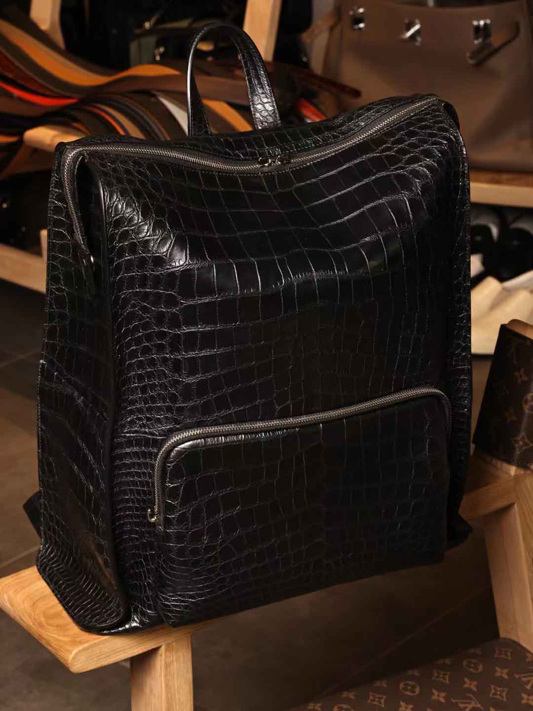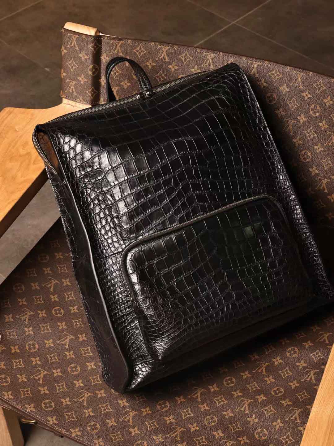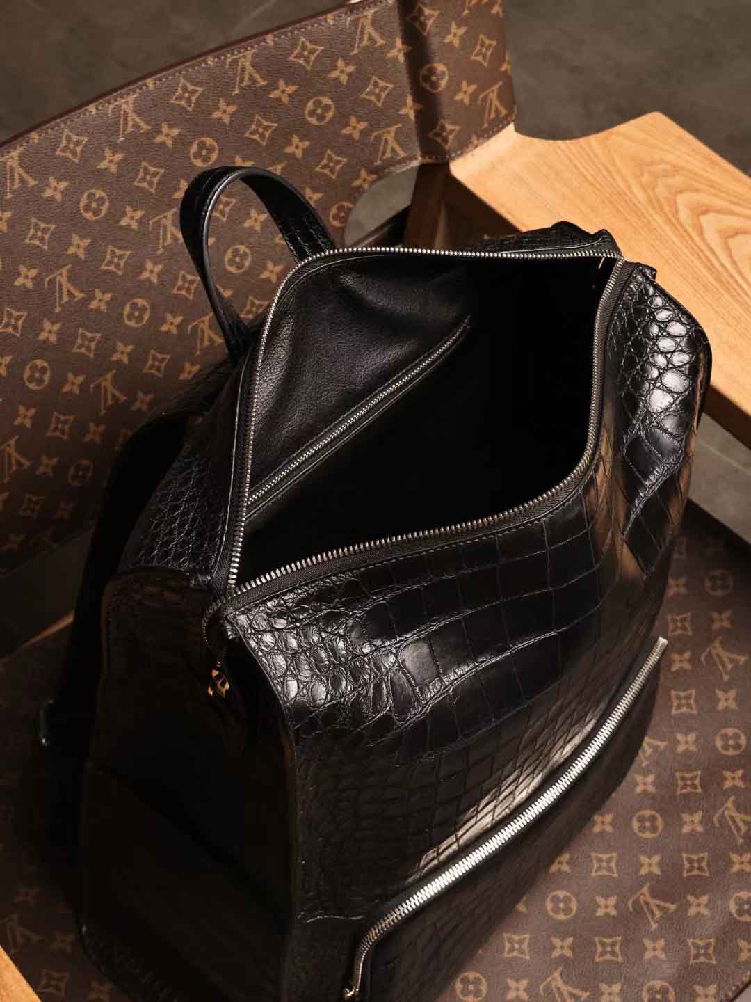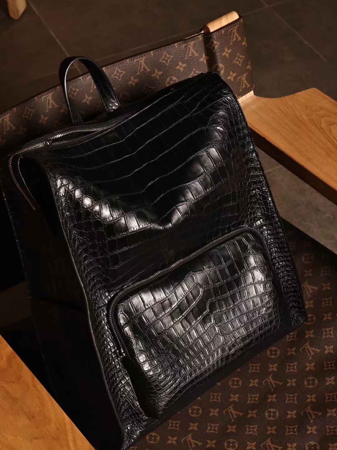 复古经典的鳄鱼皮双肩包 但也是能装挺多东西的~比小废包好多了,鳄鱼皮黑色油蜡皮光泽感十足然后也十分耐操。