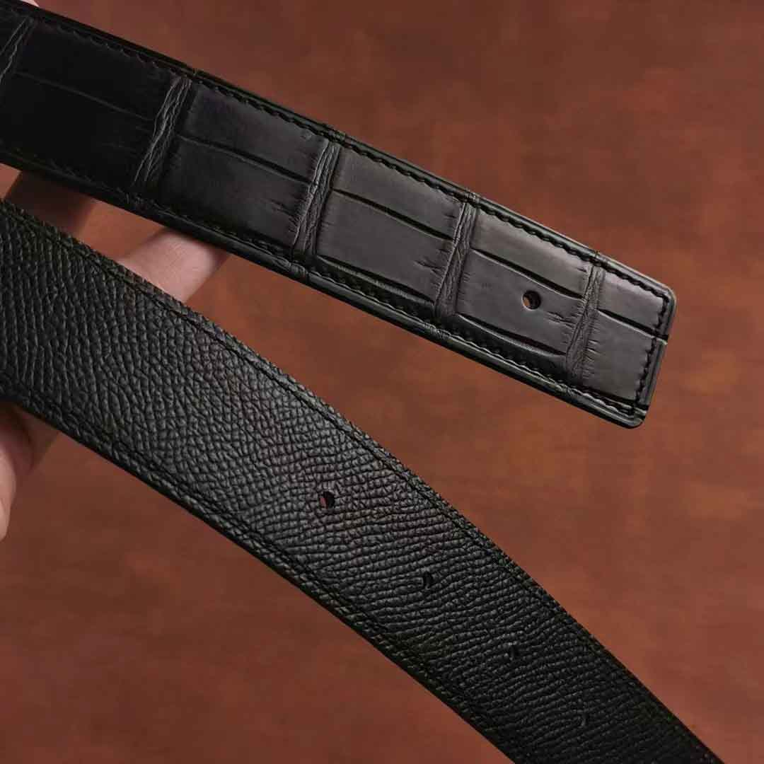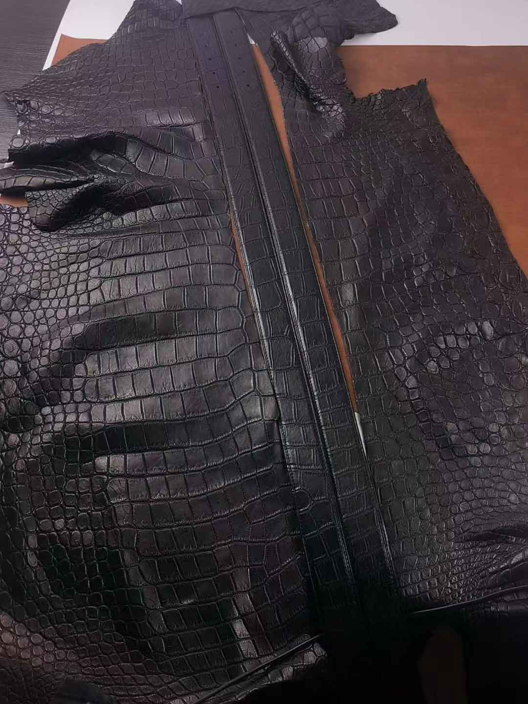 客供钨钢扣头,一次订做2条湾鳄腰带。客人选择纯水染的HCP湾鳄服装革,服装革鞣制工艺应该是最贵的工艺了,既要没有覆盖性喷涂保证柔软自然的皮面,还要很薄的同时保证韧性和手感。选用意大利臀背植鞣作夹芯,底皮选用HAAS工厂的Epsom小牛皮,都是偏硬挺的皮料,皮带做好整体非常有弹性和密度。