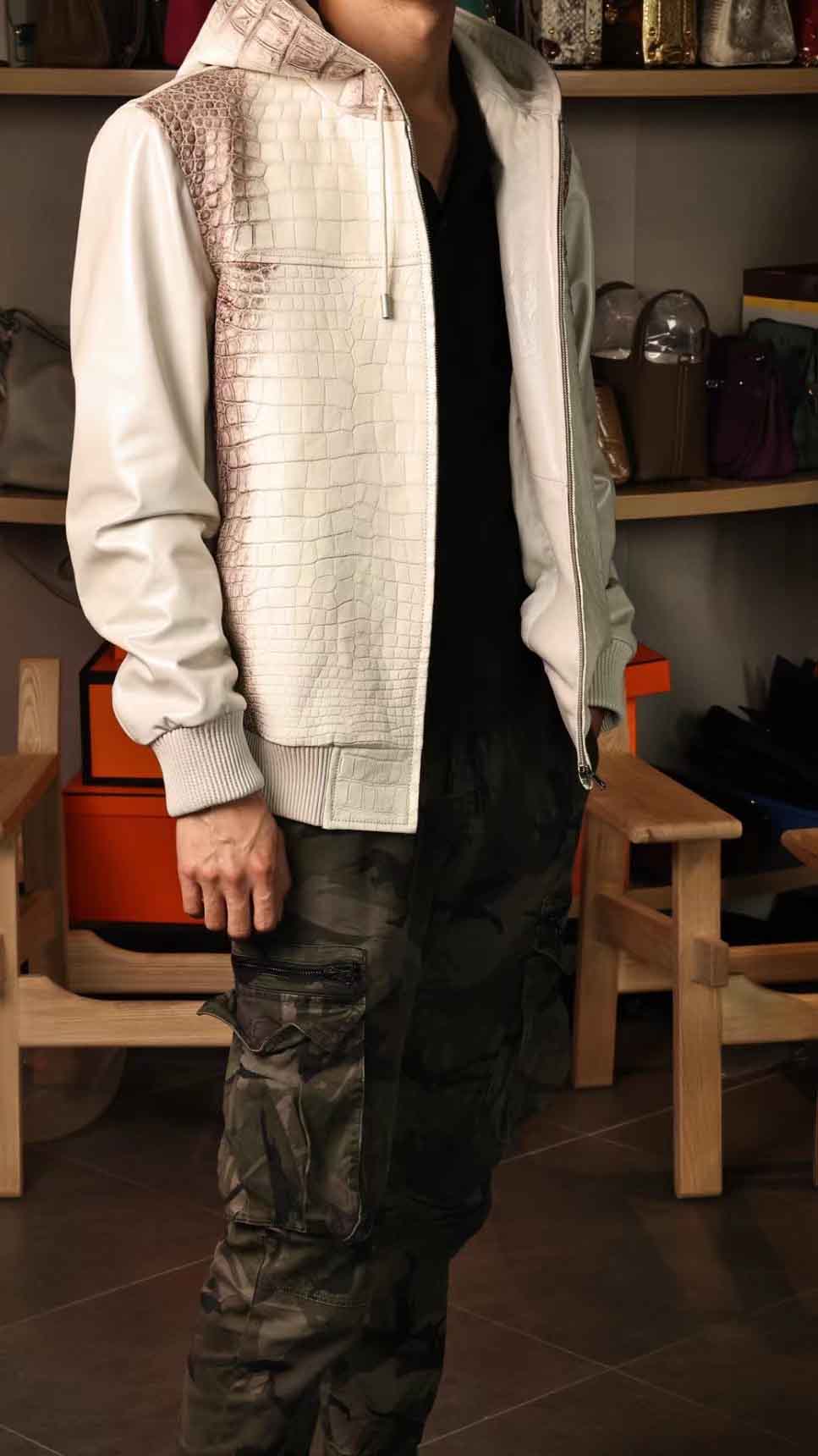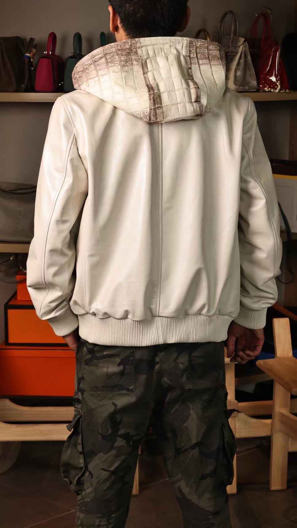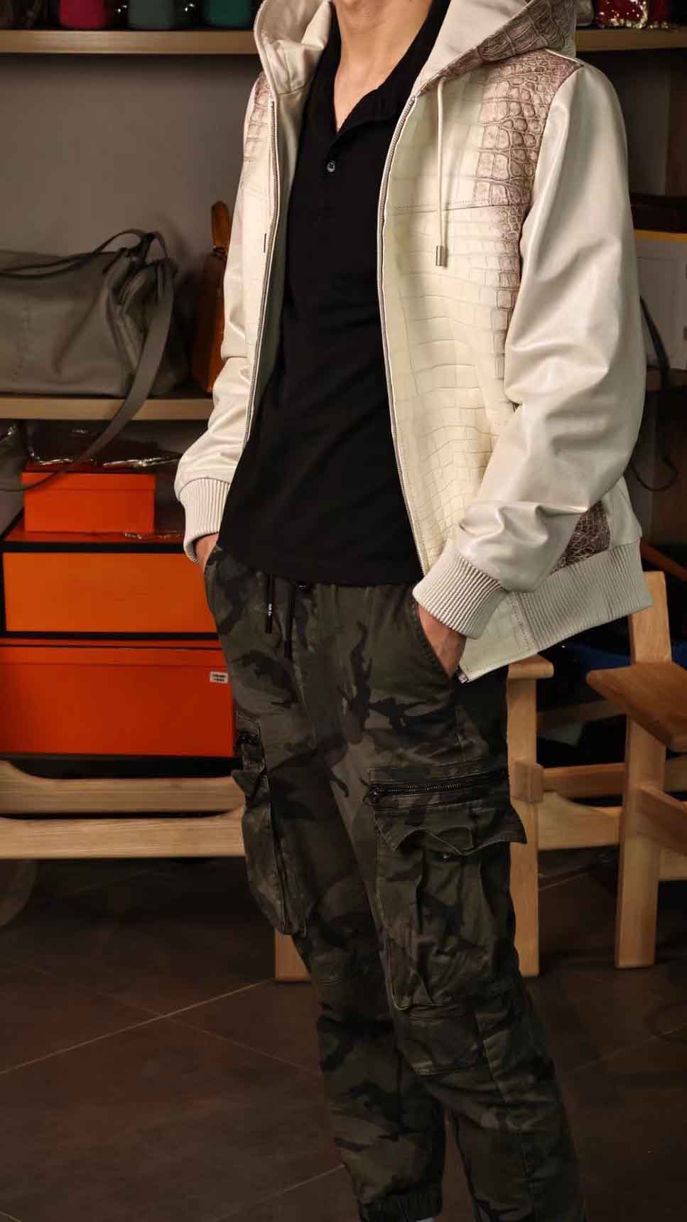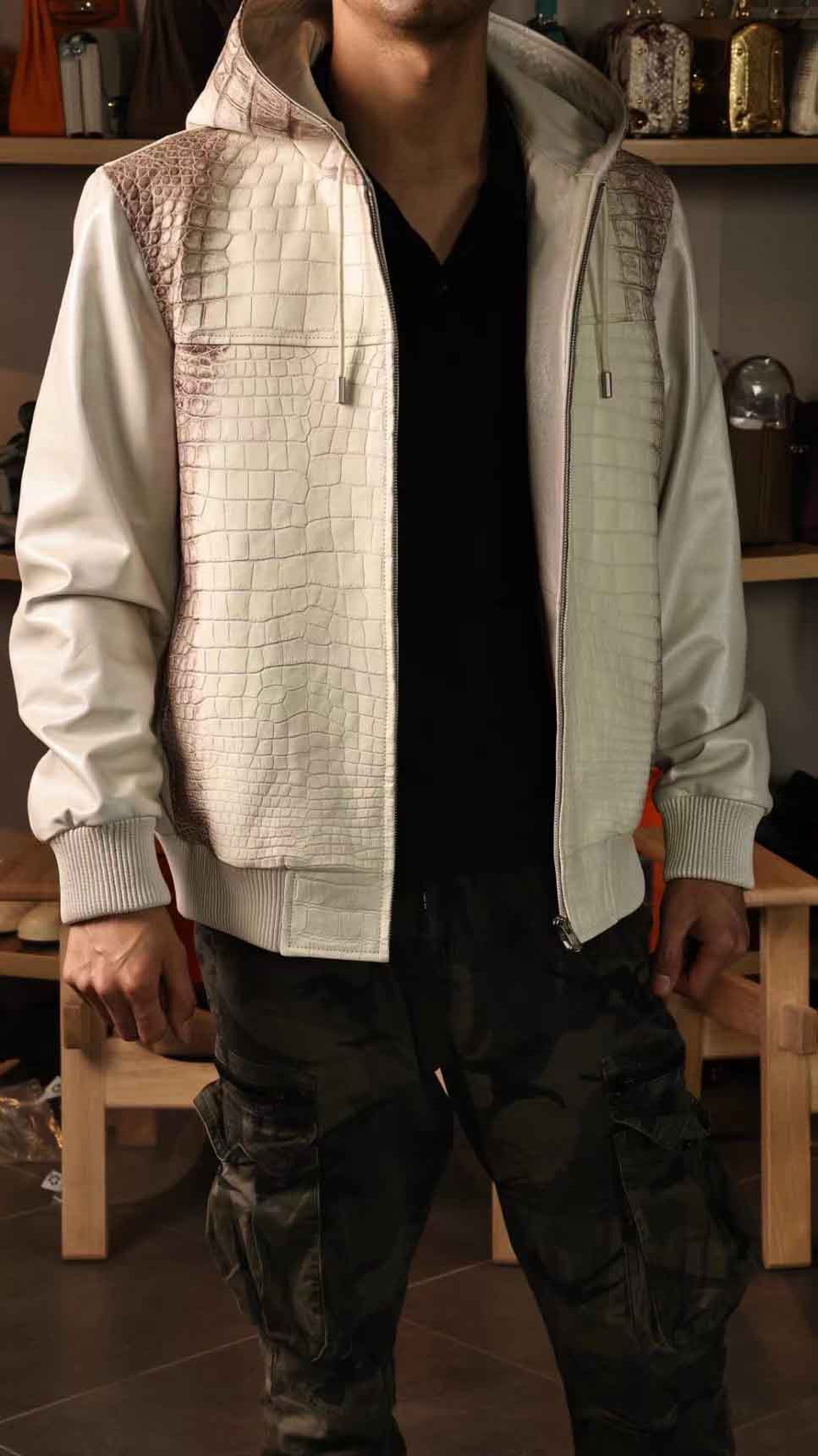 连体帽款半鳄鱼皮衣,喜马拉雅鳄鱼配珠光绵羊皮,超柔软特殊效果,暂时只有现货,没办法定制(喜马拉雅鳄鱼皮可以定,珠光羊皮暂时没有了),50/52码现货。