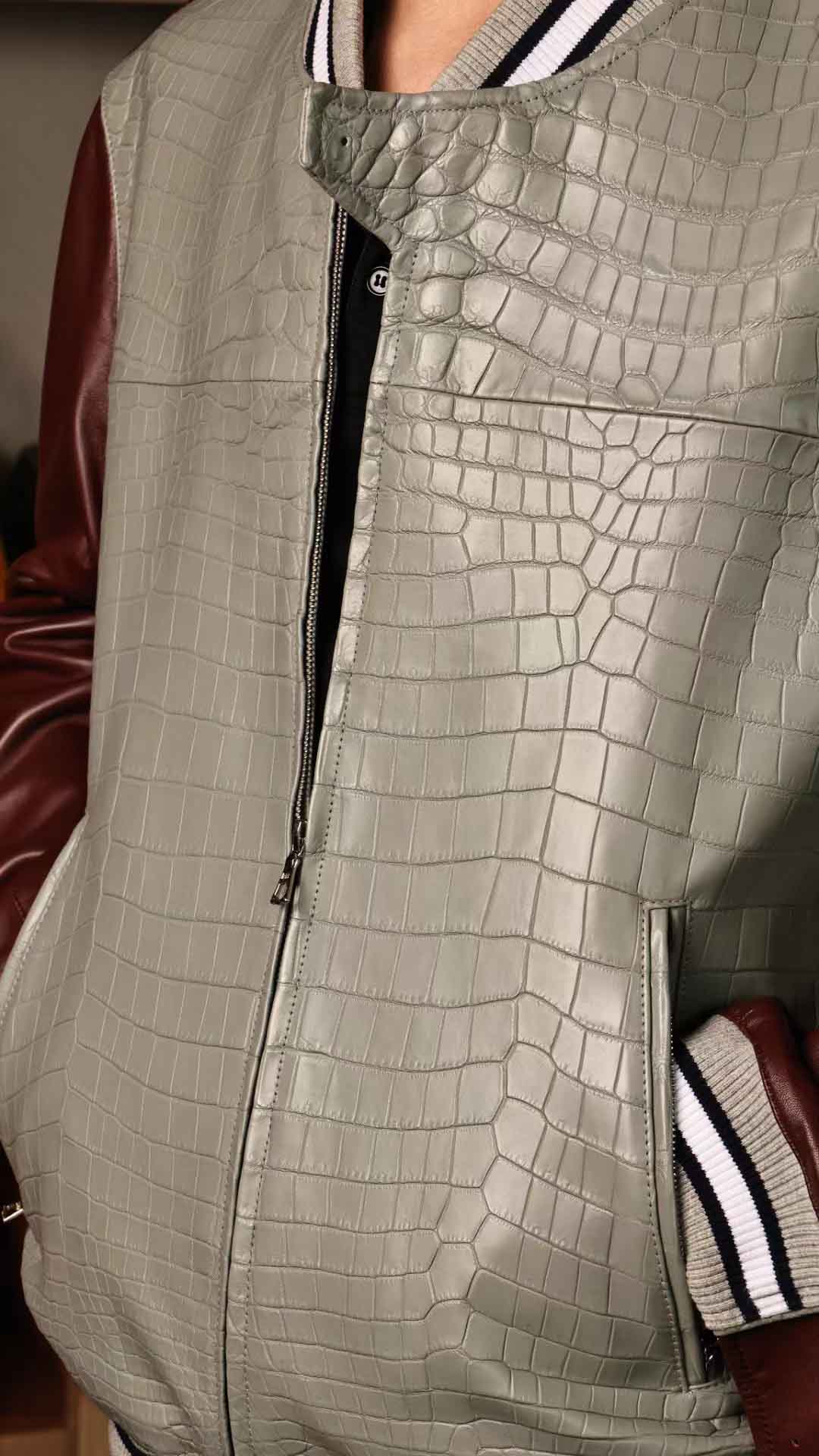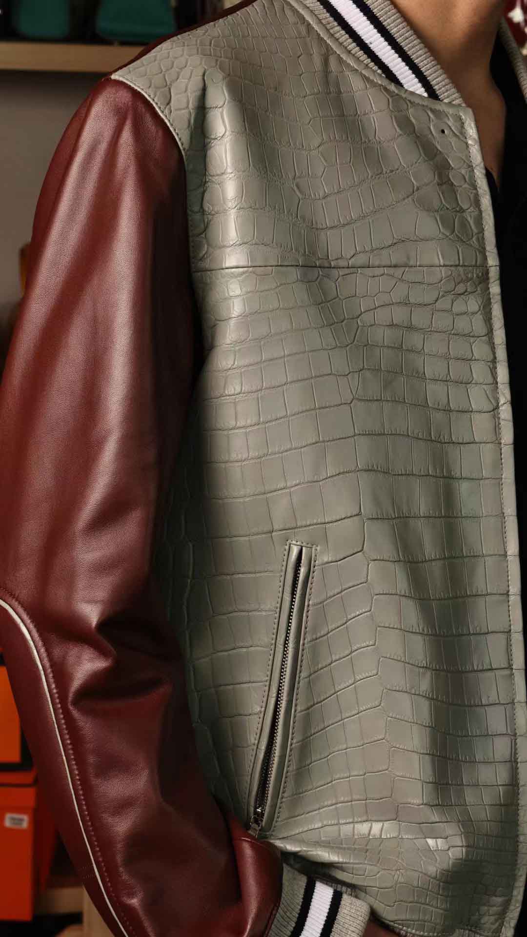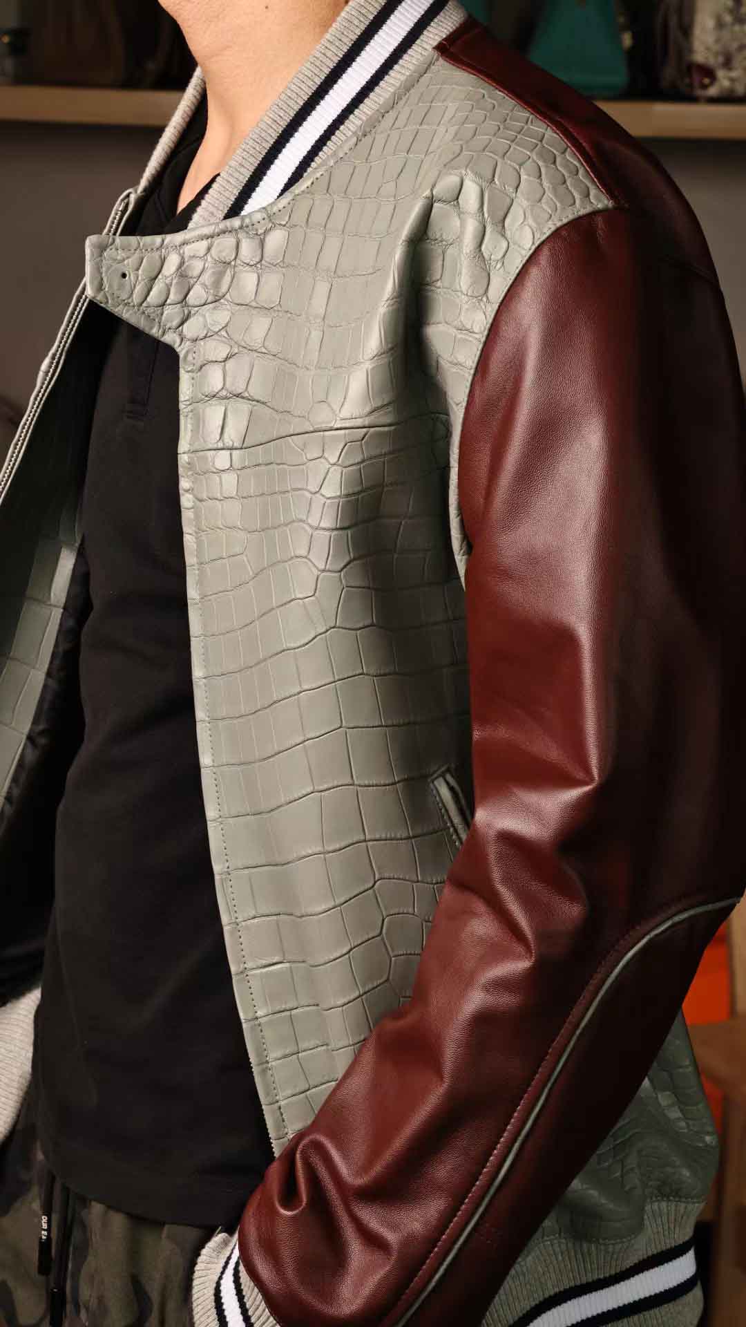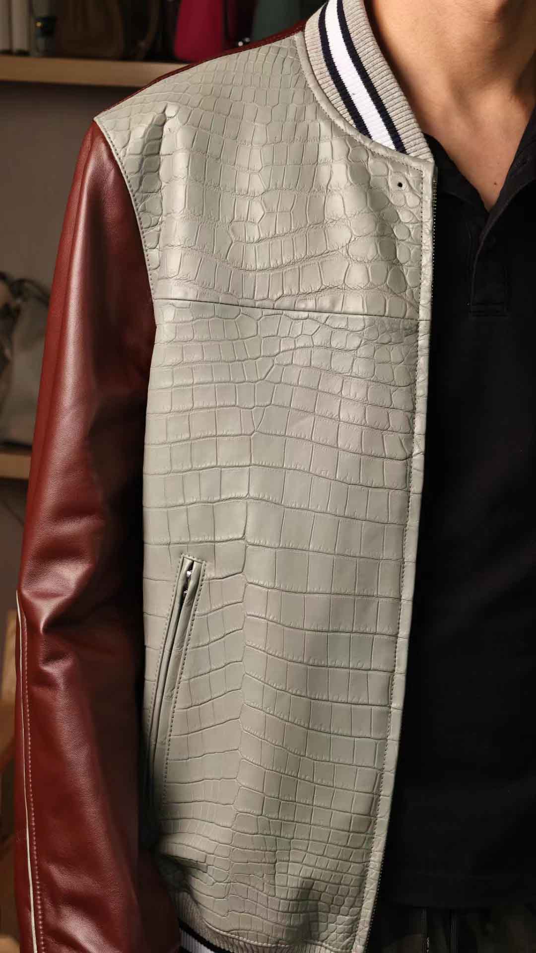 拼皮棒球服,斑鸠灰鳄鱼拼酒红色绵羊皮,52码实拍现货,新鲜出炉。预约订做其他颜色男女棒球服装微信联系 95506803
