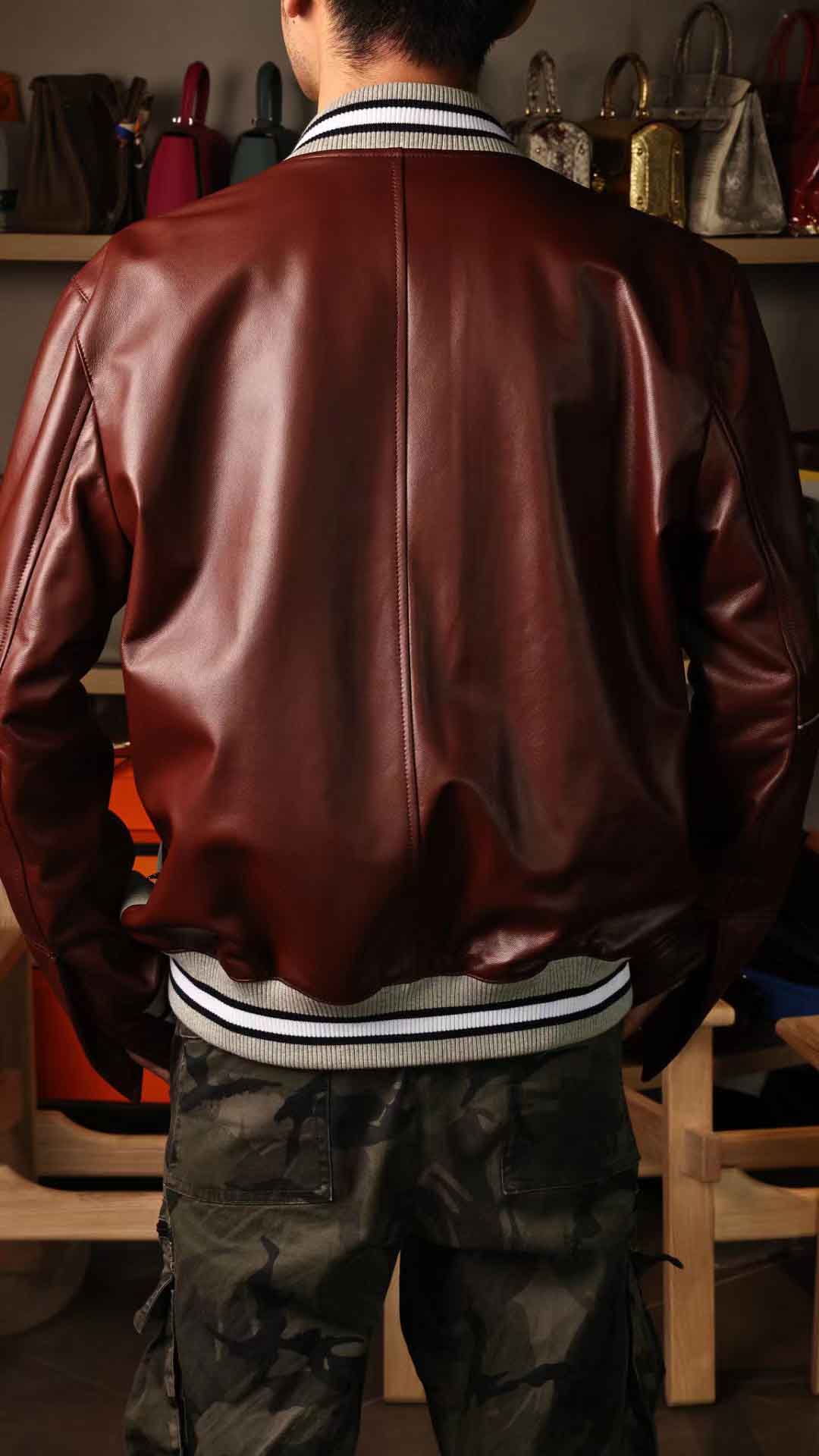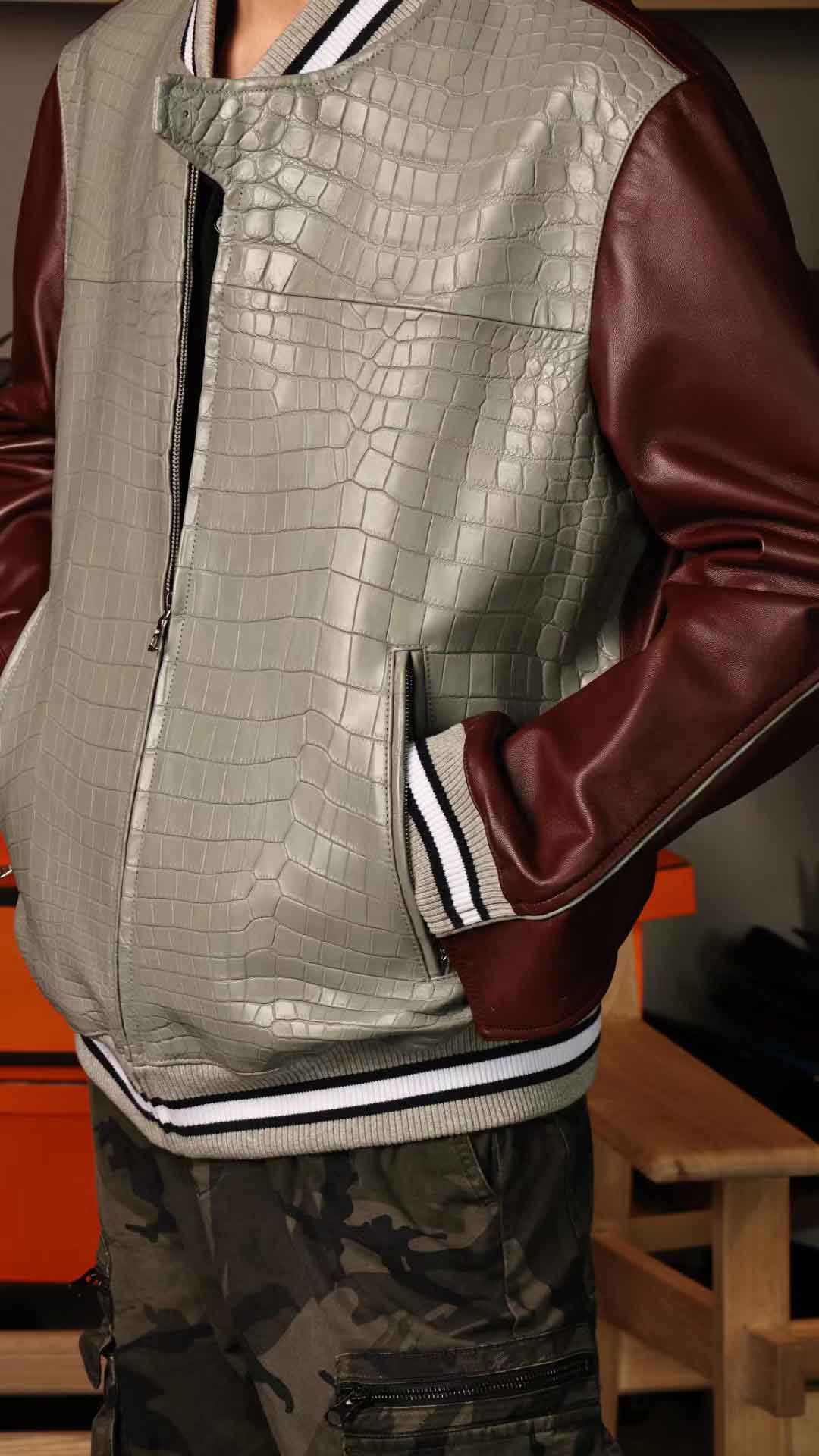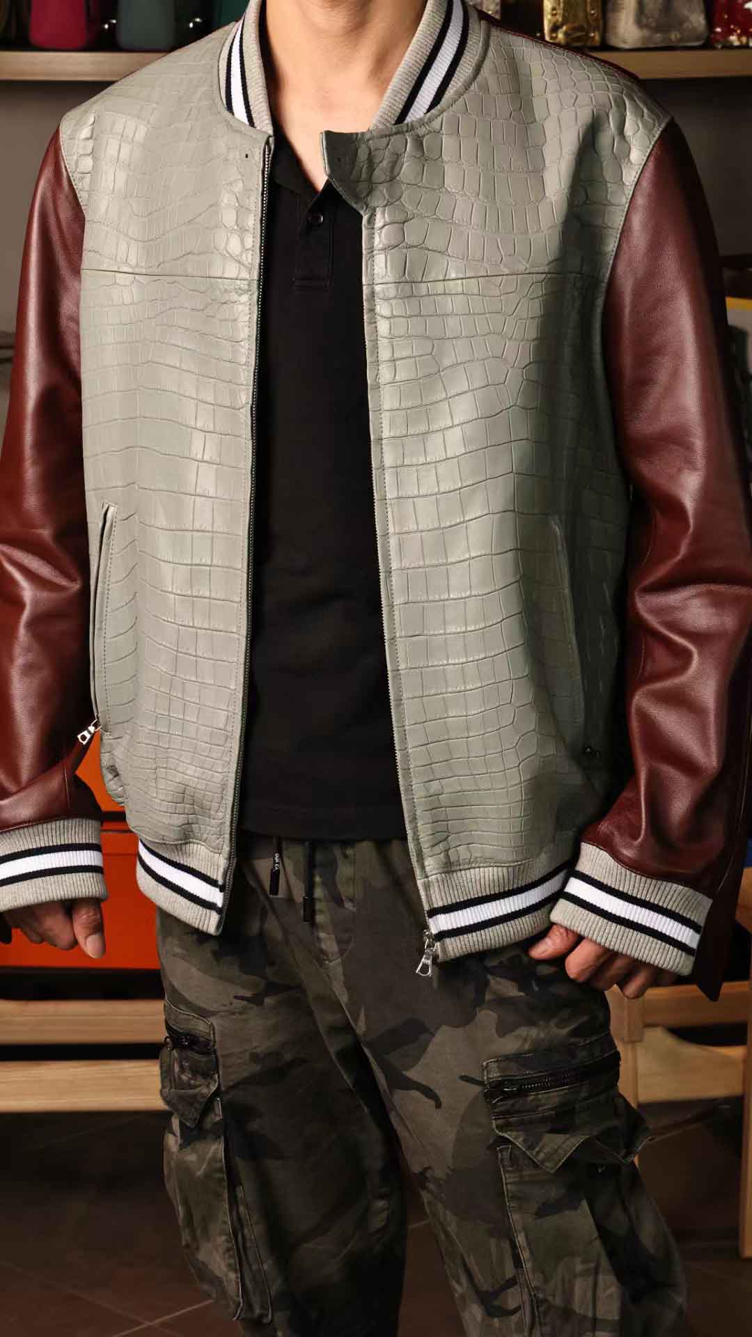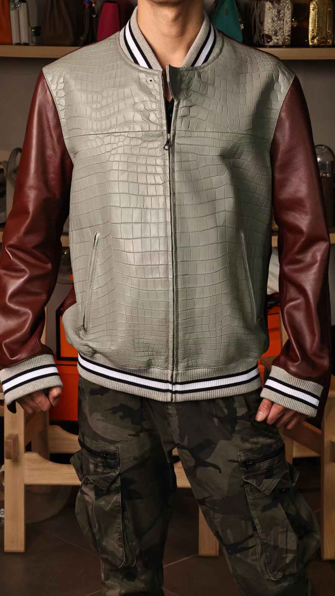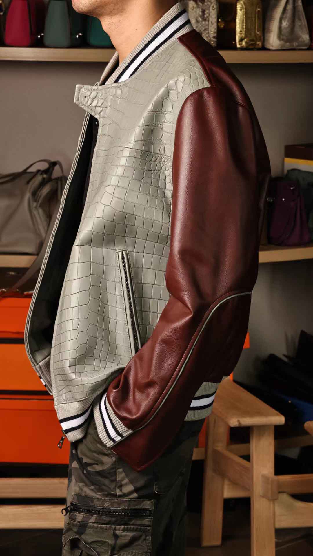 拼皮棒球服,斑鸠灰鳄鱼拼酒红色绵羊皮,52码实拍现货,新鲜出炉。预约订做其他颜色男女棒球服装微信联系 95506803
