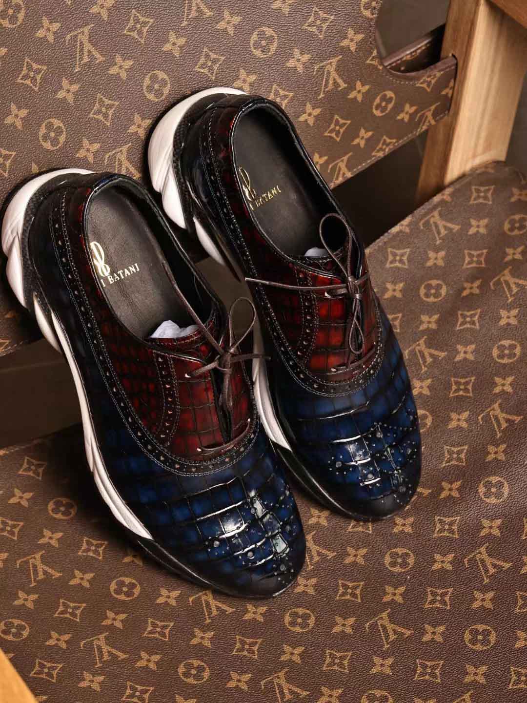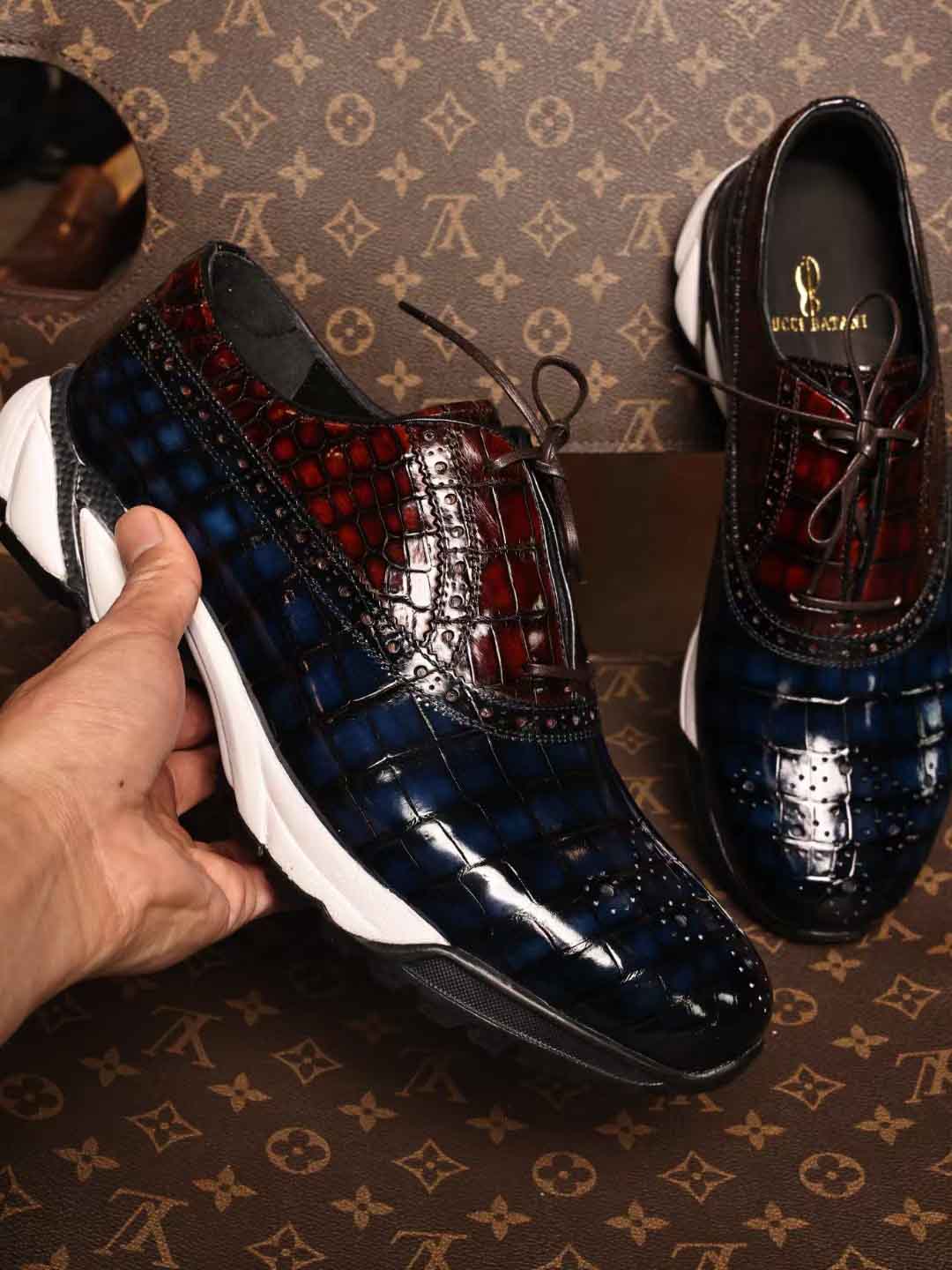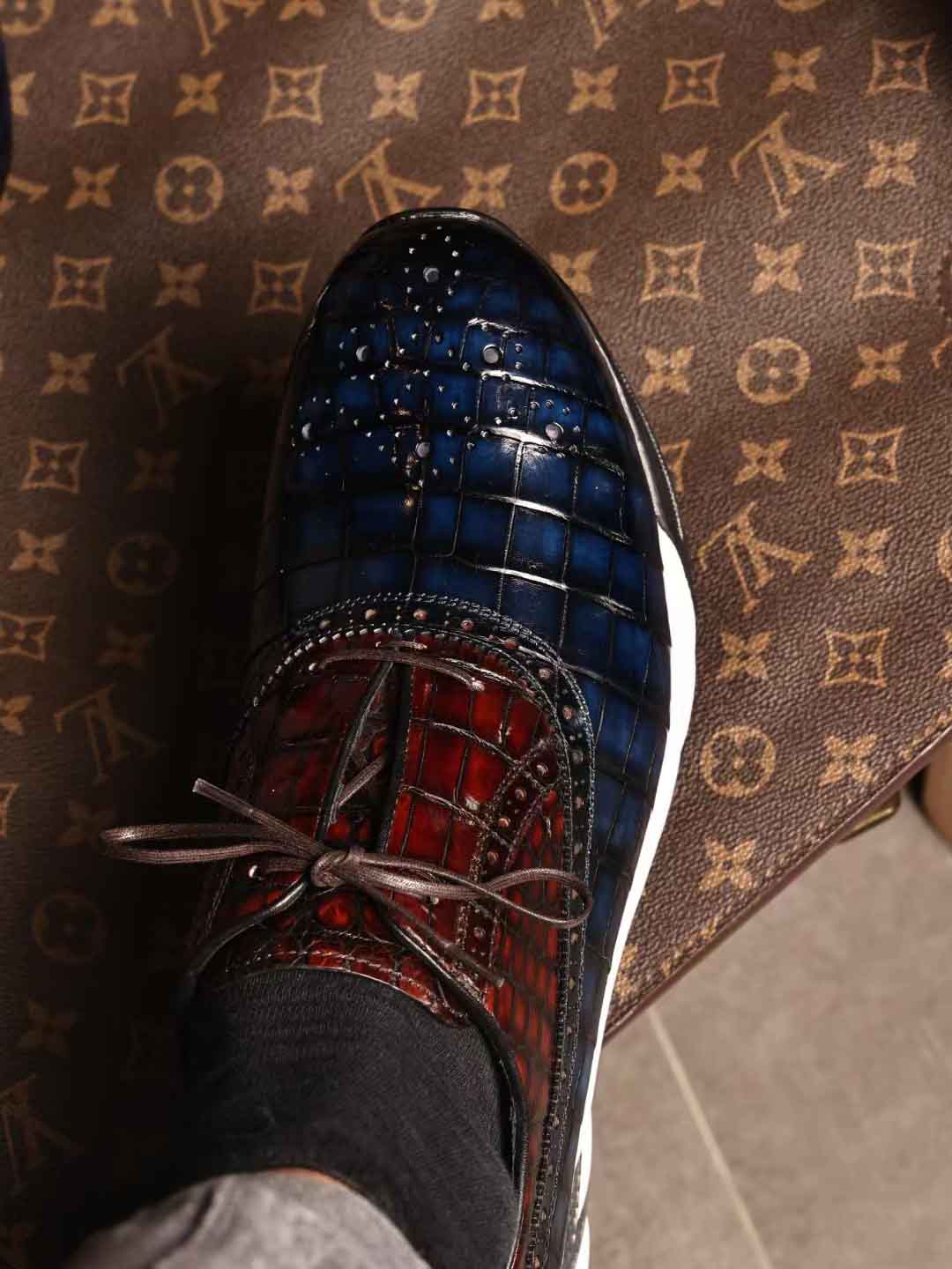 尼罗鳄擦色鳄鱼皮鞋,月白蓝拼胭脂红,客订出货。可以定制其他diy颜色的鳄鱼皮休闲鞋联系微信 95506803