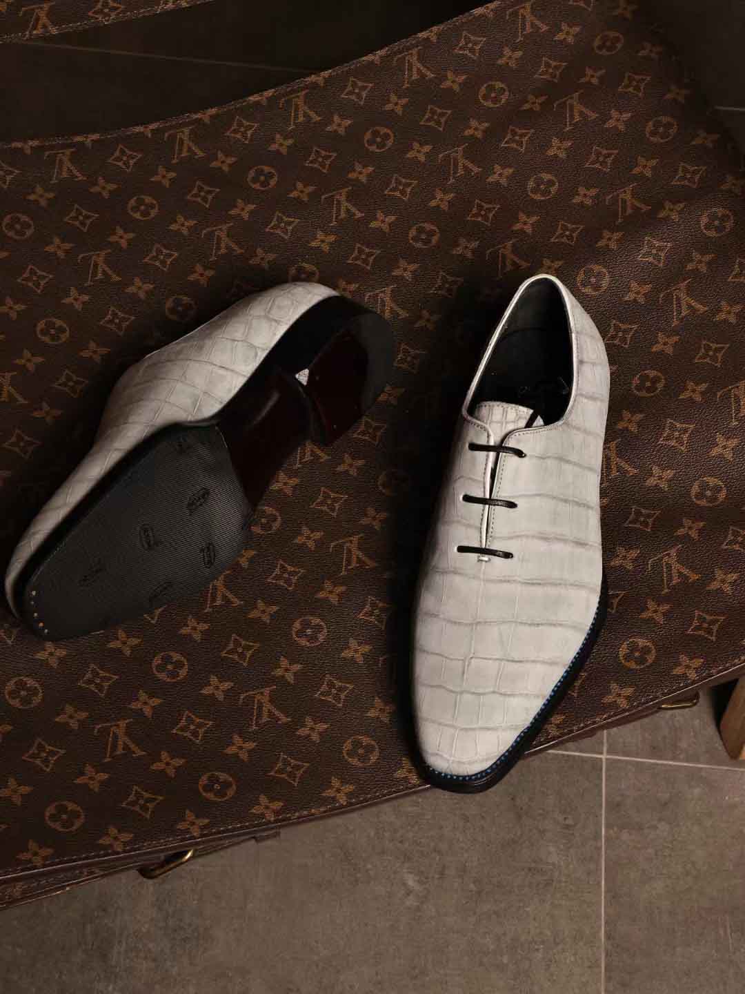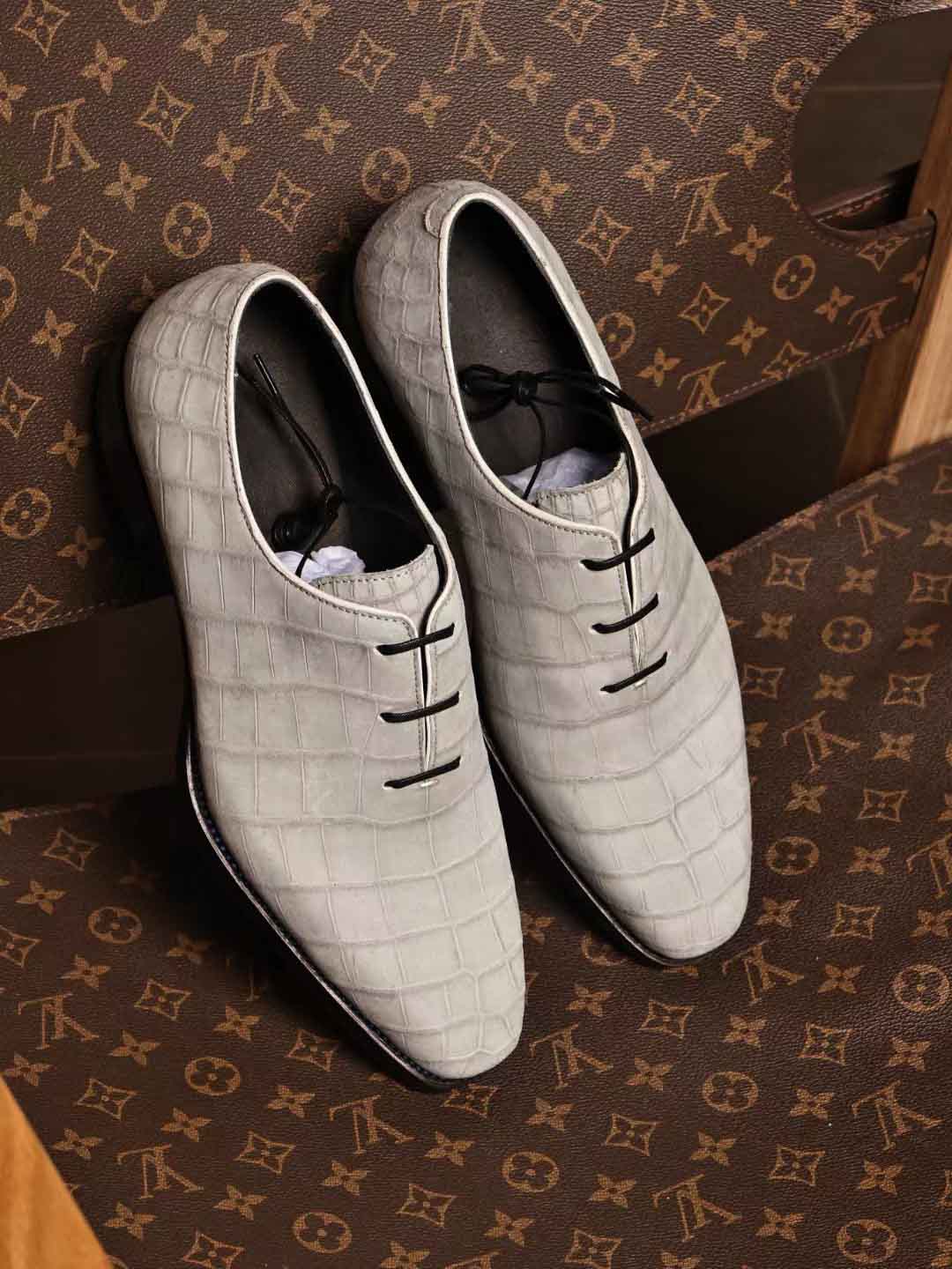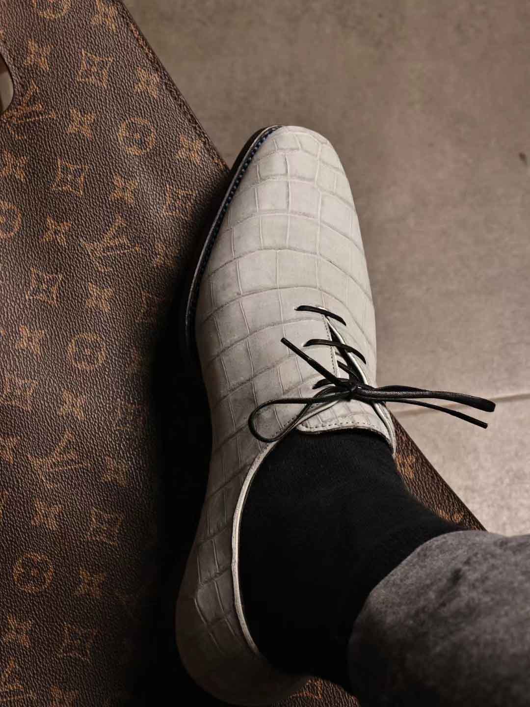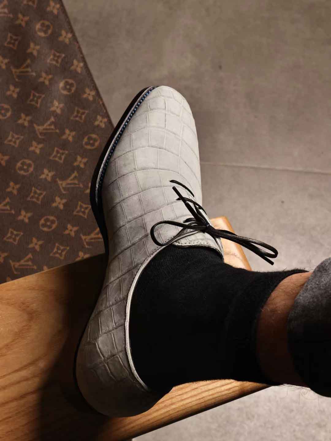 一片式牛津鞋,灰白色磨砂鳄鱼皮皮,客订出。可以预约订做其他颜色鳄鱼皮皮鞋,也可以定做鳄鱼皮其他款式皮鞋微信联系95506803
