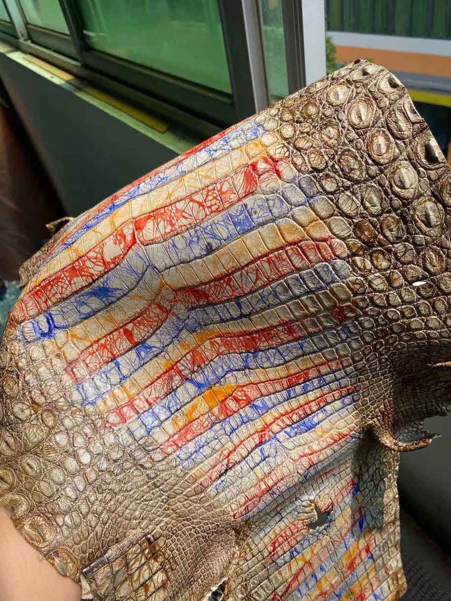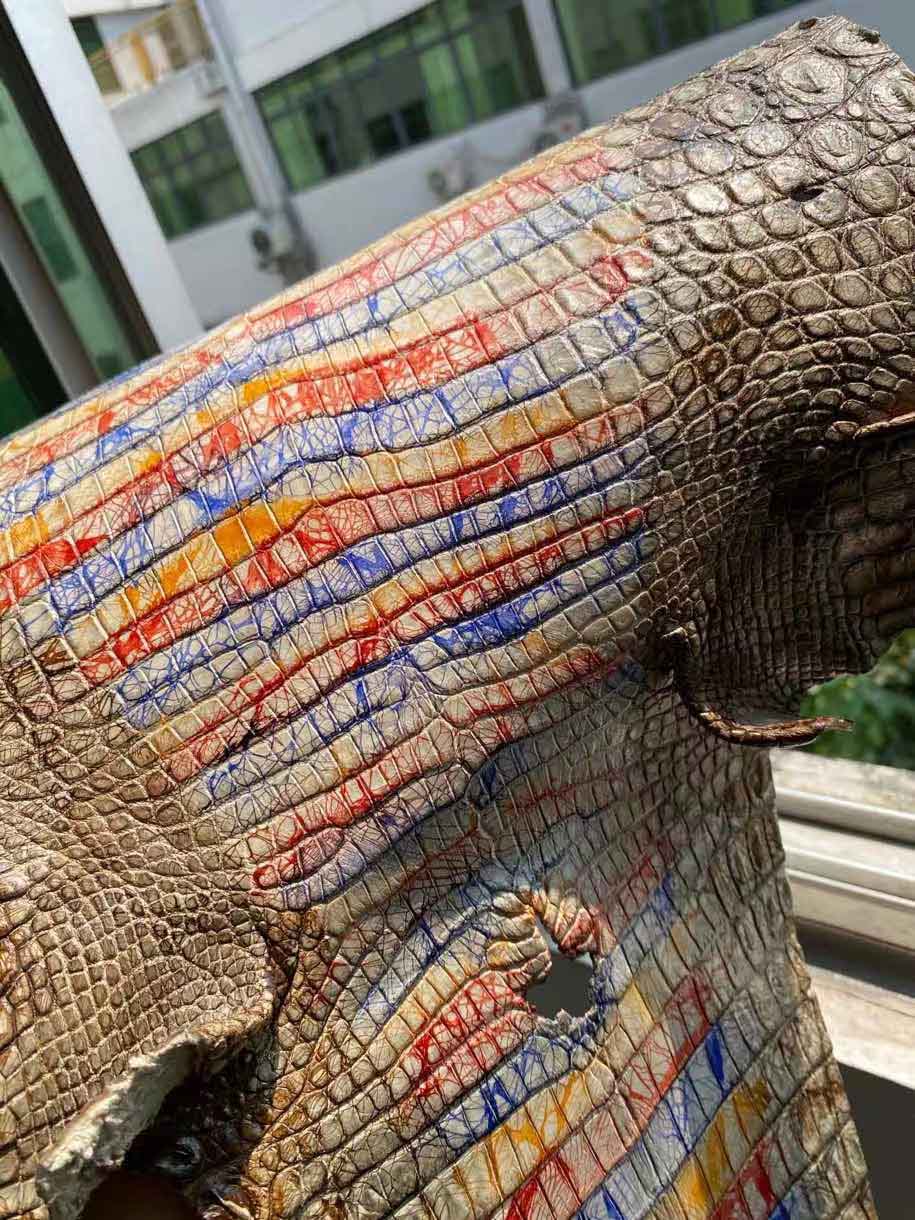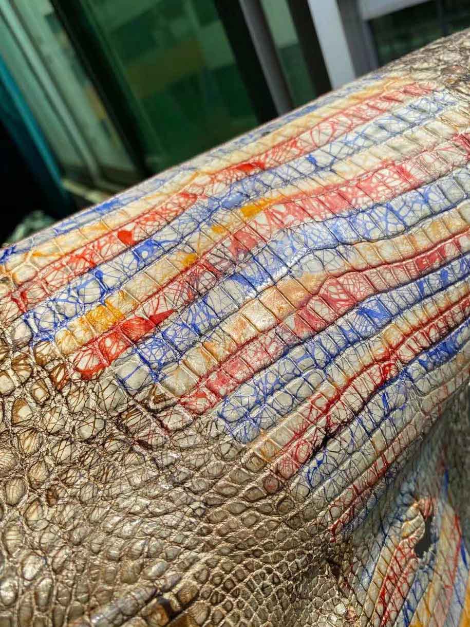 扎染彩绘鳄鱼皮,水彩画风格,喜欢独特设计的朋友可以过来聊一聊研发。预约订做扎染彩绘鳄鱼皮包,皮鞋,风衣订做微信 95506803