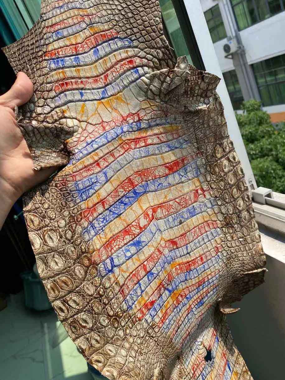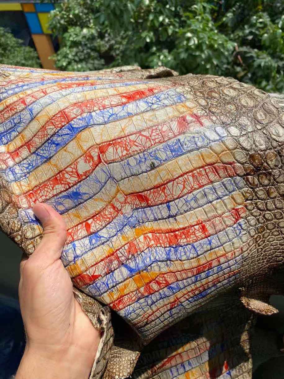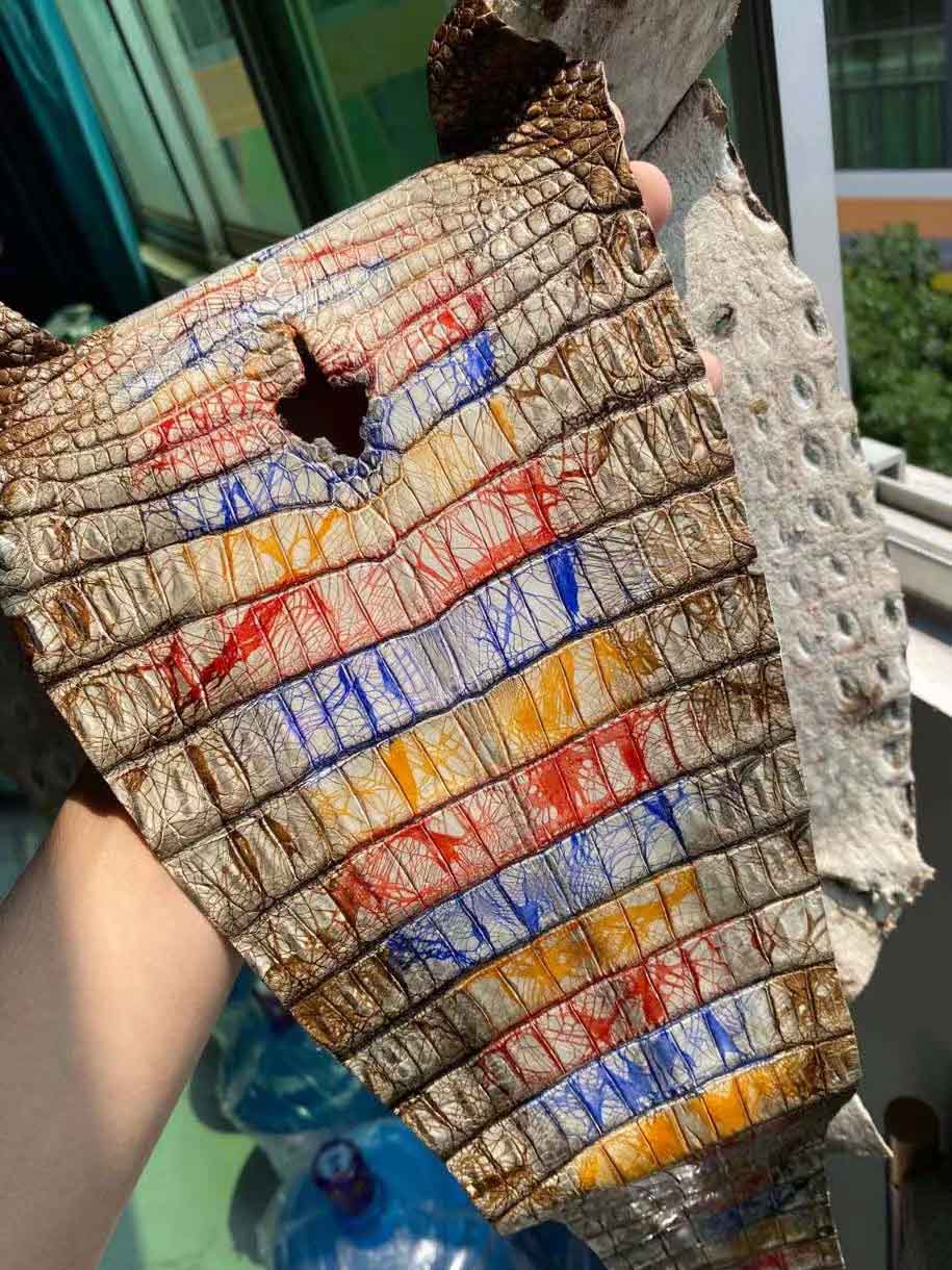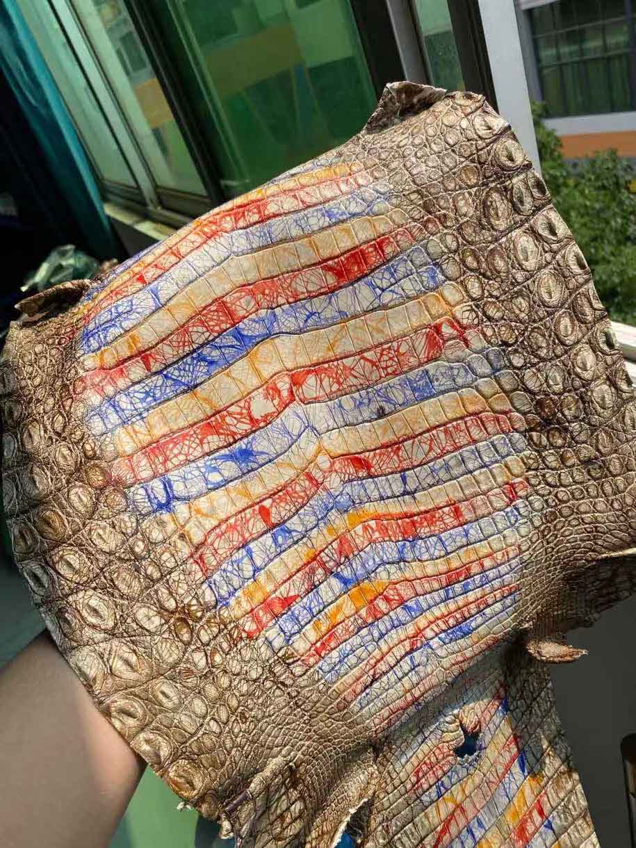 扎染彩绘鳄鱼皮,水彩画风格,喜欢独特设计的朋友可以过来聊一聊研发。预约订做扎染彩绘鳄鱼皮包,皮鞋,风衣订做微信 95506803