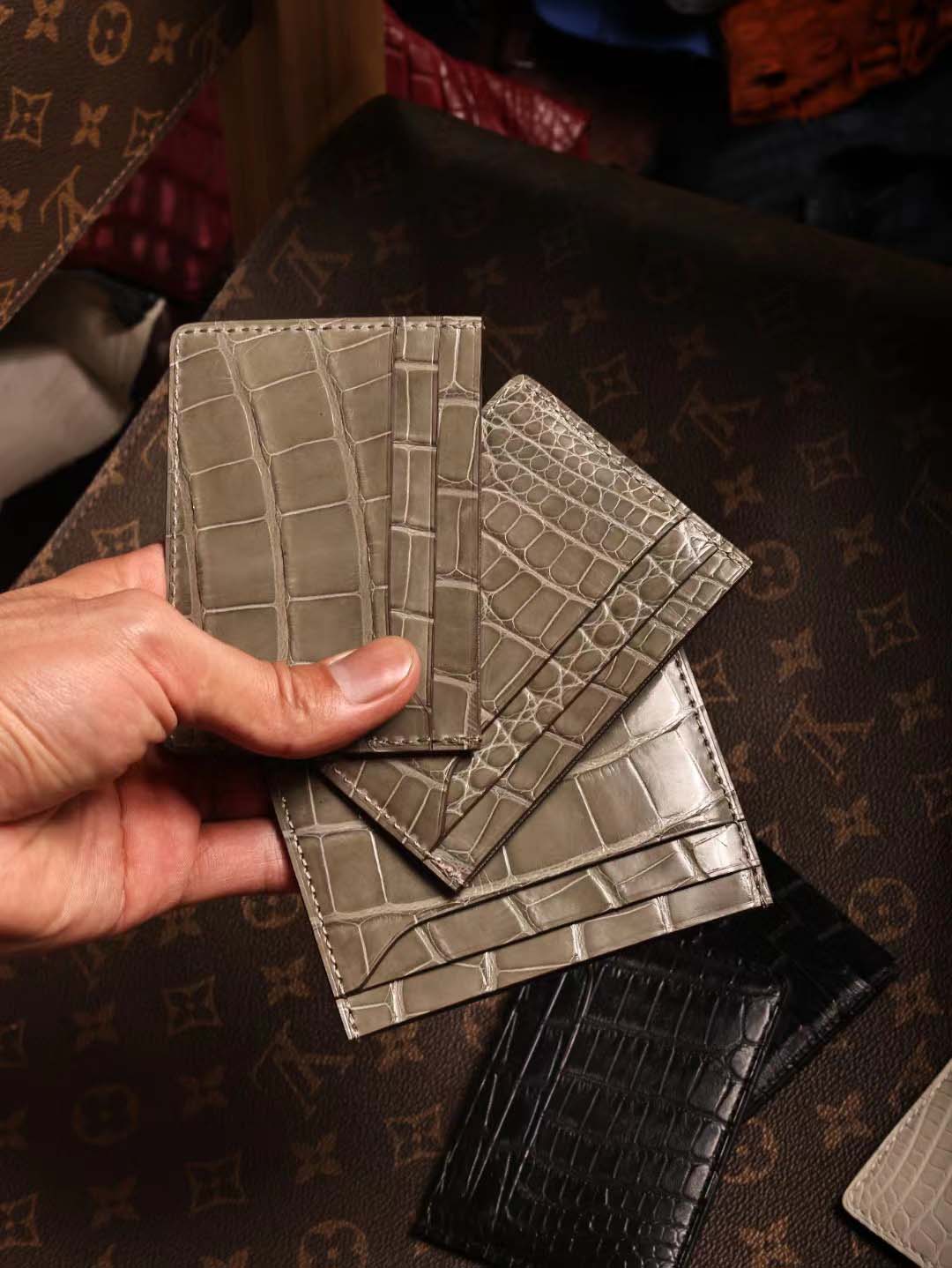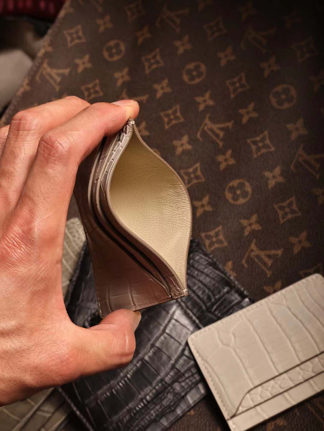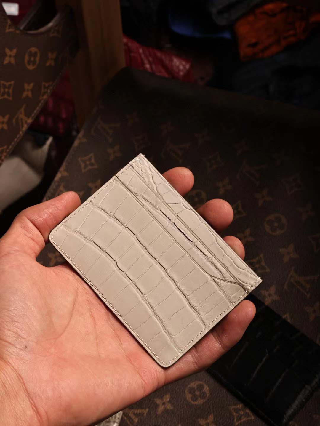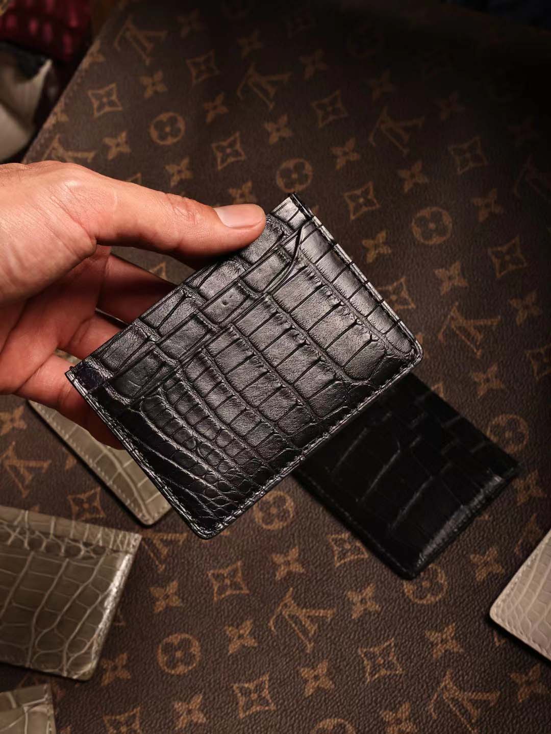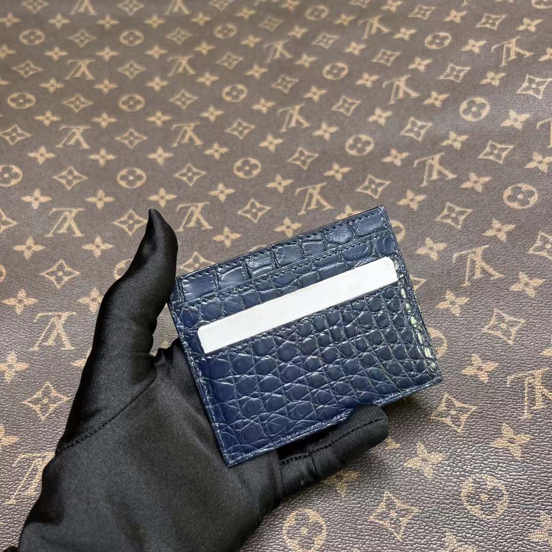 鳄鱼皮卡包算是我们家比较经典的款了 鳄鱼皮双面双卡位,一共四个卡槽, 鳄鱼皮中间夹层也可以收纳小几张卡片呢。