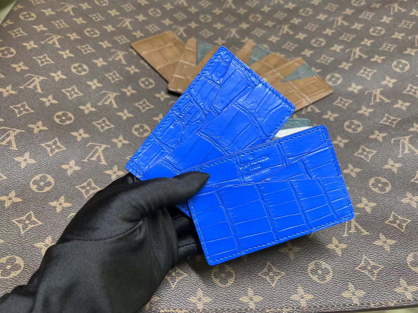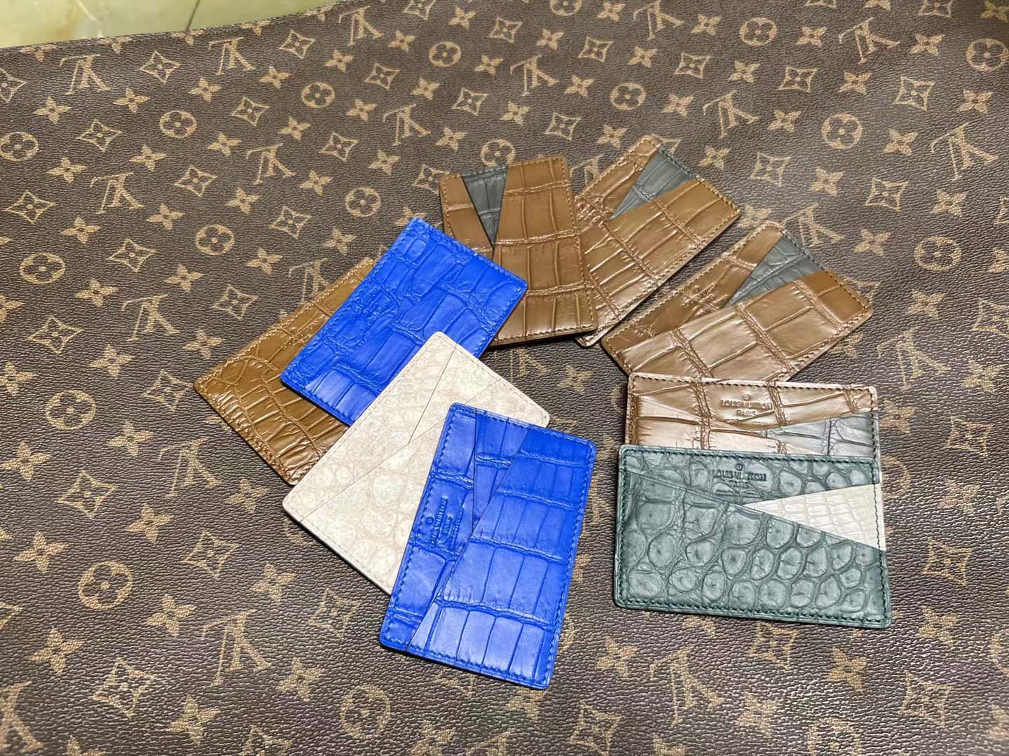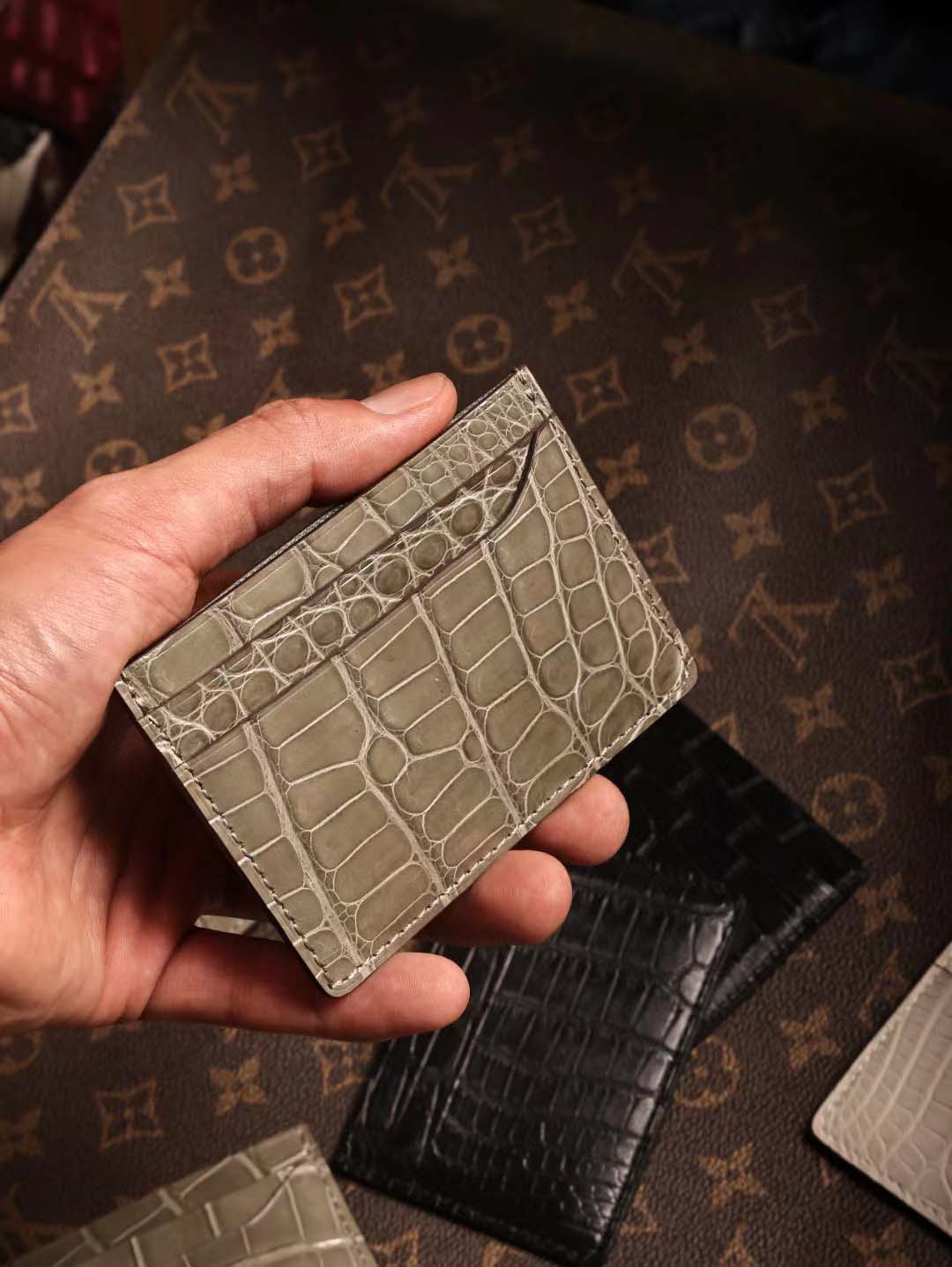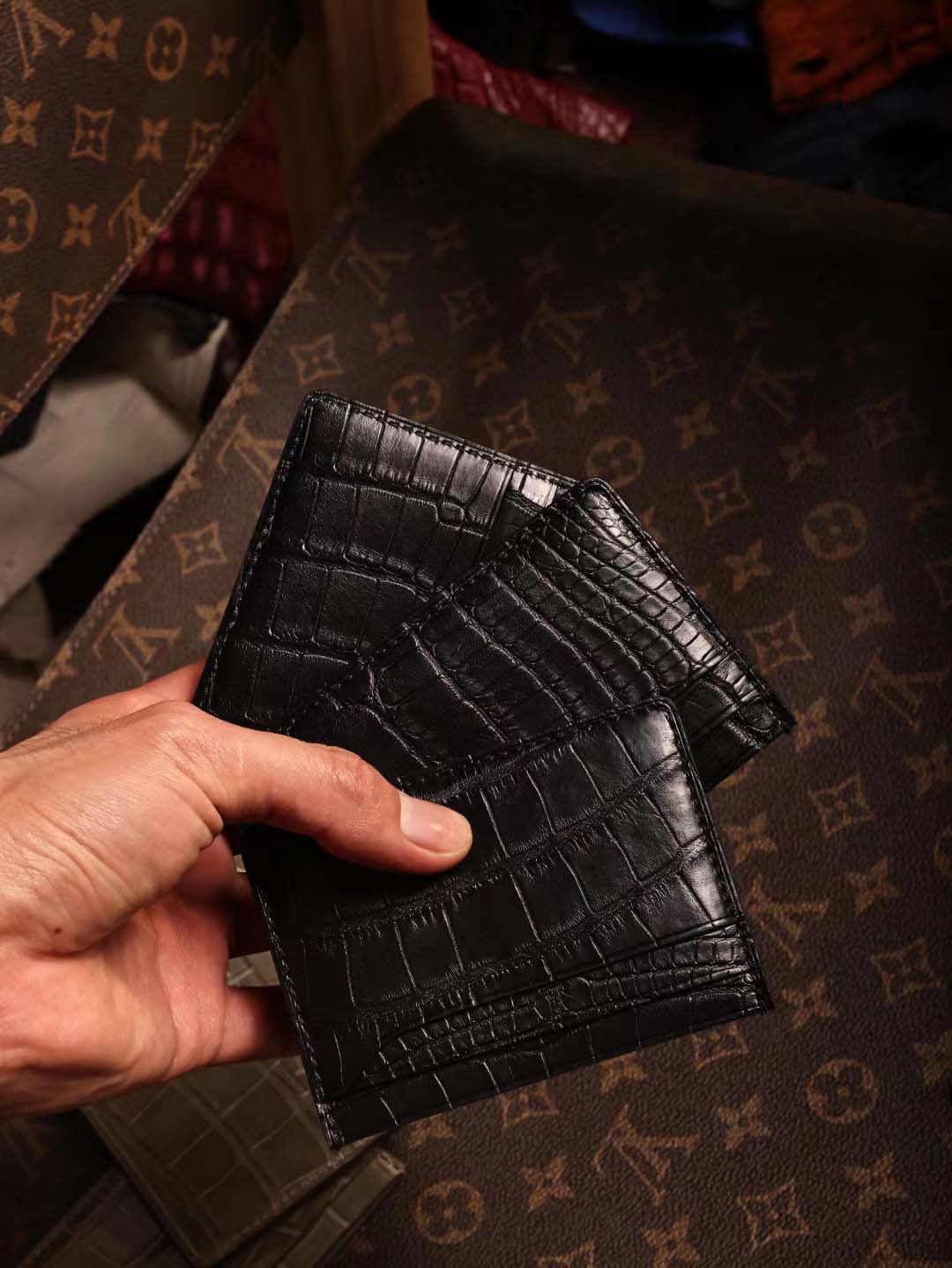 鳄鱼皮卡包算是我们家比较经典的款了 鳄鱼皮双面双卡位,一共四个卡槽, 鳄鱼皮中间夹层也可以收纳小几张卡片呢。