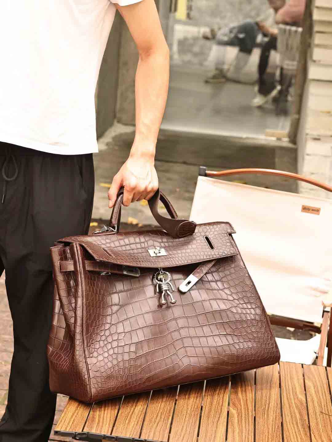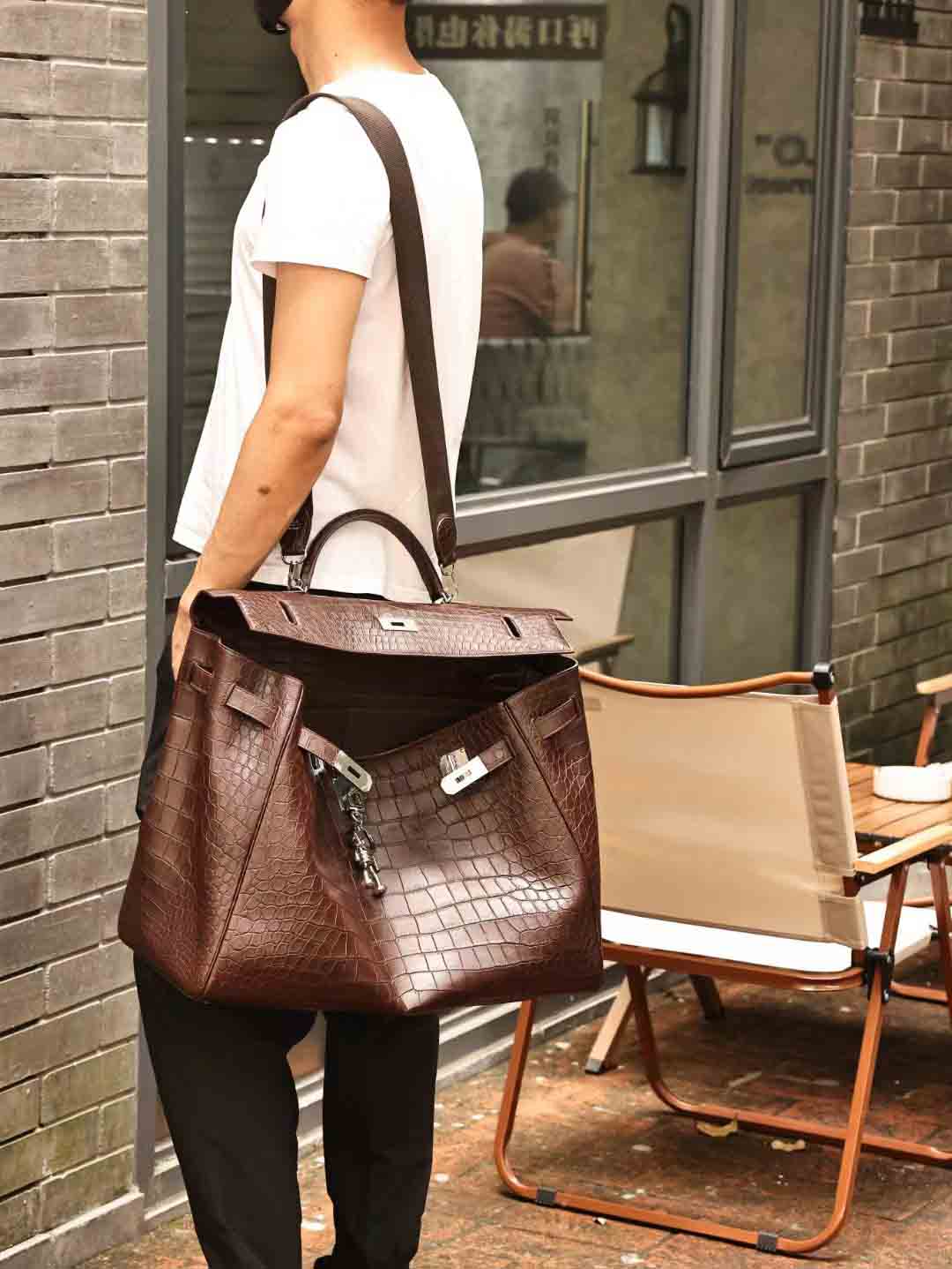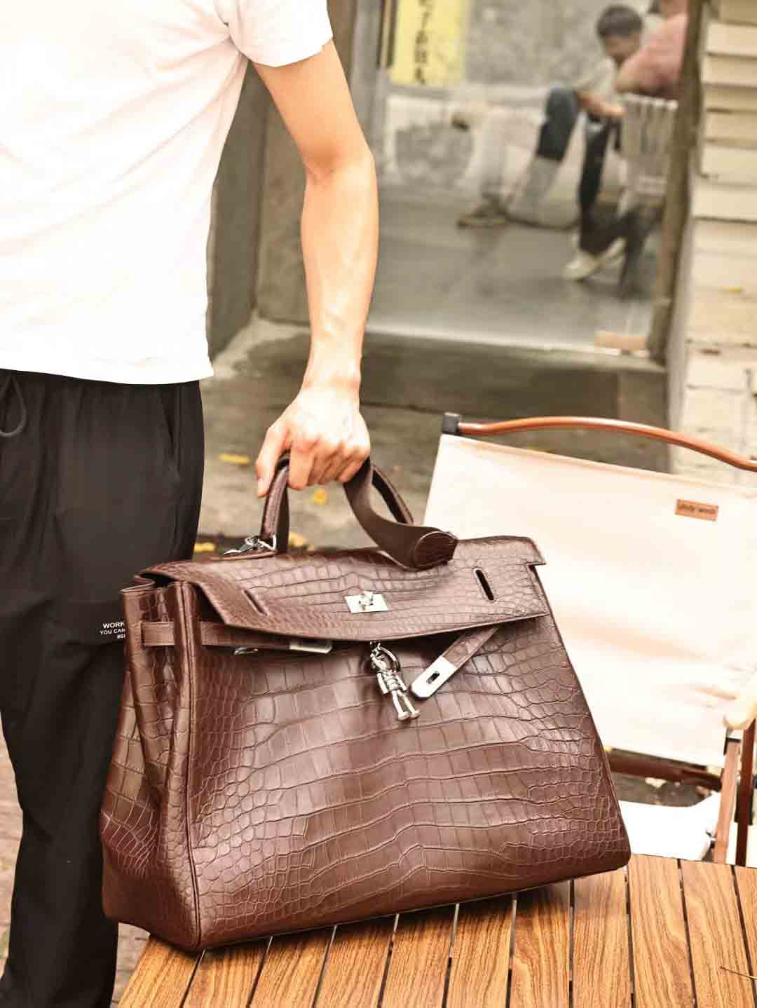 谁来驾驭这款 Kelly50,稀有咖啡色鳄鱼皮,实物拍摄。咖啡色鳄鱼皮大旅行包定制工厂微信联系 95506803