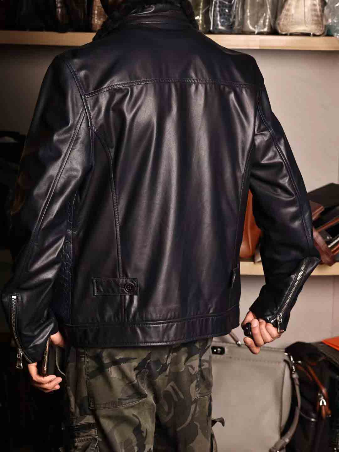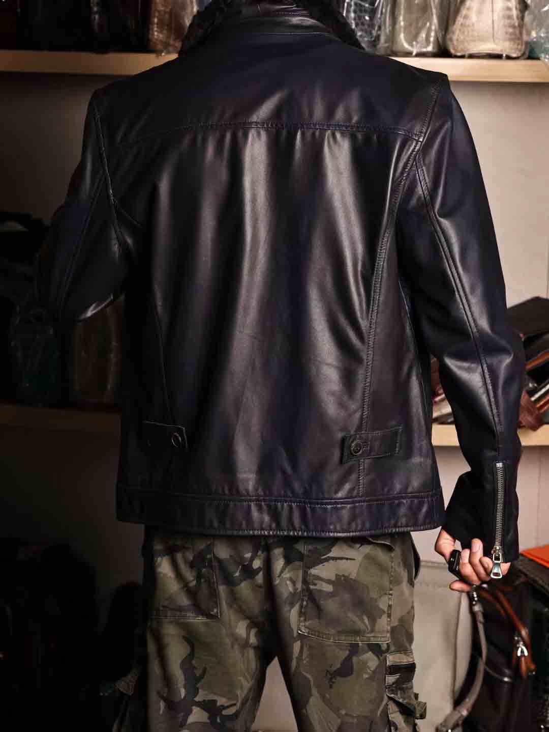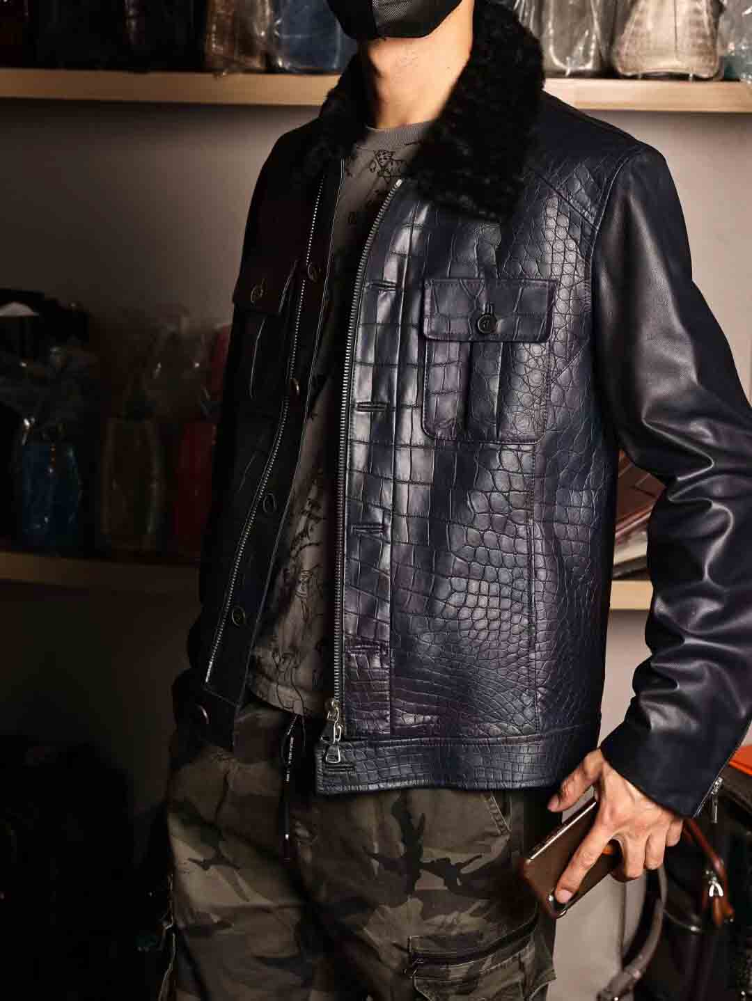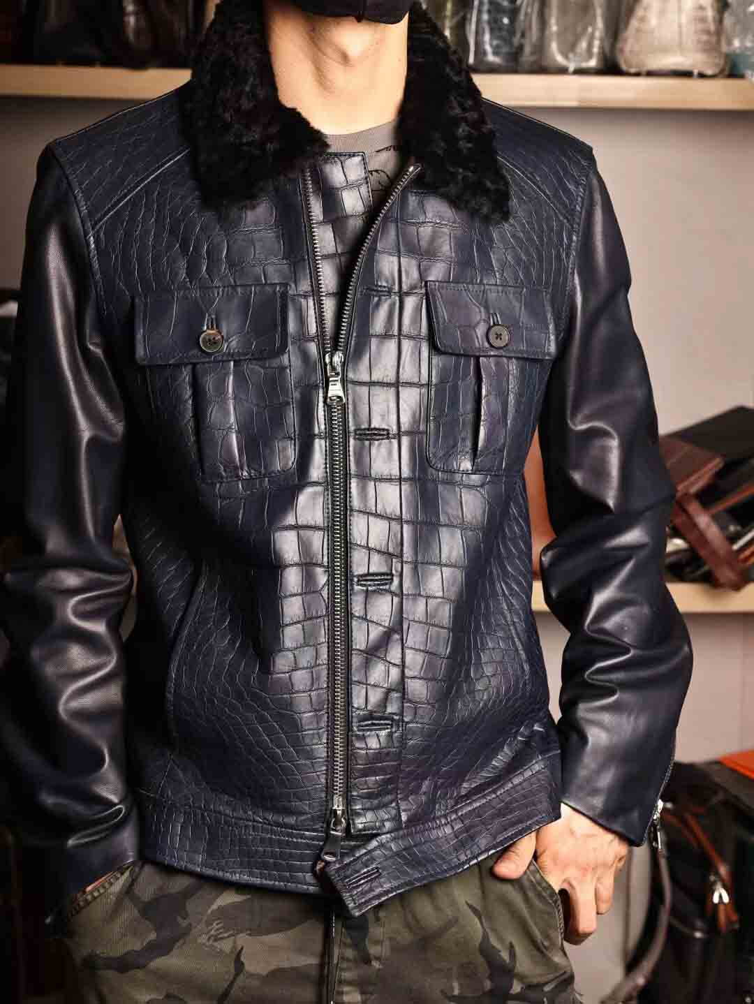 鳄鱼皮兔毛领中山装夹克,深蓝色哑光鳄鱼拼绵羊皮,舒适度一流,50码实拍。个性化定制鳄鱼皮短款皮衣订做厂家微信联系 95506803