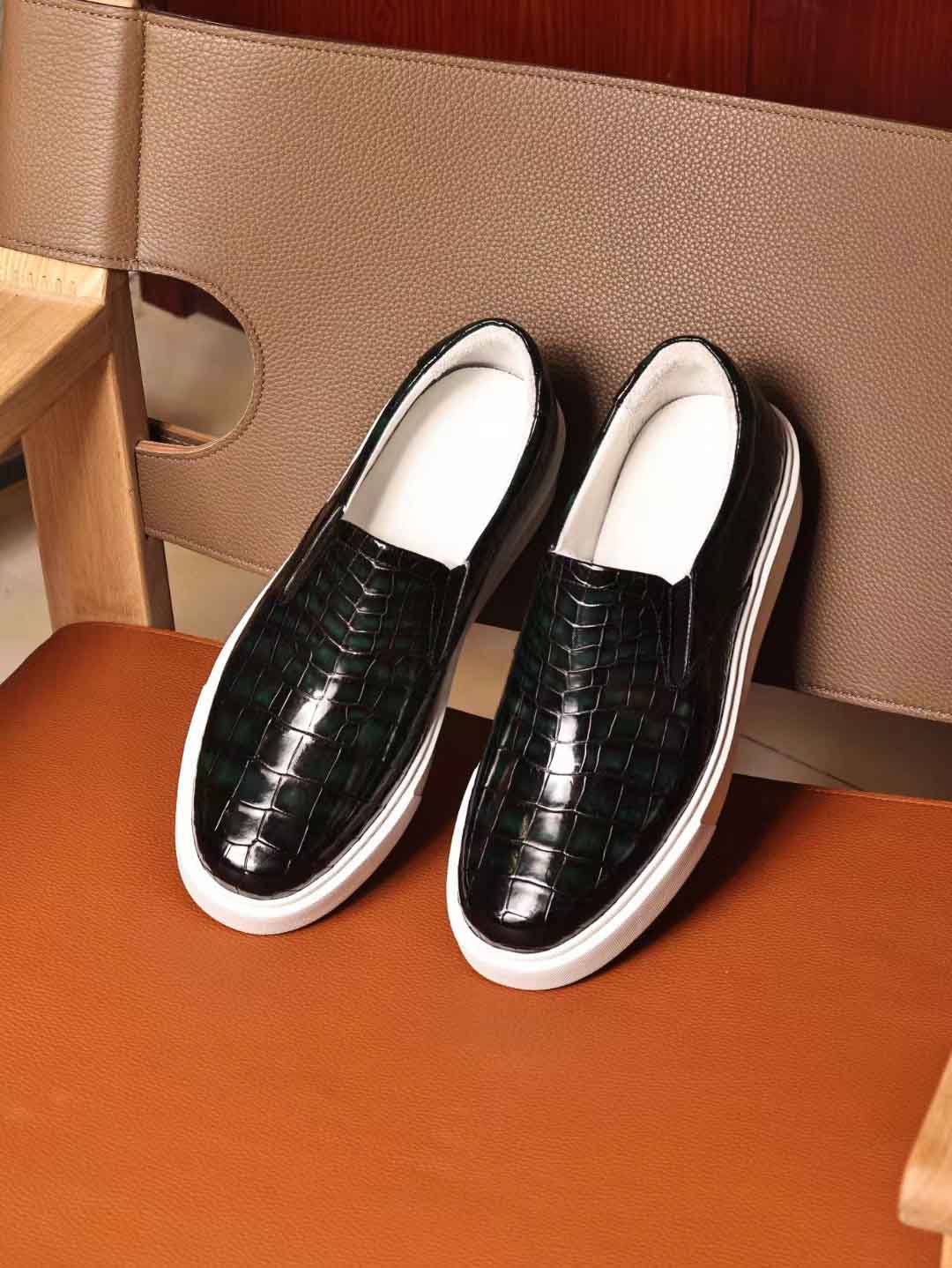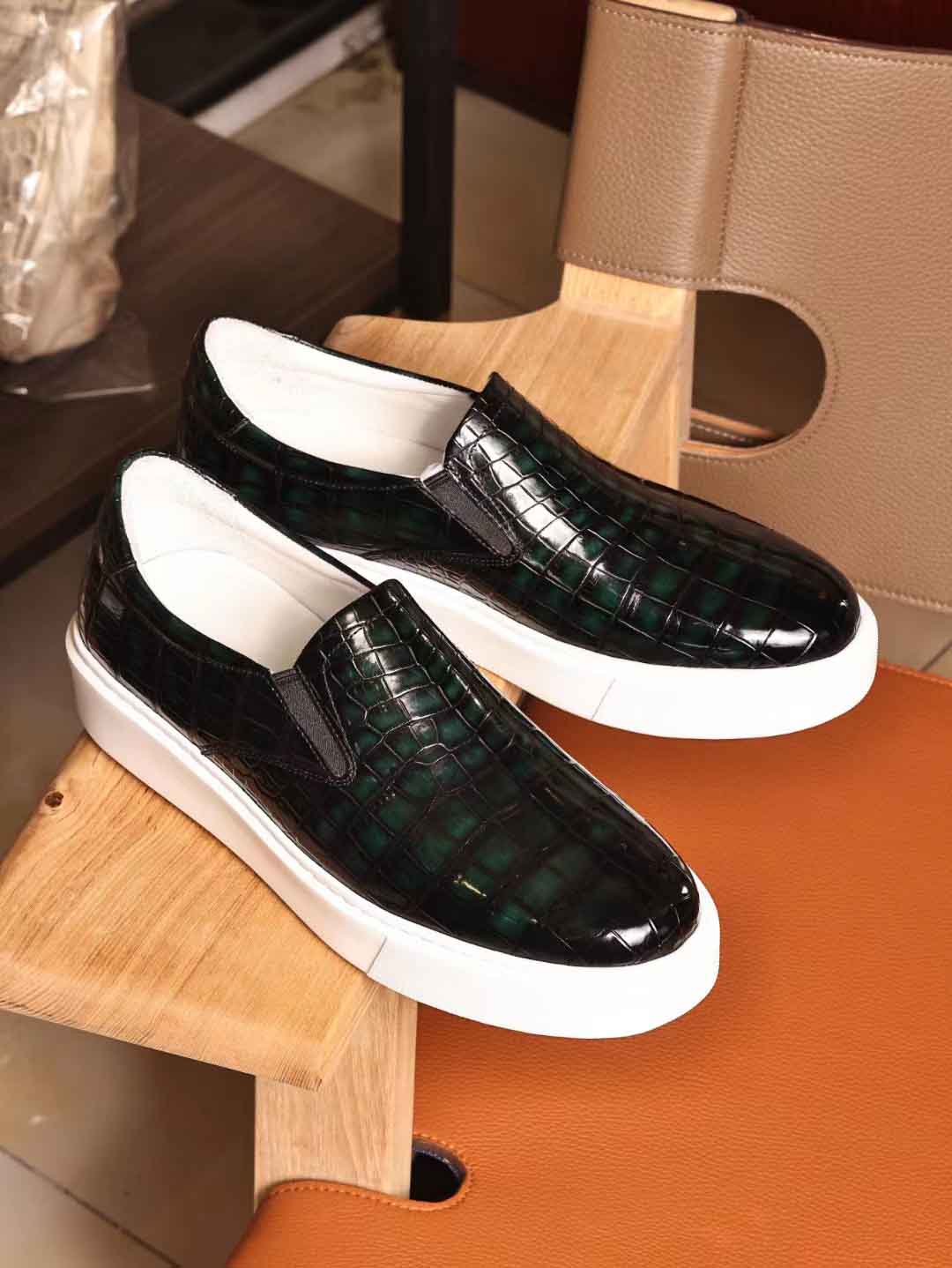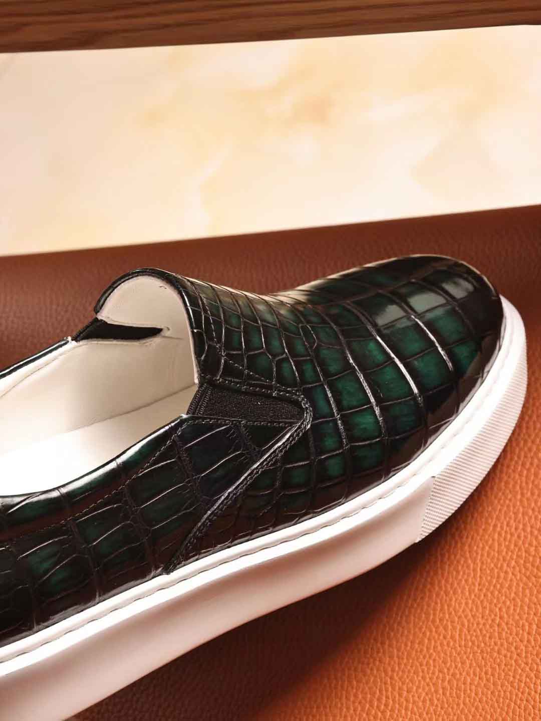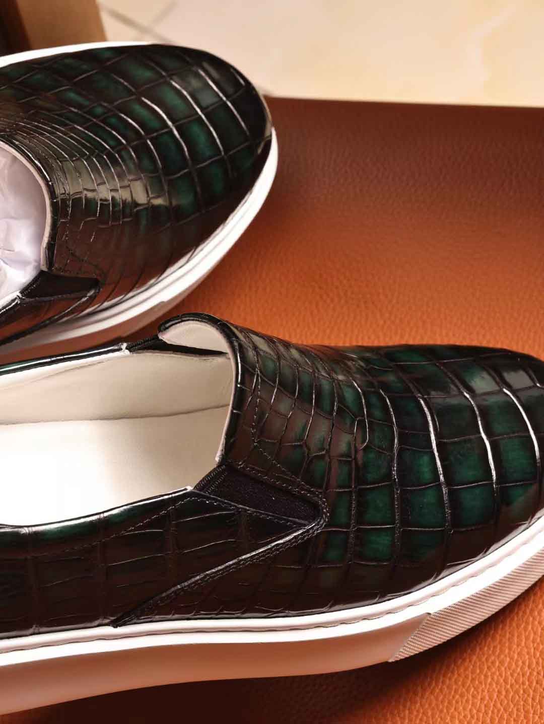 鳄鱼皮绿色皮鞋表面材质会比运动鞋更加高档,因此搭配也可以更显高级感。手工定制 专注提供皮鞋定制服务。半定制是用我们的脚型去套现有的鞋型,那么脚模定制就是完全照着我们的脚做一双只符合个人脚型的鞋。